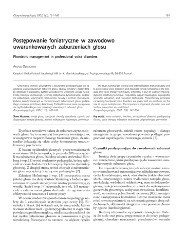 Obrêbowski A.: Postêpowanie Otorynolaryngologia, 2002, 1(3),foniatryczne 161-166 w zawodowo uwarunkowanych zaburzeniach g³osu 161 Postêpowanie foniatr yczne w zawodowo foniatryczne uwarunkowanych zabur zeniach g³osu zaburzeniach Phoniatric management in professional voice disorders ANDRZEJ OBRÊBOWSKI Katedra i Klinika Foniatrii i Audiologii AM im. K. Marcinkowskiego, ul. Przybyszewskiego 49, 60-355 Poznañ Omówiono czynniki wewnêtrzne i zewnêtrzne predysponuj¹ce do zawodowo uwarunkowanych zaburzeñ g³osu, objawy kliniczne i zasady terapii g³osowej w przypadku dysfonii zawodowych. Zwrócono uwagê na potrzebê treningu s³uchowego, technikê oddychania dynamicznego, podparcie oddechowe, uczynnianie rezonatorów nasady i techniki relaksacyjne. Podano zasady fizjoterapii w czynnoœciowych zaburzeniach g³osu, podkreœlaj¹c znaczenie jontoforezy krtaniowej. Podkreœlono znaczenie postêpowania ogólnolekarskiego oraz prewencji zawodowych zaburzeñ g³osu. Otorynolaryngologia, 2002, 1(3), 161-166 The study summarizes internal and external factors that predispose one to professional voice disorders and describes clinical symptoms of the diseases and voice therapy techniques. Emphasis is put on auditory training, dynamic breathing technique, respiratory support (appoggio), supraglottic resonator activation, and relaxation techniques. Physiotherapy principles concerning functional voice disorders are given with an emphasis on the role of larynx iontophoresis. The importance of general physician care and medical prevention are underlined. Otorynolaryngologia, 2002, 1(3), 161-166 S³owa kluczowe: emisja g³osu, nauczyciel, choroby zawodowe, czynniki predysponuj¹ce, terapia g³osowa, techniki relaksacyjne, fizjoterapia, prewencja Key words: voice emission, teachers, occupational diseases, predisposing factors, voice therapy, relaxation techniques, physiotherapy, prevention Dysfonie zawodowe nale¿¹ do zaburzeñ czynnoœciowych g³osu. S¹ to zazwyczaj fonoponozy rozwijaj¹ce siê w nastêpstwie nieprawid³owego tworzenia g³osu, ale nierzadko do³¹czaj¹ siê tak¿e cechy fononeurozy uwarunkowanej psychicznie. Z badañ epidemiologicznych przeprowadzonych w ostatnim 10-leciu wynika, ¿e przesz³o 20% nauczycieli ma zaburzenia g³osu. Podobny odsetek stwierdzali Simberg i wsp. [1] wœród studentów pedagogiki, którzy zg³aszali w czasie badañ dwa lub wiêcej objawów dysfunkcji g³osowej. Z drugiej strony wœród chorych z zaburzeniami g³osu najczêœciej dotycz¹ one pedagogów [2]. Zdaniem Holmberga i wsp. [3] percepcyjna ocena jakoœci g³osu ma du¿¹ wartoœæ kliniczn¹, a badania aparaturowe w sposób statystycznie istotny potwierdzaj¹ jej wyniki. Sapir i wsp. [4] zauwa¿yli, ¿e u ok. 1/3 nauczycieli z zaburzeniami g³osu dochodzi do ograniczenia efektywnoœci nauczania i utraty pracy. W ocenie studentów sposób mówienia pedagoga nale¿y do 3 zasadniczych kryteriów jego oceny [5]. Bistritsky i Frank [6] wykazali te¿, ¿e nauczyciele, którzy w czasie studiów mieli 1 godzinê tygodniowo w ci¹gu roku poœwiêcon¹ problemom g³osu, mieli znacznie rzadziej i nie tak ciê¿kie zaburzenia g³osowe w porównaniu z grup¹ nieszkolon¹. Nauczyciele s¹ nara¿eni na wiêksze ryzyko zaburzeñ g³osowych, ani¿eli reszta populacji i dlatego szczególnie ta grupa zawodowa powinna podlegaæ programowi zapobiegania i wczesnego leczenia [7]. Czynniki predysponuj¹ce do zawodowych zaburzeñ g³osu Istniej¹ dwie grupy czynników ryzyka – wewnêtrzne i zewnêtrzne, które predysponuj¹ do zawodowo uwarunkowanych zaburzeñ g³osu. Do czynników wewnêtrznych zaliczyæ mo¿na: zmiany w oœrodkowym i autonomicznym uk³adzie nerwowym, cechy konstytucyjne, wiek, stan s³uchu (tak¿e obecnoœæ s³uchu muzycznego), zakres wydolnoœci narz¹du g³osu, artykulacjê, wydolnoœæ oddechow¹, stan endokrynologiczny, reakcje emocjonalne, stosunek do wykonywanego zawodu g³osowego, cechy osobowoœciowe, konfliktowoœæ, wzmo¿on¹ pobudliwoœæ nerwow¹ [8,9], umiejêtnoœæ nawi¹zywania kontaktów. Istotne znaczenie mo¿e mieæ równie¿ podatnoœæ na schorzenia górnych dróg oddechowych, sk³onnoœci alergiczne oraz powa¿ne choroby ogólne (kardiologiczne). Bardziej ró¿norodne s¹ czynniki zewnêtrzne. Nale¿¹ do nich: sta¿ pracy, przygotowanie do pracy pedagogicznej, charakter nauczanych przedmiotów, warunki Otorynolaryngologia, 2002, 1(3), 161-166 162 pracy, stosunki miêdzyludzkie w zak³adzie pracy, organizacja nauczania oraz nawyki. Badania Smith i wsp. [10] wykaza³y, ¿e nauczyciele p³ci mêskiej wykonuj¹cy tak¹ sam¹ pracê w tym samym czasie co nauczycielki, znacznie rzadziej maj¹ zaburzenia g³osu. Mo¿e to byæ uwarunkowane obni¿onym poziomem kwasu hialuronowego w b³onie œluzowej fa³du g³osowego kobiet [11,12]. Obraz kliniczny Obraz kliniczny dysfonii zawodowych charakteryzuje siê bogat¹ symptomatologi¹, w której dominuj¹ objawy zmêczenia g³osowego i zaburzenia o charakterze hyperfunkcjonalnym. Charakterystyczne s¹ równie¿ rozmaicie okreœlane parestezje gard³owo-krtaniowe, które czêsto w wywiadach wysuwane s¹ na plan pierwszy. Stan kliniczny dodatkowo pogarszaæ mog¹ wtórne zmiany organiczne: obrzêki, guzki g³osowe, polipy, owrzodzenie kontaktowe, niewydolnoœæ fonacyjna fa³dów g³osowych [9,13]. Objawy dysfonii zawodowych czasami s¹ niewielkie i w takich przypadkach trudno jest odró¿niæ te zaburzenia od g³osu normalnego. Tym bardziej, ¿e ju¿ sama ocena s³uchowa g³osu normalnego, czyli eufonicznego, jest trudna ze wzglêdu na znaczny jej subiektywizm [14,15,16]. Zmianom organicznym w obrêbie g³oœni zawsze towarzyszy komponent czynnoœciowy. Zazwyczaj jest on uwarunkowany prób¹ reaktywnej kompensacji z nastêpow¹ dekompensacj¹ na skutek zaburzeñ w napiêciu miêœniowym [17]. Leczenie zawodowo uwarunkowanych zaburzeñ g³osu Mo¿liwoœci leczenia zawodowo uwarunkowanych zaburzeñ g³osu s¹ szerokie i obejmuj¹: postêpowanie