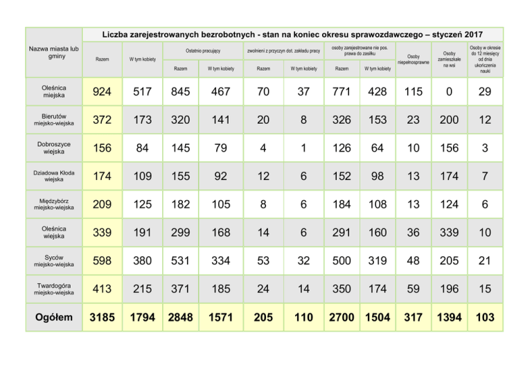 Liczba zarejestrowanych bezrobotnych - stan na koniec okresu sprawozdawczego – styczeń 2017 Nazwa miasta lub gminy Ostatnio pracujący Razem zwolnieni z przyczyn dot. zakładu pracy osoby zarejestrowane nie pos. prawa do zasiłku W tym kobiety Razem W tym kobiety Razem W tym kobiety Razem W tym kobiety Osoby niepełnosprawne Osoby zamieszkałe na wsi Osoby w okresie do 12 miesięcy od dnia ukończenia nauki Oleśnica miejska 924 517 845 467 70 37 771 428 115 0 29 Bierutów miejsko-wiejska 372 173 320 141 20 8 326 153 23 200 12 Dobroszyce wiejska 156 84 145 79 4 1 126 64 10 156 3 Dziadowa Kłoda wiejska 174 109 155 92 12 6 152 98 13 174 7 Międzybórz miejsko-wiejska 209 125 182 105 8 6 184 108 13 124 6 Oleśnica wiejska 339 191 299 168 14 6 291 160 36 339 10 Syców 598 380 531 334 53 32 500 319 48 205 21 miejsko-wiejska 413 215 371 185 24 14 350 174 59 196 15 Ogółem 3185 1794 2848 1571 205 110 2700 1504 317 1394 103 miejsko-wiejska Twardogóra