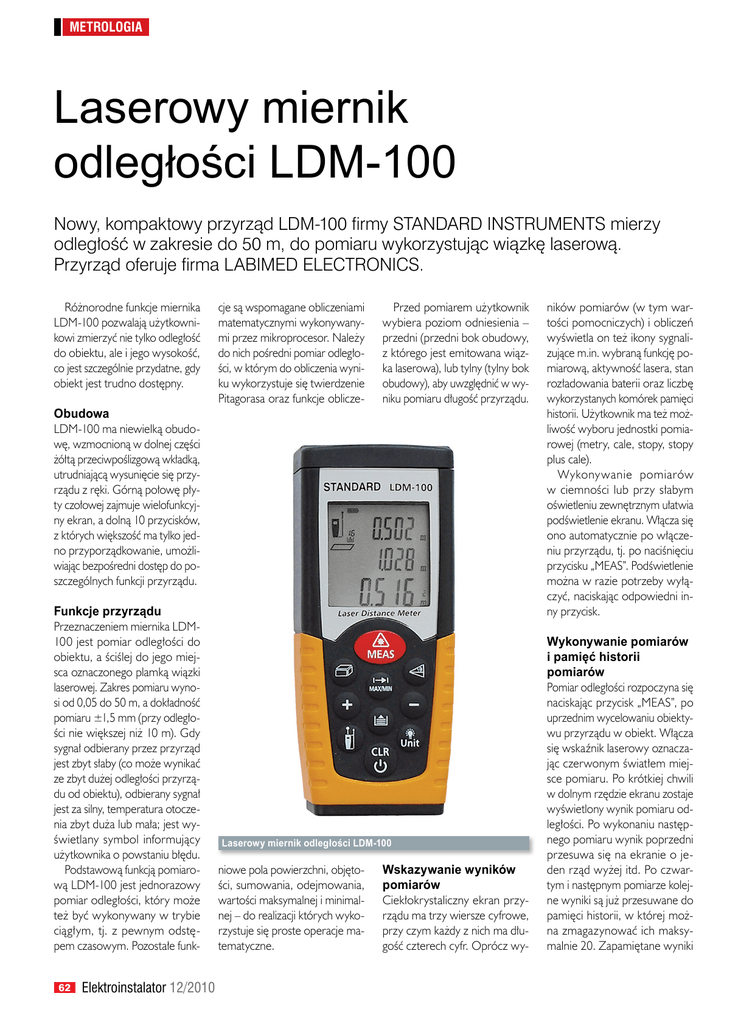 Metrologia Laserowy miernik odległości LDM-100 Nowy, kompaktowy przyrząd LDM-100 firmy STANDARD INSTRUMENTS mierzy odległość w zakresie do 50 m, do pomiaru wykorzystując wiązkę laserową. Przyrząd oferuje firma LABIMED ELECTRONICS. Różnorodne funkcje miernika LDM-100 pozwalają użytkownikowi zmierzyć nie tylko odległość do obiektu, ale i jego wysokość, co jest szczególnie przydatne, gdy obiekt jest trudno dostępny. Obudowa LDM-100 ma niewielką obudowę, wzmocnioną w dolnej części żółtą przeciwpoślizgową wkładką, utrudniającą wysunięcie się przyrządu z ręki. Górną połowę płyty czołowej zajmuje wielofunkcyjny ekran, a dolną 10 przycisków, z których większość ma tylko jedno przyporządkowanie, umożliwiając bezpośredni dostęp do poszczególnych funkcji przyrządu. Funkcje przyrządu Przeznaczeniem miernika LDM100 jest pomiar odległości do obiektu, a ściślej do jego miejsca oznaczonego plamką wiązki laserowej. Zakres pomiaru wynosi od 0,05 do 50 m, a dokładność pomiaru ±1,5 mm (przy odległości nie większej niż 10 m). Gdy sygnał odbierany przez przyrząd jest zbyt słaby (co może wynikać ze zbyt dużej odległości przyrządu od obiektu), odbierany sygnał jest za silny, temperatura otoczenia zbyt duża lub mała; jest wyświetlany symbol informujący użytkownika o powstaniu błędu. Podstawową funkcją pomiarową LDM-100 jest jednorazowy pomiar odległości, który może też być wykonywany w trybie ciągłym, tj. z pewnym odstępem czasowym. Pozostałe funk62 Elektroinstalator 12/2010 cje są wspomagane obliczeniami matematycznymi wykonywanymi przez mikroprocesor. Należy do nich pośredni pomiar odległości, w którym do obliczenia wyniku wykorzystuje się twierdzenie Pitagorasa oraz funkcje oblicze- Przed pomiarem użytkownik wybiera poziom odniesienia – przedni (przedni bok obudowy, z którego jest emitowana wiązka laserowa), lub tylny (tylny bok obudowy), aby uwzględnić w wyniku pomiaru długość przyrządu. Laserowy miernik odległości LDM-100 niowe pola powierzchni, objętości, sumowania, odejmowania, wartości maksymalnej i minimalnej – do realizacji których wykorzystuje się proste operacje matematyczne. Wskazywanie wyników pomiarów Ciekłokrystaliczny ekran przyrządu ma trzy wiersze cyfrowe, przy czym każdy z nich ma długość czterech cyfr. Oprócz wy- ników pomiarów (w tym wartości pomocniczych) i obliczeń wyświetla on też ikony sygnalizujące m.in. wybraną funkcję pomiarową, aktywność lasera, stan rozładowania baterii oraz liczbę wykorzystanych komórek pamięci historii. Użytkownik ma też możliwość wyboru jednostki pomiarowej (metry, cale, stopy, stopy plus cale). Wykonywanie pomiarów w ciemności lub przy słabym oświetleniu zewnętrznym ułatwia podświetlenie ekranu. Włącza się ono automatycznie po włączeniu przyrządu, tj. po naciśnięciu przycisku „MEAS”. Podświetlenie można w razie potrzeby wyłączyć, naciskając odpowiedni inny przycisk. Wykonywanie pomiarów i pamięć historii pomiarów Pomiar odległości rozpoczyna się naciskając przycisk „MEAS”, po uprzednim wycelowaniu obiektywu przyrządu w obiekt. Włącza się wskaźnik laserowy oznaczając czerwonym światłem miejsce pomiaru. Po krótkiej chwili w dolnym rzędzie ekranu zostaje wyświetlony wynik pomiaru odległości. Po wykonaniu następnego pomiaru wynik poprzedni przesuwa się na ekranie o jeden rząd wyżej itd. Po czwartym i następnym pomiarze kolejne wyniki są już przesuwane do pamięci historii, w której można zmagazynować ich maksymalnie 20. Zapamiętane wyniki można następnie przeglądać naciskając kolejno specjalny przycisk lub skasować całą zawartość pamięci naciśnięciem przycisku „CLEAR”. Pamięć przyrządu jest ulotna, stąd też jest kasowana automatycznie w momencie wyłączenia zasilania przyrządu. Pomiar jednorazowy i ciągły Oprócz podstawowego pomiaru odległości wykonywanego jednorazowo, użytkownik może włączyć pomiar ciągły (tzw. śledzenie). Pomiar tego typu pozwala na zwiększenie dokładności pomiaru przez wybranie z grupy wyników wartości minimalnej lub maksymalnej, zależnie od warunków pomiaru (pomiar odległości od powierzchni płaskiej lub narożnika). W trybie tym przekręca się np. przyrząd dookoła osi, a wynik pomiaru wyświetlany w dolnym rzędzie ekranu jest odświeżany co 0,5 s. Jednocześnie w dwóch pozostałych rzędach ekranu są wyświetlane wartości maksymalna i minimalna, również odświeżane, w momencie pojawienia się nowej takiej wartości. Funkcja pomiaru ciągłego wyłącza się automatycznie po wykonaniu 100 pomiarów. Funkcje matematyczne Użytkownik LDM-100 może w razie potrzeby włączyć funkcję matematyczną: dodawanie (wynik bieżącego pomiaru jest dodawany do poprzedniego), odejmowanie (wynik bieżącego pomiaru jest odejmowany od poprzedniego), pole powierzchni (po wykonaniu dwóch kolejnych pomiarów jest automatycznie wyświetlany wynik iloczynu otrzymanych wyników) lub objętość (jest wyświetlana wartość iloczynu trzech otrzymanych wyników). W trybach dodawania, odejmowania i obliczania pola powierzchni wszystkie wyniki pomocnicze są wyświetlane jednocześnie z wynikiem końcowym, a w trybie obliczania objętości nie jest wyświetlany trzeci, ostatni wynik pomocniczy. Jeszcze inną funkcją matematyczną realizowaną przez LDM100 jest pośredni pomiar odległości. Użytkownik może wybrać dowolny z dwóch trybów, w których wynik końcowy uzyskuje się po otrzymaniu dwóch i odpowiednio trzech wyników pomocniczych. Funkcję pomiaru pośredniego można wykorzystać do pomiaru wysokości obiektu np. drzwi. W pierwszym trybie funkcji pomiaru pośredniego pomiar przeprowadza się w dwóch etapach. W pierwszym etapie wiązkę laserową kieruje się na punkt szczytowy obiektu. W tym przypadku przyrząd jest umieszczony na podłodze skierowany obiektywem do góry. Pie