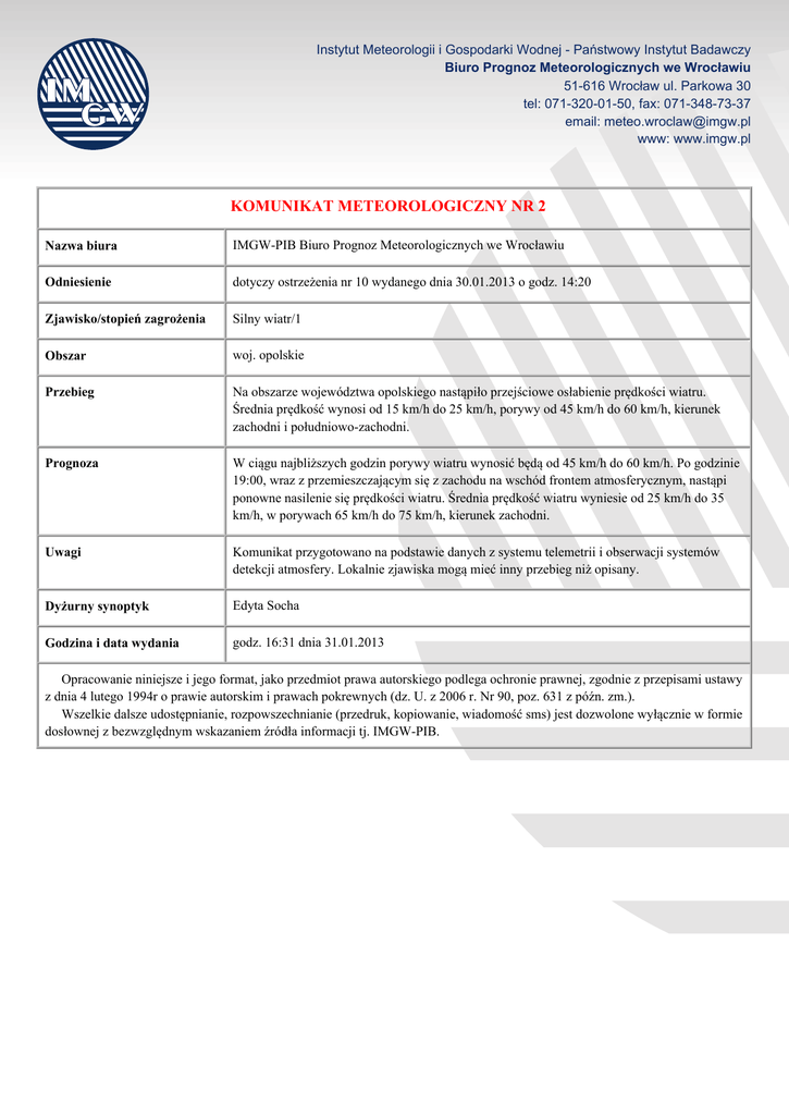 Instytut Meteorologii i Gospodarki Wodnej - Państwowy Instytut Badawczy Biuro Prognoz Meteorologicznych we Wrocławiu 51-616 Wrocław ul. Parkowa 30 tel: 071-320-01-50, fax: 071-348-73-37 email: [email protected] www: www.imgw.pl KOMUNIKAT METEOROLOGICZNY NR 2 Nazwa biura IMGW-PIB Biuro Prognoz Meteorologicznych we Wrocławiu Odniesienie dotyczy ostrzeżenia nr 10 wydanego dnia 30.01.2013 o godz. 14:20 Zjawisko/stopień zagrożenia Silny wiatr/1 Obszar woj. opolskie Przebieg Na obszarze województwa opolskiego nastąpiło przejściowe osłabienie prędkości wiatru. Średnia prędkość wynosi od 15 km/h do 25 km/h, porywy od 45 km/h do 60 km/h, kierunek zachodni i południowo-zachodni. Prognoza W ciągu najbliższych godzin porywy wiatru wynosić będą od 45 km/h do 60 km/h. Po godzinie 19:00, wraz z przemieszczającym się z zachodu na wschód frontem atmosferycznym, nastąpi ponowne nasilenie się prędkości wiatru. Średnia prędkość wiatru wyniesie od 25 km/h do 35 km/h, w porywach 65 km/h do 75 km/h, kierunek zachodni. Uwagi Komunikat przygotowano na podstawie danych z systemu telemetrii i obserwacji systemów detekcji atmosfery. Lokalnie zjawiska mogą mieć inny przebieg niż opisany. Dyżurny synoptyk Edyta Socha Godzina i data wydania godz. 16:31 dnia 31.01.2013 Opracowanie niniejsze i jego format, jako przedmiot prawa autorskiego podlega ochronie prawnej, zgodnie z przepisami ustawy z dnia 4 lutego 1994r o prawie autorskim i prawach pokrewnych (dz. U. z 2006 r. Nr 90, poz. 631 z późn. zm.). Wszelkie dalsze udostępnianie, rozpowszechnianie (przedruk, kopiowanie, wiadomość sms) jest dozwolone wyłącznie w formie dosłownej z bezwzględnym wskazaniem źródła informacji tj. IMGW-PIB.
