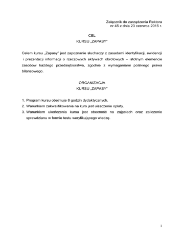 Załącznik do zarządzenia Rektora nr 45 z dnia 23 czerwca 2015 r. CEL KURSU „ZAPASY” Celem kursu „Zapasy” jest zapoznanie słuchaczy z zasadami identyfikacji, ewidencji i prezentacji informacji o rzeczowych aktywach obrotowych − istotnym elemencie zasobów każdego przedsiębiorstwa, zgodnie z wymaganiami polskiego prawa bilansowego. ORGANIZACJA KURSU „ZAPASY” 1. Program kursu obejmuje 8 godzin dydaktycznych. 2. Warunkiem zakwalifikowania na kurs jest uiszczenie opłaty. 3. Warunkiem ukończenia kursu jest obecność na zajęciach oraz zaliczenie sprawdzianu w formie testu weryfikującego wiedzę. 1 PROGRAM KURSU „ZAPASY” 1. Identyfikacja zapasów jako ważnego elementu . 2. Zasady organizacji gospodarki zapasami w podmiocie. 3. Zasady wyceny i ujęcia w księgach rzeczowych aktywów obrotowych pozyskiwanych na zewnątrz przedsiębiorstwa tj. materiałów i towarów. 4. Zasady wyceny i ujęcia w księgach zapasów wytwarzanych w przedsiębiorstwie, tj. materiałów gotowych. 5. Ustalanie wartości rozchodu zapasów. 6. Wpływ metody rozchodu zapasów na wynik finansowy podmiotu. 7. Utrata wartości zapasów według polskiego prawa bilansowego. 8. Zaliczki na dostawy jako specyficzna kategoria zapasów. 9. Zasady inwentaryzacji rzeczowych składników majątku obrotowego. 10. Wybrane elementy zarządzania zapasami w przedsiębiorstwie (koszty utrzymania zapasów), optymalizacja stanu zapasów materiałowych. Ogółem liczba godzin: 8 2