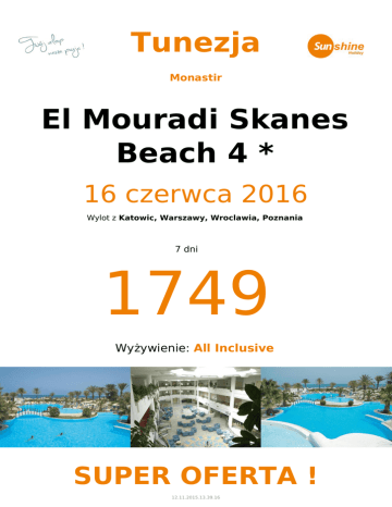 Tunezja Monastir El Mouradi Skanes Beach 4 * 16 czerwca 2016 Wylot z Katowic, Warszawy, Wroclawia, Poznania 7 dni 1749 Wyżywienie: All Inclusive SUPER OFERTA ! 12.11.2015.13.39.16 Powered by TCPDF (www.tcpdf.org)
