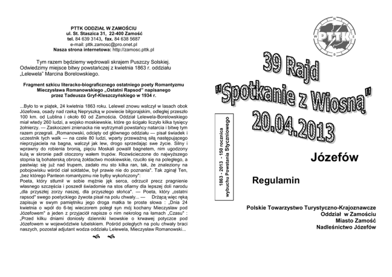 PTTK ODDZIAŁ W ZAMOŚCIU ul. St. Staszica 31, 22-400 Zamość tel. 84 639 3143, fax. 84 638 5687 e-mail: [email protected] Nasza strona internetowa: http://zamosc.pttk.pl Tym razem będziemy wędrowali skrajem Puszczy Solskiej. Odwiedzimy miejsce bitwy powstańczej z kwietnia 1863 r. oddziału „Lelewela” Marcina Borelowskiego. ...Było to w piątek, 24 kwietnia 1863 roku. Lelewel znowu walczył w lasach obok Józefowa, osady nad rzeką Nepryszką w powiecie biłgorajskim, odległej przeszło 100 km. od Lublina i około 60 od Zamościa. Oddział Lelewela-Borelowskiego miał wtedy 260 ludzi, a wojsko moskiewskie, które go ścigało liczyło kilka tysięcy żołnierzy. — Zaskoczeni znienacka nie wytrzymali powstańcy natarcia i bitwę tym razem przegrali. „Romanowski, odcięty od głównego oddziału — pisał świadek i uczestnik tych walk — na czele 80 ludzi, wparty przeważną siłą następującego nieprzyjaciela na bagna, walczył jak lew, drogo sprzedając swe życie. Silny i wprawny do robienia bronią, pięciu Moskali powalił bagnetem, nim ugodzony kulą w skronie padł otoczony wałem trupów. Rozwścieczone do najwyższego stopnia tą bohaterską obroną żołdactwo moskiewskie, rzuciło się na poległego, a pastwiąc się już nad trupem, zadało mu sto kilka ran, tak, że znaleziony na pobojowisku wśród ciał sołdatów, był prawie nie do poznania". Tak zginął Ten, „bez którego Panteon romantyzmu nie byłby wykończony": Poeta, który stłumił w sobie mężnie jęk serca, odrzucił precz pragnienie własnego szczęścia i poszedł świadomie na stos ofiarny dla lepszej doli narodu „dla przyszłej zorzy naszej, dla przyszłego słońca". — Poeta, który „ostatni rapsod" swego poetyckiego żywota pisał na polu chwały... — Drżącą więc ręką zapisuje w swym pamiętniku jego droga matka te proste słowa : „Dnia 24 kwietnia o wpół do 6-tej wieczorem poległ syn mój kochany Mieczysław pod Józefowem" a jeden z przyjaciół napisze o nim nekrolog na łamach „Czasu" : „Przed kilku dniami doniosły dzienniki lwowskie o krwawej potyczce pod Józefowem w województwie lubelskiem. Pośród poległych na polu chwały braci naszych, pozostał adjutant wodza oddziału Lelewela, Mieczysław Romanowski... 1863 - 2013 - 150 rocznica wybuchu Powstania Styczniowego Fragment szkicu literacko-biograficznego ostatniego poety Romantyzmu Mieczysława Romanowskiego „Ostatni Rapsod” napisanego przez Tadeusza Gryf-Kleszczyńskiego w 1934 r. Józefów Regulamin Polskie Towarzystwo Turystyczno-Krajoznawcze Oddział w Zamościu Miasto Zamość Nadleśnictwo Józefów Organizator: PTTK O/Zamość - Komisja Turystyki Pieszej Cele Rajdu: UCZCZENIE 150 ROCZNICY WYBUCHU POWSTANIA STYCZNIOWEGO. Poznawanie historii ojczystej regionu, szlaków turystycznych na Roztoczu i w Puszczy Solskiej, poznanie walorów krajoznawczych, zdobywanie punktów do odznak turystyki kwalifikowanej, popularyzacja odznak krajoznawczych, propagowanie wiedzy ekologicznej, integracja młodych turystów z różnych szkół. Termin i miejsce Rajdu: Rajd odbędzie się w dn. 20 kwietnia 2013 r. (sobota) bez względu na pogodę... Program Rajdu: *** Trasa 1 *** Odjazd autokarów z parkingu przy ul. Partyzantów (PZU) w Zamościu o godz. 8.30, od godz. 9.30 przejście piesze trasą: parking przy zalewie w Józefowie - nad Niepryszką do pomnika powstańców - kamieniołomy Nadleśnictwo – 10 km - prowadzą przodownicy TP Edward Słoniewski i Zbigniew Pietrynko *** Trasa 2 *** Odjazd autokarów z parkingu przy ul. Partyzantów (PZU) w Zamościu o godz. 8.30, od godz. 9.30 przejście piesze trasą: parking pod Tarnowolą - szlakiem krawędziowym - pomnik M. Romanowskiego kamieniołomy - Nadleśnictwo - 10 km - prowadzą: przodownicy TP Janusz Kapecki i Zofia Kapecka Meta Rajdu zlokalizowana będzie w Józefowie (przy Nadleśnictwie, ul. Leśna 46) Warunki uczestnictwa: W Rajdzie uczestniczą drużyny zgłoszone przez szkoły (1 opiekun na 10 uczestników). Opiekunowie uczestniczą w Rajdzie bezpłatnie. Listy zgłoszeń powinni potwierdzić: Dyrektor i Opiekun. Zapraszamy również turystów indywidualnych, młodzież do lat 18 z opiekunami. Obowiązuje kolejność zgłoszeń i wpisowego w terminie. Osoby niezgłoszone (dot. to również kadry) nie mogą brać udziału w Rajdzie. Zapraszamy również turystów indywidualnych na rowerach... Obowiązki uczestników Rajdu: Podporządkowanie się zarządzeniom Kierownictwa Rajdu, przestrzeganie przepisów ppoż., ochrony przyrody i Karty Turysty. Uczestnicy powinni posiadać apteczkę, odpowiedni ubiór stosowny do warunków atmosferycznych oraz kubeczek na napój. Interpretacja regulaminu należy do Kierownictwa Rajdu. Zgłoszenia i opłatę do 12.04.2013 r. przyjmuje: Oddział PTTK w Zamościu ul. Staszica 31, tel. 84 639 31 43 Opłata za organizację rajdu wynosi - 25 zł W ramach wpisowego uczestnicy otrzymują: ubezpieczenie NW, opiekę kadry PTTK, znaczek rajdowy, nagrody w konkursach, przejazd autokarem. W przypadku nie wzięcia udziału w Rajdzie wpisowe nie będzie zwracane. *** Trasa 3 *** Odjazd autokarów z parkingu przy ul. Partyzantów (PZU) w Zamościu o godz. 8.30, od godz. 9.30 przejście piesze trasą: Pomnik M. Romanowskiego - szlakiem ziemi Józefowskiej - gościńcem fryszarkowskim kamieniołomy - Nadleśnictwo - 10 km - prowadzą: przodownik TP Adam Jarosz i przew. Andrzej Dziaduszek Przejścia piesze szlakami turystycznymi po Roztoczu Środkowym, drogami leśnymi, po piasku a być może i po błocie… Ognisko turystyczne zapłonie ok. godz. 12-tej w Józefowie W programie przewidujemy tradycyjne konkursy: krajoznawczy, piosenki turystycznej i zręcznościowy (niespodzianka)… Kierownik Rajdu: PTP Kazimierz Dziok Obsługa mety: PTP Marian Buryło i przew. Małgorzata Sochan-Krupa Przewidywany powrót do Zamościa ok. godz. 15.30 Organizatorzy życzą wszystkim turystom wspaniałych wrażeń z wędrówek po Roztoczu i zaprasza