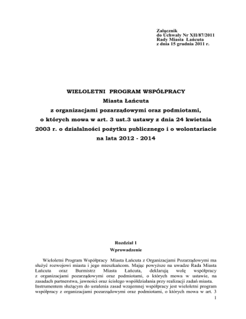 Załącznik do Uchwały Nr XII/87/2011 Rady Miasta Łańcuta z dnia 15 grudnia 2011 r. WIELOLETNI PROGRAM WSPÓŁPRACY Miasta Łańcuta z organizacjami pozarządowymi oraz podmiotami, o których mowa w art. 3 ust.3 ustawy z dnia 24 kwietnia 2003 r. o działalności pożytku publicznego i o wolontariacie na lata 2012 - 2014 Rozdział 1 Wprowadzenie Wieloletni Program Współpracy Miasta Łańcuta z Organizacjami Pozarządowymi ma służyć rozwojowi miasta i jego mieszkańcom. Mając powyższe na uwadze Rada Miasta Łańcuta oraz Burmistrz Miasta Łańcuta, deklarują wolę współpracy z organizacjami pozarządowymi oraz podmiotami, o których mowa w ustawie, na zasadach partnerstwa, jawności oraz ścisłego współdziałania przy realizacji zadań miasta. Instrumentem służącym do ustalenia zasad wzajemnej współpracy jest wieloletni program współpracy z organizacjami pozarządowymi oraz podmiotami, o których mowa w art. 3 1 ust. 3 ustawy. Program ten, stanowi element polityki społeczno-finansowej Miasta Łańcuta, jest wyrazem aktywnej i otwartej polityki Miasta wobec tych organizacji. Program określa cele, zasady oraz formy współpracy Gminy Miasto Łańcut z organizacjami pozarządowymi, jednocześnie wskazuje zakres przedmiotowy współpracy, priorytetowe zadania publiczne oraz zakładaną wysokość środków przeznaczonych na jego realizację. Program określa również tryb powoływania i zasady działania komisji konkursowych powoływanych do opiniowania ofert w otwartym konkursie ofert. Program stworzono we współpracy z organizacjami pozarządowymi w ramach konsultacji społecznych z uwzględnieniem doświadczeń wynikających z dotychczasowej współpracy z organizacjami pozarządowymi z terenu miasta Łańcuta. Rozdział 2 Informacje ogólne § 1. Ilekroć w uchwale jest mowa : 1) ustawie – należy przez to rozumieć ustawę z dnia 24 kwietnia 2003 r. o działalności pożytku publicznego i wolontariacie (Dz. U. Nr 96, poz. 873 z późn. zm.), 2) organizacjach pozarządowych – należy przez to rozumieć niebędące jednostkami sektora finansów publicznych, w rozumieniu przepisów o finansach publicznych, i niedziałające w celu osiągnięcia zysku, osoby prawne lub jednostki nieposiadające osobowości prawnej którym odrębna ustawa przyznaje zdolność prawną, w tym fundacje i stowarzyszenia, z zastrzeżeniem ust. 4, 3) programie – należy przez to rozumieć „ Wieloletni Program Współpracy Miasta Łańcuta z organizacjami pozarządowymi oraz podmiotami, o których mowa w art. 3 ust. 3 ustawy z dnia 24 kwietnia 2003 r. o działalności pożytku publicznego i wolontariacie na lata 2012 - 2014”, 4) konkursie – należy przez to rozumieć otwarty konkurs ofert, o którym mowa w art. 13 ustawy, 5) dotacji - należy przez to rozumieć dotacje w rozumieniu art. 127 ust. 1 pkt 1 lit. e oraz art. 221 ustawy z dnia 27 sierpnia 2009 r. o finansach publicznych (Dz. U. Nr 157, poz. 1240), 6) Mieście – należy przez to rozumieć Miasto Łańcut, 7) Burmistrzu – należy przez to rozumieć Burmistrza Miasta Łańcuta. Rozdział 3 Cele główne i cele szczegółowe programu § 2. Celem współpracy Miasta Łańcuta z organizacjami jest wspieranie rozwoju społeczeństwa obywatelskiego i budowanie partnerskich relacji między samorządem, a zorganizowanymi grupami mieszkańców oraz zdynamizowanie działań w sferze zadań publicznych, podniesienie ich skuteczności i efektywności przy realizacji celów Strategii Rozwoju Miasta Łańcuta. Efektywne wykorzystanie istniejącej społecznej aktywności oraz pobudzenie nowych inicjatyw i aktywności społecznej w zaspakajaniu potrzeb mieszkańców miasta Łańcuta. 2 § 3. Cele szczegółowe programu to: 1) umacnianie w świadomości społecznej poczucia odpowiedzialności za lokalną wspólnotę oraz jej tradycję, 2) wykorzystanie możliwości podmiotów prowadzących działalność pożytku publicznego, jako uzupełnienie działań miasta w zakresie nie obejmowanym przez struktury samorządowe, 3) poprawę jakości usług publicznych i zapewnienie ich efektywniejszego wykonania, 4) integracja środowiska organizacji pozarządowych i innych podmiotów, 5) wzmacnianie merytoryczne i instytucjonalne organizacji, 6) rozwój wolontariatu. 1) 2) 3) 4) 5) 6) 7) 8) § 4. Cele, o którym mowa w ust. 1 i 2 realizowane będą w szczególności poprzez: określenie kierunków realizacji zadań publicznych, wykorzystanie potencjału organizacji pozarządowych i podmiotów, o których mowa w art. 3 ust. 3 ustawy, zwiększenie ilości świadczonych usług publicznych oraz podniesienie ich standardu, obniżenie kosztów realizacji zadań publicznych w wyniku wykorzystania bezpłatnej pracy wolontariuszy, odciążenie sektora publicznego w realizacji niektórych zadań, aktywizację społeczności lokalnej, zabezpieczenie w budżecie miasta środków na wykonanie zadań zleconych podmiotom programu, równy dostęp do informacji oraz wzajemne informowanie się o planowanych kierunkach działalności i współdziałaniu w celu ich zharmonizowania tych kierunków. Rozdział 4 Zasady współpracy § 5. Współpraca Gminy Miasto Łańcut z organizacjami pozarządowymi oraz innymi podmiotami odbywać się będzie na zasadach pomocniczości, suwerenności stron, partnerstwa, efektywności, uczciwej konkurencji, jawności, praworządności. 1) Zasada pomocniczości – zgodnie z którą Miasto Łańcut uznaje ich prawo do samodzielnego definiowania i rozwiązywania problemów, w tym należących także do sfery zadań publicznych, i w takim zakresie współpracuje z tymi organizacjami, a także wspiera ich działalność i umożliwia realizację zadań publicznych na zasadach i w formie określonych przez ustawę. 2) Zasada suwerenności stron – zgodnie z którą Miasto Łańcut respektuje odrębność i suwerenność zorganizowanych wspólnot obywateli, uznaje ich prawo do samodzielnego definiowania i rozwiązywania problemów, w t