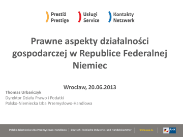 Prawne aspekty działalności gospodarczej w Republice Federalnej Niemiec Wrocław, 20.06.2013 Thomas Urbańczyk Dyrektor Działu Prawo i Podatki Polsko-Niemiecka Izba Przemysłowo-Handlowa Plan prezentacji AHK Polska Działalność gospodarcza na rynku niemieckim rozpoczynanie działalności gospodarczej w Niemczech swoboda świadczenia usług prowadzenie działalności gospodarczej w Niemczech ważne aspekty prawne Usługi AHK Polska AHK Polska Polsko-Niemiecka Izba Przemysłowo-Handlowa Największa bilateralna Izba w Polsce Jedna z najbardziej wpływowych Niemieckich Zagranicznych Izb PrzemysłowoHandlowych (AHK) na świecie Sieć AHK na świecie 120 biur w 80 krajach Sieć AHK Polska biura w Warszawie, Wrocławiu, Gliwicach oraz w Monachium Reprezentuje interesy około 1000 firm członkowskich Od kilkunastu lat działa na rzecz rozwoju polsko-niemieckich stosunków gospodarczych Ponad 40-osobowy zespół Izby pracuje na rzecz firm zrzeszonych w AHK Polska oraz jest odpowiedzialny za profesjonalną obsługę doradczą firm z Niemiec i Polski oraz za rozwój stosunków z instytucjami po obydwu stronach granicy Działalność gospodarcza na rynku niemieckim Od przystąpienia Polski do UE w roku 2004 polskim obywatelom przysługuje swoboda zakładania i prowadzenia działalności gospodarczej Zagwarantowana przez Artykuły 49-55 TFUE Zasada niedyskryminacji podmiotów zagranicznych samodzielne i rzeczywiste wykonywanie działalności gospodarczej w innym państwie członkowskim na czas nieokreślony Zasada traktowania narodowego spełnienie ogólnych warunków i regulacji prawnych dla danej działalności, które dotyczą również obywateli niemieckich dotyczy to przede wszystkim ewentualnych wymogów ustawowych w zakresie udowodnienia kwalifikacji zawodowych Działalność gospodarcza na rynku niemieckim Trzy elementy pojęcia swobody przedsiębiorczości Samodzielność Ze swobody przedsiębiorczości korzystać mogą osoby prowadzące samodzielną działalność gospodarczą tzn. na własny koszt i na własne ryzyko, zwłaszcza w formie tzw. samozatrudnienia Trwałość Trwałość organizacyjną, czyli założenie działalności oraz jej prowadzenie w innym państwie, uczestniczenie w sposób ciągły i stały w jego życiu gospodarczym Transgraniczność Ochronie swobody przedsiębiorczości podlega jedynie działalność gospodarcza o charakterze transgranicznym, tzn. wykonywana na terytorium innego państwa członkowskiego Działalność gospodarcza na rynku niemieckim Swoboda transgranicznego świadczenia usług Świadczenie transgranicznych usług Usługodawca może czasowo udać się do kraju usługobiorcy w celu wykonania usługi Usługobiorca może udać się do usługodawcy, aby tam skorzystać z usługi Obydwa podmioty przebywają w swoich krajach, a tylko produkt przekracza granice Możliwość świadczenia usługi w ramach podwykonawstwa bez zakładania czy rejestracji działalności na terenie Niemiec Na podstawie umowy o dzieło oraz umowy zlecenia Działalność gospodarcza na rynku niemieckim Własne przedsiębiorstwo w Niemczech a transgraniczne wykonywanie usług Własne przedsiębiorstwo Wykonywanie usług z Polski Obecność na rynku i zaufanie klienta Brak obecności i bezpośredniego kontaktu z klientem „Krótkie“ i szybkie drogi Czas reakcji Mobilność na rynku Elastyczność Koszty Koszty Działalność gospodarcza na rynku niemieckim Przed wejściem na rynek należy przeprowadzić analizę, w jaki sposób i w jakiej formie spółka powinna wejść na rynek przez Dystrybucja Bezpośrednia lub Handel elektroniczny pracując z lub Dystrybucja Pośrednia Lokalnymi dystrybutorami lub Otwarcie filii i Założenie firmy lub jako forma mieszana np. Agentami sprzedaży Franczyzobiorcy Zatrudnienie pracowników lub Pełnomocnicy Działalność gospodarcza na rynku niemieckim Założenie firmy w Niemczech Wybór formy prawnej i zawarcie umowy spółki Zameldowanie w urzędzie miasta/ wydział spraw obywatelskich Wynajem lokalu Otwarcie konta bankowego Wpis do rejestru handlowego Zgłoszenie działalności w urzędzie ds. gospodarki Pozostałe zgłoszenia (urząd skarbowy, IHK, izba rzemieślnicza, kasa chorych itd.) Działalność gospodarcza na rynku niemieckim Filia / oddział lub samodzielna firma Otwieranie filii / oddziału Firmy zagraniczne, które mają siedzibę i prowadzą działalność poza terenem Niemiec mogą zdecydować się na utworzenie: oddziału (selbständige Zweigniederlassung) lub zakładu/filii (unselbständige Zweigniederlassung) Zakładanie samodzielnej spółki Każda osoba fizyczna, spółka czy przedsiębiorstwo może w Niemczech założyć firmę lub zdobyć udziały w firmie już istniejącej, bez względu na narodowość czy miejsce zamieszkania Działalność gospodarcza na rynku niemieckim Oddział Samodzielna jednostka przedsiębiorstwa głównego (polskiego) Obowiązek wpisu do rejestru (notarialnie potwierdzony wniosek) Posiada: własne kierownictwo własny lokal własny majątek prowadzi własną księgowość Nie ma osobowości prawnej Ma prawo do pozwania i może być pozwany Działalność gospodarcza na rynku niemieckim Zakład / filia Niesamodzielna jednostka – dzieli byt prawny polskiego przedsiębiorstwa macierzystego i występuje wyłącznie pod jego nazwą Nie podlega wpisowi do niemieckiego rejestru handlowego (Handelsregister) Podlega wpisowi do ewidencji gospodarczej (Gewerbeanmeldung, Gewerberegister) Nie posiada: własnego kierownictwa własnej księgowości własnego majątku firmowego Księgowość jest prowadzona przez macierzysty polski podmiot gospodarczy, do niego także należy majątek firmowy Filia nie posiada osobowości prawnej Dłużnikiem oraz właścicielem praw i roszczeń, jest polski podmiot gospodarczy Działalność gospodarcza na rynku niemieckim Kryteria wyboru poszczególnych form prawnych Zaangażowanie Zmiany / Liczba Finanso- Opodatkowanie Odpowiedzialność osobiste / odejście wspólni