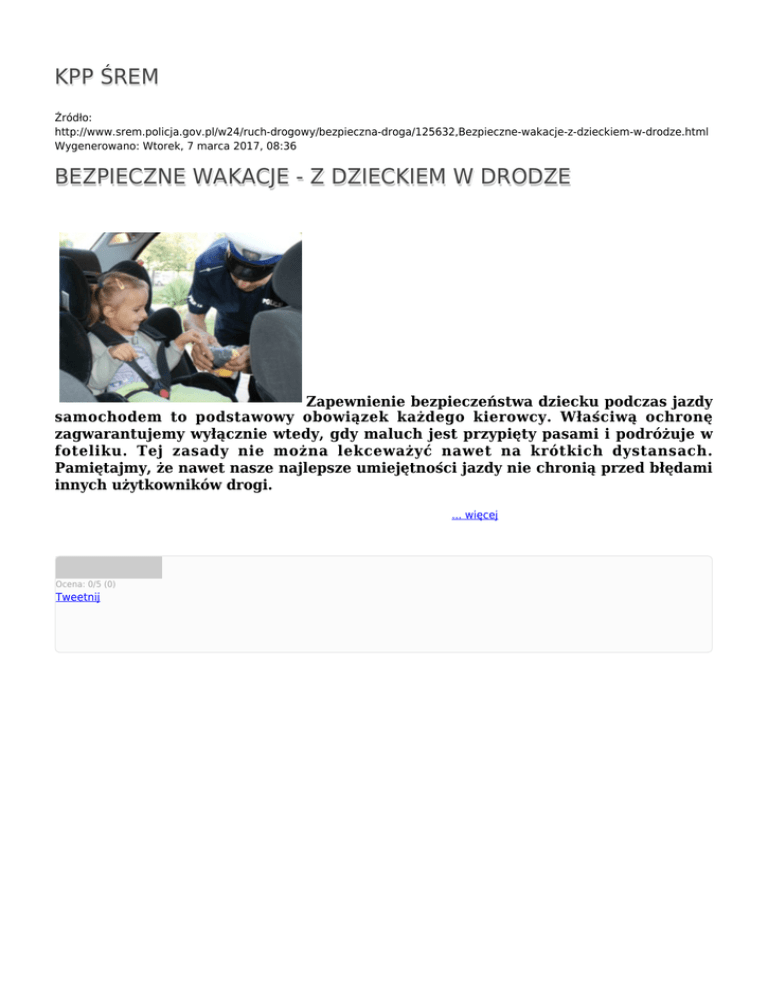 KPP ŚREM Źródło: http://www.srem.policja.gov.pl/w24/ruch-drogowy/bezpieczna-droga/125632,Bezpieczne-wakacje-z-dzieckiem-w-drodze.html Wygenerowano: Wtorek, 7 marca 2017, 08:36 BEZPIECZNE WAKACJE - Z DZIECKIEM W DRODZE Zapewnienie bezpieczeństwa dziecku podczas jazdy samochodem to podstawowy obowiązek każdego kierowcy. Właściwą ochronę zagwarantujemy wyłącznie wtedy, gdy maluch jest przypięty pasami i podróżuje w foteliku. Tej zasady nie można lekceważyć nawet na krótkich dystansach. Pamiętajmy, że nawet nasze najlepsze umiejętności jazdy nie chronią przed błędami innych użytkowników drogi. ... więcej Ocena: 0/5 (0) Tweetnij