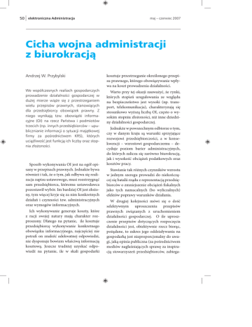50 elektroniczna Administracja maj – czerwiec 2007 Cicha wojna administracji z biurokracją Andrzej W. Przybylski kosztuje przestrzeganie określonego przepisu prawnego, którego obowiązywanie wpływa na koszt prowadzenia działalności. We współczesnych realiach gospodarczych prowadzenie działalności gospodarczej w dużej mierze wiąże się z przestrzeganiem wielu przepisów prawnych, stanowiących dla przedsiębiorcy obowiązek prawny. Z niego wynikają tzw. obowiązki informacyjne (OI) na rzecz Państwa i podmiotów trzecich (np. innych przedsiębiorców – upublicznianie informacji o sytuacji majątkowej firmy za pośrednictwem KRS), których uciążliwość jest funkcją ich liczby oraz stopnia złożoności. Warto przy tej okazji zauważyć, że rynki, których stopień uregulowania ze względu na bezpieczeństwo jest wysoki (np. transport, telekomunikacja), charakteryzują się stosunkowo wyższą liczbą OI, często o wysokim stopniu złożoności, niż inne dziedziny działalności gospodarczej. Sposób wykonywania OI jest na ogół opisany w przepisach prawnych. Jednakże bywa również i tak, że o tym, jak odbywa się realizacja zapisu ustawowego, musi rozstrzygnąć sam przedsiębiorca, któremu ustawodawca pozostawił wybór. Im bardziej OI jest złożony, tym więcej kryje się za nim konkretnych działań i czynności tzw. administracyjnych oraz wymogów informacyjnych. Ich wykonywanie generuje koszty, które z racji swojej natury mają charakter rozproszony. Dlatego na pytanie, ile kosztuje przedsiębiorcę wykonywanie konkretnego obowiązku informacyjnego, najczęściej nie potrafi on znaleźć adekwatnej odpowiedzi, nie dysponuje bowiem właściwą informacją kosztową. Jeszcze trudniej uzyskać odpowiedź na pytanie, ile w skali gospodarki Jednakże w powszechnym odbiorze o tym, czy w danym kraju są warunki sprzyjające rozwojowi przedsiębiorczości, a w konsekwencji – wzrostowi gospodarczemu – decyduje poziom barier administracyjnych, do których zalicza się zarówno biurokrację, jak i wysokość obciążeń podatkowych oraz kosztów pracy. Stawianie tak różnych czynników wzrostu w jednym szeregu prowadzi do niekończącej się batalii rządu z reprezentacją przedsiębiorców o zmniejszenie obciążeń fiskalnych jako tych namacalnych (bo wyliczalnych) efektów poprawy warunków działania. W drugiej kolejności mówi się o dość selektywnym uproszczeniu przepisów prawnych związanych z uruchomieniem działalności gospodarczej. O ile uproszczenie przepisów dotyczących rozpoczęcia działalności jest, obiektywnie rzecz biorąc, pożądane, to zakres jego oddziaływania na gospodarkę jest nieproporcjonalny do uwagi, jaką opinia publiczna (za pośrednictwem mediów nagłaśniających sprawę za inspiracją stowarzyszeń przedsiębiorców, zabiega- Cicha wojna administracji z biurokracją jących o wizerunek instytucji aktywnych, a tym samym – użytecznych) przywiązuje do tej kwestii. Dlatego rząd pragnący zademonstrować swoją gotowość do współpracy podejmuje próbę realizacji postulatów przedsiębiorców. Co uznajemy za biurokrację? Taki scenariusz zdarzeń ma miejsce w wielu krajach, w tym i w Polsce, i w sąsiednich Niemczech, w których wysoka stawka CIT została niedawno obniżona do poziomu konkurencyjnego w stosunku do stawek obowiązujących w nowych krajach członkowskich Wspólnoty. Czy w związku z tym kwestia redukcji obciążeń administracyjnych schodzi na dalszy plan i nie możemy liczyć na rychłe wprowadzenie w życie zapowiadanych uproszczeń w przepisach składających się na przestrzeń prawną, w której polscy przedsiębiorcy muszą prowadzić działalność? Zanim odpowiemy na tak postawione pytanie, musimy uzgodnić wspólny pogląd na kwestię tego, co możemy uznać za biurokrację. W największym uproszczeniu pod pojęciem biurokracji rozumiemy te przepisy prawne, których przestrzeganie przez przedsiębiorców oznacza konieczność dostarczenia organowi władzy państwowej lub innemu podmiotowi konkretnej informacji w określonym trybie i czasie (np. deklaracja VAT – 7K, sprawozdanie statystyczne SP–3). Jeżeli zmiana obowiązujących przepisów prowadzi do zmiany zakresu i uciążliwości działań administracyjnych, które one wywołują, to możemy uznać dane przepisy za prowadzące do obciążeń lub barier administracyjnych, zwanych bardziej trafnie biurokratycznymi (kryterium rozstrzygające – zob. rys. 1). Rys. 1. Schemat klasyfikacji kosztów administracyjnych 51 52 elektroniczna Administracja Jeśli potrafimy wyrazić w jednostkach pieniężnych wartość obciążeń generowanych przez konkretny przepis, a raczej zbiór obowiązków informacyjnych za nim się kryjących, wówczas możemy podjąć działania racjonalizacyjne oparte na zobiektywizowanych przesłankach ekonomicznych. Redukcja obciążeń biurokratycznych oznacza wówczas redukcję kosztów przestrzegania przepisów prawnych ponoszonych przez przedsiębiorców na zidentyfikowaną skalę. Daniny i inne obciążenia finansowe nie wykazują związku przyczynowo-skutkowego z wykonywaniem OI i dlatego nie możemy ich uznać za bariery administracyjne. Siły sprawcze postępujących zmian Przedstawiona logika identyfikacji obciążeń biurokratycznych leży u podstawy działań prowadzących do lepszego stanowienia nowego oraz modyfikacji już istniejącego prawa. Mając świadomość tego, że biurokracja jest zjawiskiem uniwersalnym, którego ograniczenie leży w interesie przedsiębiorców i państwa, w latach 1999–2000 powstała metodyka pomiaru obciążeń administracyjnych, której wynik służy zaprojektowaniu spójnych działań legislacyjnych, ujmowanych w ramy reform na szczeblu administracji centralnej1. Idea pomiaru obciążeń biurokratycznych za pomocą MKS Po raz pierwszy model kosztu standardowego (MKS) został zastosowany do _______________________________________ 1 maj – czerwiec 2007 kwantyfikacji zide