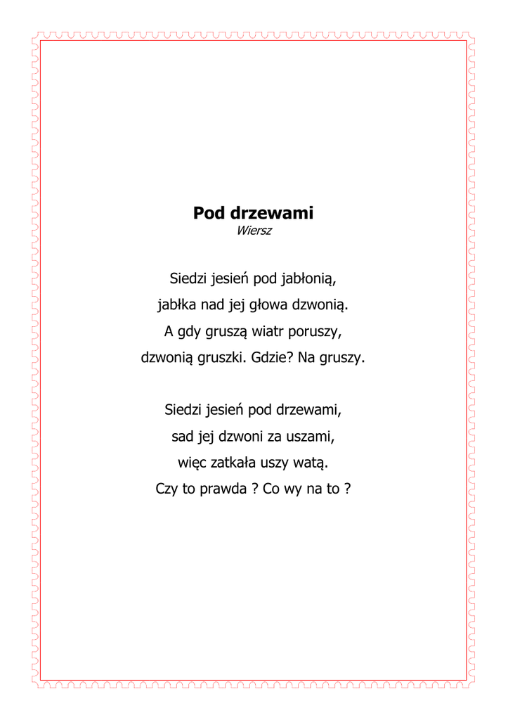 Pod drzewami Wiersz Siedzi jesień pod jabłonią, jabłka nad jej głowa dzwonią. A gdy gruszą wiatr poruszy, dzwonią gruszki. Gdzie? Na gruszy. Siedzi jesień pod drzewami, sad jej dzwoni za uszami, więc zatkała uszy watą. Czy to prawda ? Co wy na to ?