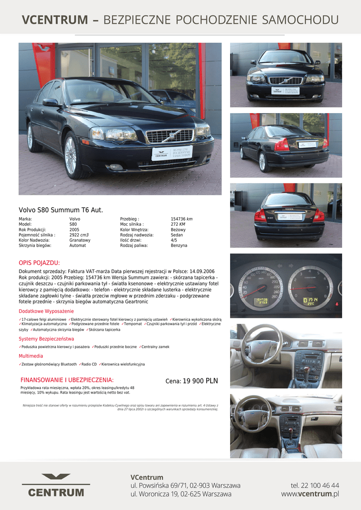 Volvo S80 Summum T6 Aut. Marka: Model: Rok Produkcji: Pojemność silnika : Kolor Nadwozia: Skrzynia biegów: Volvo S80 2005 2922 cm3 Granatowy Automat Przebieg : Moc silnika : Kolor Wnętrza: Rodzaj nadwozia: Ilość drzwi: Rodzaj paliwa: 154736 km 272 KM Beżowy Sedan 4/5 Benzyna OPIS POJAZDU: Dokument sprzedaży: Faktura VAT-marża Data pierwszej rejestracji w Polsce: 14.09.2006 Rok produkcji: 2005 Przebieg: 154736 km Wersja Summum zawiera: - skórzana tapicerka czujnik deszczu - czujniki parkowania tył - światła ksenonowe - elektrycznie ustawiany fotel kierowcy z pamięcią dodatkowo: - telefon - elektrycznie składane lusterka - elektrycznie składane zagłowki tylne - światła przeciw mgłowe w przednim zderzaku - podgrzewane fotele przednie - skrzynia biegów automatyczna Geartronic Dodatkowe Wyposażenie ✓17-calowe felgi aluminiowe ✓Elektrycznie sterowany fotel kierowcy z pamięcią ustawień ✓Kierownica wykończona skórą ✓Klimatyzacja automatyczna ✓Podgrzewane przednie fotele ✓Tempomat ✓Czujniki parkowania tył i przód ✓Elektryczne szyby ✓Automatyczna skrzynia biegów ✓Skórzana tapicerka Systemy Bezpieczeństwa ✓Poduszka powietrzna kierowcy i pasażera ✓Poduszki przednie boczne ✓Centralny zamek Multimedia ✓Zestaw głośnomówiący Bluetooth ✓Radio CD ✓Kierownica wielofunkcyjna FINANSOWANIE I UBEZPIECZENIA: Cena: 19 900 PLN Przykładowa rata miesięczna, wpłata 20%, okres leasingu/kredytu 48 miesięcy, 10% wykupu. Rata leasingu jest wartością netto bez vat. Niniejsza treść nie stanowi oferty w rozumieniu przepisów Kodeksu Cywilnego oraz opisu towaru ani zapewnienia w rozumieniu art. 4 Ustawy z dnia 27 lipca 2002r o szczególnych warunkach sprzedaży konsumenckiej. Powered by TCPDF (www.tcpdf.org)