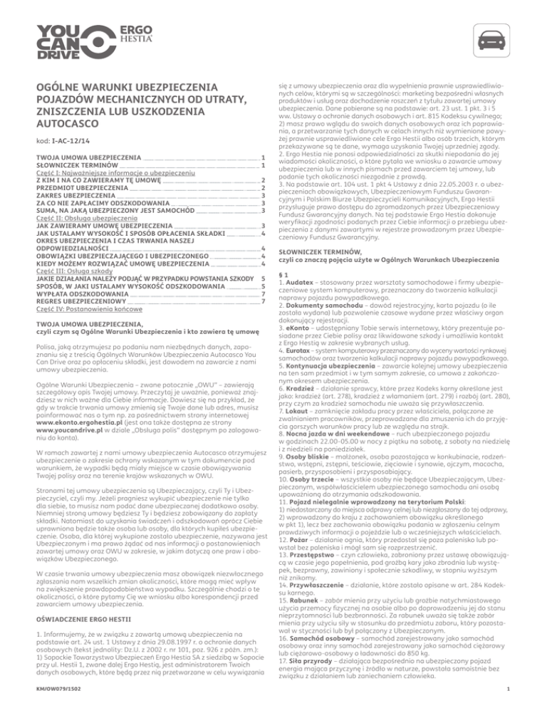 OGÓLNE WARUNKI UBEZPIECZENIA POJAZDÓW MECHANICZNYCH OD UTRATY, ZNISZCZENIA LUB USZKODZENIA AUTOCASCO kod: I-AC-12/14 TWOJA UMOWA UBEZPIECZENIA SŁOWNICZEK TERMINÓW Część I: Najważniejsze informacje o ubezpieczeniu Z KIM I NA CO ZAWIERAMY TĘ UMOWĘ PRZEDMIOT UBEZPIECZENIA ZAKRES UBEZPIECZENIA ZA CO NIE ZAPŁACIMY ODSZKODOWANIA SUMA, NA JAKĄ UBEZPIECZONY JEST SAMOCHÓD Część II: Obsługa ubezpieczenia JAK ZAWIERAMY UMOWĘ UBEZPIECZENIA JAK USTALAMY WYSOKOŚĆ I SPOSÓB OPŁACENIA SKŁADKI OKRES UBEZPIECZENIA I CZAS TRWANIA NASZEJ ODPOWIEDZIALNOŚCI OBOWIĄZKI UBEZPIECZAJĄCEGO I UBEZPIECZONEGO KIEDY MOŻEMY ROZWIĄZAĆ UMOWĘ UBEZPIECZENIA Część III: Osługa szkody JAKIE DZIAŁANIA NALEŻY PODJĄĆ W PRZYPADKU POWSTANIA SZKODY SPOSÓB, W JAKI USTALAMY WYSOKOŚĆ ODSZKODOWANIA WYPŁATA ODSZKODOWANIA REGRES UBEZPIECZENIOWY Część IV: Postanowienia końcowe 1 1 2 2 3 3 3 3 4 4 4 4 5 5 7 7 TWOJA UMOWA UBEZPIECZENIA, czyli czym są Ogólne Warunki Ubezpieczenia i kto zawiera tę umowę Polisa, jaką otrzymujesz po podaniu nam niezbędnych danych, zapoznaniu się z treścią Ogólnych Warunków Ubezpieczenia Autocasco You Can Drive oraz po opłaceniu składki, jest dowodem na zawarcie z nami umowy ubezpieczenia. Ogólne Warunki Ubezpieczenia – zwane potocznie „OWU” – zawierają szczegółowy opis Twojej umowy. Przeczytaj je uważnie, ponieważ znajdziesz w nich ważne dla Ciebie informacje. Dowiesz się na przykład, że gdy w trakcie trwania umowy zmienią się Twoje dane lub adres, musisz poinformować nas o tym np. za pośrednictwem strony internetowej www.ekonto.ergohestia.pl (jest ona także dostępna ze strony www.youcandrive.pl w dziale „Obsługa polis” dostępnym po zalogowaniu do konta). W ramach zawartej z nami umowy ubezpieczenia Autocasco otrzymujesz ubezpieczenie o zakresie ochrony wskazanym w tym dokumencie pod warunkiem, że wypadki będą miały miejsce w czasie obowiązywania Twojej polisy oraz na terenie krajów wskazanych w OWU. Stronami tej umowy ubezpieczenia są Ubezpieczający, czyli Ty i Ubezpieczyciel, czyli my. Jeżeli pragniesz wykupić ubezpieczenie nie tylko dla siebie, to musisz nam podać dane ubezpieczanej dodatkowo osoby. Niemniej stroną umowy będziesz Ty i będziesz zobowiązany do zapłaty składki. Natomiast do uzyskania świadczeń i odszkodowań oprócz Ciebie uprawniona będzie także osoba lub osoby, dla których kupiłeś ubezpieczenie. Osoba, dla której wykupione zostało ubezpieczenie, nazywana jest Ubezpieczonym i ma prawo żądać od nas informacji o postanowieniach zawartej umowy oraz OWU w zakresie, w jakim dotyczą one praw i obowiązków Ubezpieczonego. W czasie trwania umowy ubezpieczenia masz obowiązek niezwłocznego zgłaszania nam wszelkich zmian okoliczności, które mogą mieć wpływ na zwiększenie prawdopodobieństwa wypadku. Szczególnie chodzi o te okoliczności, o które pytamy Cię we wniosku albo korespondencji przed zawarciem umowy ubezpieczenia. OŚWIADCZENIE ERGO HESTII 1. Informujemy, że w związku z zawartą umową ubezpieczenia na podstawie art. 24 ust. 1 Ustawy z dnia 29.08.1997 r. o ochronie danych osobowych (tekst jednolity: Dz.U. z 2002 r. nr 101, poz. 926 z późn. zm.): 1) Sopockie Towarzystwo Ubezpieczeń Ergo Hestia SA z siedzibą w Sopocie przy ul. Hestii 1, zwane dalej Ergo Hestią, jest administratorem Twoich danych osobowych, które będą przez nią przetwarzane w celu wywiązania KM/OW079/1502 się z umowy ubezpieczenia oraz dla wypełnienia prawnie usprawiedliwionych celów, którymi są w szczególności: marketing bezpośredni własnych produktów i usług oraz dochodzenie roszczeń z tytułu zawartej umowy ubezpieczenia. Dane pobierane są na podstawie: art. 23 ust. 1 pkt. 3 i 5 ww. Ustawy o ochronie danych osobowych i art. 815 Kodeksu cywilnego; 2) masz prawo wglądu do swoich danych osobowych oraz ich poprawiania, a przetwarzanie tych danych w celach innych niż wymienione powyżej prawnie usprawiedliwione cele Ergo Hestii albo osób trzecich, którym przekazywane są te dane, wymaga uzyskania Twojej uprzedniej zgody. 2. Ergo Hestia nie ponosi odpowiedzialności za skutki niepodania do jej wiadomości okoliczności, o które pytała we wniosku o zawarcie umowy ubezpieczenia lub w innych pismach przed zawarciem tej umowy, lub podanie tych okoliczności niezgodnie z prawdą. 3. Na podstawie art. 104 ust. 1 pkt 4 Ustawy z dnia 22.05.2003 r. o ubezpieczeniach obowiązkowych, Ubezpieczeniowym Funduszu Gwarancyjnym i Polskim Biurze Ubezpieczycieli Komunikacyjnych, Ergo Hestii przysługuje prawo dostępu do zgromadzonych przez Ubezpieczeniowy Fundusz Gwarancyjny danych. Na tej podstawie Ergo Hestia dokonuje weryfikacji zgodności podanych przez Ciebie informacji o przebiegu ubezpieczenia z danymi zawartymi w rejestrze prowadzonym przez Ubezpieczeniowy Fundusz Gwarancyjny. SŁOWNICZEK TERMINÓW, czyli co znaczą pojęcia użyte w Ogólnych Warunkach Ubezpieczenia §1 1. Audatex – stosowany przez warsztaty samochodowe i firmy ubezpieczeniowe system komputerowy, przeznaczony do tworzenia kalkulacji naprawy pojazdu powypadkowego. 2. Dokumenty samochodu – dowód rejestracyjny, karta pojazdu (o ile została wydana) lub pozwolenie czasowe wydane przez właściwy organ dokonujący rejestracji. 3. eKonto – udostępniany Tobie serwis internetowy, który prezentuje posiadane przez Ciebie polisy oraz likwidowane szkody i umożliwia kontakt z Ergo Hestią w zakresie wybranych usług. 4. Eurotax – system komputerowy przeznaczony do wyceny wartości rynkowej samochodów oraz tworzenia kalkulacji naprawy pojazdu powypadkowego. 5. Kontynuacja ubezpieczenia – zawarcie kolejnej umowy ubezpieczenia na ten sam przedmiot i w tym samym zakresie, co umowa z zakończonym okresem ubezpieczenia. 6. Kradzież – działanie sprawcy, które przez Kodeks karny określane jest jako: kradzież (art. 278), kradzież z włamaniem (art. 279) i rozbój (art. 280), przy czym za kradzież samochodu nie uważa
