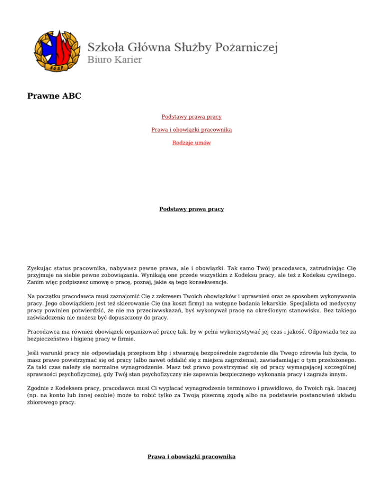 Prawne ABC Podstawy prawa pracy Prawa i obowiązki pracownika Rodzaje umów Podstawy prawa pracy Zyskując status pracownika, nabywasz pewne prawa, ale i obowiązki. Tak samo Twój pracodawca, zatrudniając Cię przyjmuje na siebie pewne zobowiązania. Wynikają one przede wszystkim z Kodeksu pracy, ale też z Kodeksu cywilnego. Zanim więc podpiszesz umowę o pracę, poznaj, jakie są tego konsekwencje. Na początku pracodawca musi zaznajomić Cię z zakresem Twoich obowiązków i uprawnień oraz ze sposobem wykonywania pracy. Jego obowiązkiem jest też skierowanie Cię (na koszt firmy) na wstępne badania lekarskie. Specjalista od medycyny pracy powinien potwierdzić, że nie ma przeciwwskazań, byś wykonywał pracę na określonym stanowisku. Bez takiego zaświadczenia nie możesz być dopuszczony do pracy. Pracodawca ma również obowiązek organizować pracę tak, by w pełni wykorzystywać jej czas i jakość. Odpowiada też za bezpieczeństwo i higienę pracy w firmie. Jeśli warunki pracy nie odpowiadają przepisom bhp i stwarzają bezpośrednie zagrożenie dla Twego zdrowia lub życia, to masz prawo powstrzymać się od pracy (albo nawet oddalić się z miejsca zagrożenia), zawiadamiając o tym przełożonego. Za taki czas należy się normalne wynagrodzenie. Masz też prawo powstrzymać się od pracy wymagającej szczególnej sprawności psychofizycznej, gdy Twój stan psychofizyczny nie zapewnia bezpiecznego wykonania pracy i zagraża innym. Zgodnie z Kodeksem pracy, pracodawca musi Ci wypłacać wynagrodzenie terminowo i prawidłowo, do Twoich rąk. Inaczej (np. na konto lub innej osobie) może to robić tylko za Twoją pisemną zgodą albo na podstawie postanowień układu zbiorowego pracy. Prawa i obowiązki pracownika Obowiązki pracownika Urlop Zwolnienie lekarskie Zawieszenie przywilejów Jak odchodzić Jak dochodzić swego Na szaro i na czarno Obowiązki pracownika Do Twoich podstawowych obowiązków jako pracownika należy przede wszystkim sumienne i staranne wykonywanie przydzielonych Ci zadań. Musisz przestrzegać ustalonego czasu pracy, regulaminu pracy oraz przepisów i zasad bhp. Masz też obowiązek chronić mienie (np. dbać o powierzony Ci sprzęt, za który możesz być odpowiedzialny materialnie) i tajemnice firmy, a nawet przestrzegać w zakładzie pracy zasad współżycia społecznego (chodzi m.in. o to, byś współpracował z innymi i swoją postawą nie wprowadzał w firmie niezdrowej atmosfery). Jeszcze przed rozpoczęciem przez Ciebie pracy pracodawca powinien uzyskać od Ciebie pisemne potwierdzenie, że zapoznałeś się z treścią regulaminu pracy, przepisami dotyczącymi bhp i (ewentualnie) tajemnicy służbowej. Będąc podporządkowany pracodawcy masz też obowiązek wykonywania jego poleceń (zwykle w dokumencie precyzującym zakres obowiązków jest zapis o "wykonywaniu poleceń przełożonego"). Pamiętaj jednak, że chodzi wyłącznie o polecenia dotyczące pracy, zgodne z umową (rodzajem pracy) i przepisami prawa. Poniżej omówimy bardziej szczegółowo te sprawy, z którymi najczęściej będziesz miał w pracy do czynienia. Czas pracy Jednym z podstawowych obowiązków pracownika i pracodawcy jest przestrzeganie czasu pracy. Nie może on przekraczać 8 godzin na dobę i przeciętnie 40 godzin w przeciętnie pięciodniowym tygodniu pracy w przyjętym okresie rozliczeniowym nie przekraczającym 4 miesięcy. Praca wykonywana ponad normy czasu pracy, a także ponad przedłużony dobowy wymiar czasu pracy wynikający z obowiązującego pracownika systemu i rozkładu czasu pracy, jest pracą w godzinach nadliczbowych. Praca taka jest dopuszczalna tylko w razie: * konieczności prowadzenia akcji ratowniczej dla ochrony życia lub zdrowia ludzkiego albo dla ochrony mienia lub środowiska bądź usunięcia awarii, * szczególnych potrzeb pracodawcy. Za pracę w godzinach nadliczbowych przysługuje Ci czas wolny albo dodatek pieniężny do wynagrodzenia w wysokości 50 proc. (za dodatkową pracę w dni powszednie oraz w niedziele i święta będące dla Ciebie dniami pracy) lub 100 proc. wynagrodzenia (za dodatkową pracę w nocy oraz w wolne niedziele i święta, a także w dni wolne należące się zamiast przepracowanych niedziel). Jeśli pracodawca sam udzieli Ci czasu wolnego (zamiast np. zapłacić dodatek), to za każdą przepracowaną nadgodzinę należy się półtorej godziny wolnego. Ale jeżeli o wolne w zamian za pracę w godzinach nadliczbowych wystąpisz sam, to wówczas za jedną godzinę pracy przysługuje Ci jedna godzina czasu wolnego. W każdym tygodniu (poza niedzielą) pracownikowi przysługuje jeden dzień wolny od pracy (nie musi to być sobota). Jeśli pracodawca Ci go nie udzieli, w następnym tygodniu powinieneś otrzymać dwa dni wolne od pracy. Pracodawca powinien zagwarantować pracownikowi w każdej dobie co najmniej 11 godzin nieprzerwanego odpoczynku oraz co najmniej 35 godzin nieprzerwanego odpoczynku na tydzień. Urlop Kodeks pracy gwarantuje Ci prawo do corocznego, nieprzerwanego, płatnego urlopu wypoczynkowego. Co więcej - nie możesz się tego prawa zrzec. Pierwszy urlop możesz wziąć już po miesiącu pracy. Z upływem każdego miesiąca pracy uzyskujesz prawo do urlopu w wymiarze 1/12 wymiaru, jaki przysługuje Ci po roku. W kolejnym roku masz prawo do pełnego urlopu wypoczynkowego. Liczba dni przysługującego urlopu zależy od Twego stażu pracy, do którego liczą się nie tylko lata przepracowane, ale też te, w czasie których zdobywałeś wykształcenie. Absolwent zasadniczej szkoły zawodowej zyskuje dzięki temu 3 lata pracy, technikum - 5 lat, ogólniaka - 4 lata, szkoły policealnej - 6 lat, a wyższej uczelni - aż 8 lat. Liczy się tylko ostatni etap edukacji, a więc okresów nauki się nie sumuje. Do stażu pracy zalicza Ci się wszystkie okresy zatrudnienia, bez względu na to, jak duże były między nimi przerwy i jak zostały rozwiązane umowy z poprzednimi firmami. Urlop wynosi: