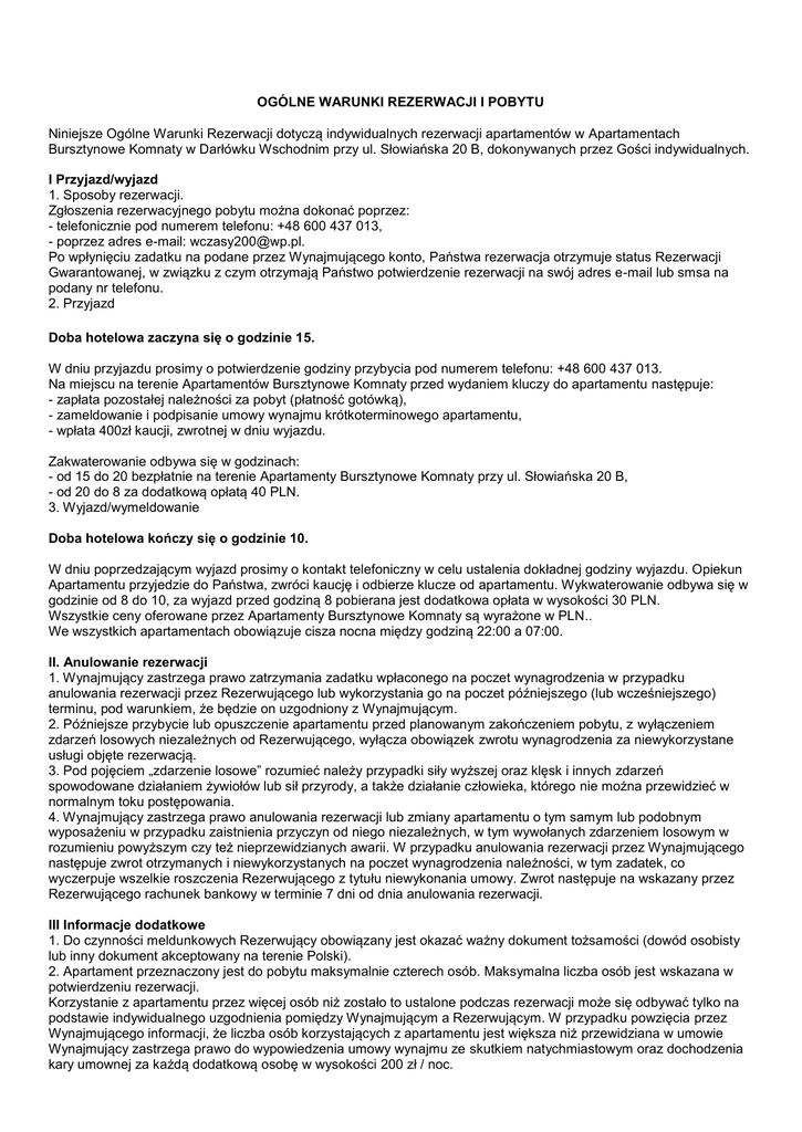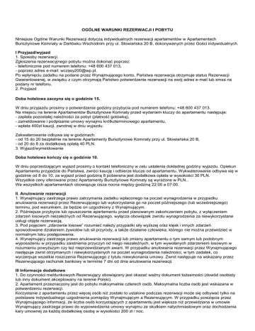 OGÓLNE WARUNKI REZERWACJI I POBYTU Niniejsze Ogólne Warunki Rezerwacji dotyczą indywidualnych rezerwacji apartamentów w Apartamentach Bursztynowe Komnaty w Darłówku Wschodnim przy ul. Słowiańska 20 B, dokonywanych przez Gości indywidualnych. I Przyjazd/wyjazd 1. Sposoby rezerwacji. Zgłoszenia rezerwacyjnego pobytu można dokonać poprzez: - telefonicznie pod numerem telefonu: +48 600 437 013, - poprzez adres e-mail: [email protected]. Po wpłynięciu zadatku na podane przez Wynajmującego konto, Państwa rezerwacja otrzymuje status Rezerwacji Gwarantowanej, w związku z czym otrzymają Państwo potwierdzenie rezerwacji na swój adres e-mail lub smsa na podany nr telefonu. 2. Przyjazd Doba hotelowa zaczyna się o godzinie 15. W dniu przyjazdu prosimy o potwierdzenie godziny przybycia pod numerem telefonu: +48 600 437 013. Na miejscu na terenie Apartamentów Bursztynowe Komnaty przed wydaniem kluczy do apartamentu następuje: - zapłata pozostałej należności za pobyt (płatność gotówką), - zameldowanie i podpisanie umowy wynajmu krótkoterminowego apartamentu, - wpłata 400zł kaucji, zwrotnej w dniu wyjazdu. Zakwaterowanie odbywa się w godzinach: - od 15 do 20 bezpłatnie na terenie Apartamenty Bursztynowe Komnaty przy ul. Słowiańska 20 B, - od 20 do 8 za dodatkową opłatą 40 PLN. 3. Wyjazd/wymeldowanie Doba hotelowa kończy się o godzinie 10. W dniu poprzedzającym wyjazd prosimy o kontakt telefoniczny w celu ustalenia dokładnej godziny wyjazdu. Opiekun Apartamentu przyjedzie do Państwa, zwróci kaucję i odbierze klucze od apartamentu. Wykwaterowanie odbywa się w godzinie od 8 do 10, za wyjazd przed godziną 8 pobierana jest dodatkowa opłata w wysokości 30 PLN. Wszystkie ceny oferowane przez Apartamenty Bursztynowe Komnaty są wyrażone w PLN.. We wszystkich apartamentach obowiązuje cisza nocna między godziną 22:00 a 07:00. II. Anulowanie rezerwacji 1. Wynajmujący zastrzega prawo zatrzymania zadatku wpłaconego na poczet wynagrodzenia w przypadku anulowania rezerwacji przez Rezerwującego lub wykorzystania go na poczet późniejszego (lub wcześniejszego) terminu, pod warunkiem, że będzie on uzgodniony z Wynajmującym. 2. Późniejsze przybycie lub opuszczenie apartamentu przed planowanym zakończeniem pobytu, z wyłączeniem zdarzeń losowych niezależnych od Rezerwującego, wyłącza obowiązek zwrotu wynagrodzenia za niewykorzystane usługi objęte rezerwacją. 3. Pod pojęciem „zdarzenie losowe” rozumieć należy przypadki siły wyższej oraz klęsk i innych zdarzeń spowodowane działaniem żywiołów lub sił przyrody, a także działanie człowieka, którego nie można przewidzieć w normalnym toku postępowania. 4. Wynajmujący zastrzega prawo anulowania rezerwacji lub zmiany apartamentu o tym samym lub podobnym wyposażeniu w przypadku zaistnienia przyczyn od niego niezależnych, w tym wywołanych zdarzeniem losowym w rozumieniu powyższym czy też nieprzewidzianych awarii. W przypadku anulowania rezerwacji przez Wynajmującego następuje zwrot otrzymanych i niewykorzystanych na poczet wynagrodzenia należności, w tym zadatek, co wyczerpuje wszelkie roszczenia Rezerwującego z tytułu niewykonania umowy. Zwrot następuje na wskazany przez Rezerwującego rachunek bankowy w terminie 7 dni od dnia anulowania rezerwacji. III Informacje dodatkowe 1. Do czynności meldunkowych Rezerwujący obowiązany jest okazać ważny dokument tożsamości (dowód osobisty lub inny dokument akceptowany na terenie Polski). 2. Apartament przeznaczony jest do pobytu maksymalnie czterech osób. Maksymalna liczba osób jest wskazana w potwierdzeniu rezerwacji. Korzystanie z apartamentu przez więcej osób niż zostało to ustalone podczas rezerwacji może się odbywać tylko na podstawie indywidualnego uzgodnienia pomiędzy Wynajmującym a Rezerwującym. W przypadku powzięcia przez Wynajmującego informacji, że liczba osób korzystających z apartamentu jest większa niż przewidziana w umowie Wynajmujący zastrzega prawo do wypowiedzenia umowy wynajmu ze skutkiem natychmiastowym oraz dochodzenia kary umownej za każdą dodatkową osobę w wysokości 200 zł / noc. 3. Istnieje możliwość zarezerwowania garażu. Garaż nie jest automatycznie rezerwowany do wynajmowanego apartamentu. Rezerwacji garażu należy dokonać podczas rezerwacji telefonicznej/mailowej. Cena garażu/miejsca parkingowego zawarta jest w cenie apartamentu. 4. Wynajmujący nie ponosi odpowiedzialności za niedogodności powstałe podczas pobytu związane z pracami budowlanymi lub wykończeniowymi, jakie mogą być prowadzone na terenie obiektu, w którym usytuowany jest apartament jak i wokół niego, przerwaniem, z przyczyn niezależnych od Wynajmującego, dostawy mediów (m.in. prądu, wody, c.o.), działaniem internetu, imisjami (w szczególności hałasem) z nieruchomości sąsiednich czy tez awariami niezależnymi od Wynajmującego np. działaniem windy czy bramy wjazdowej. 5. Palenie tytoniu na terenie obiektu, w którym usytuowany jest apartament odbywa się wyłącznie w miejscach wyznaczonych. Za złamanie zakazu, w szczególności za palenie tytoniu w apartamencie, Rezerwujący zostanie obciążony karą pieniężną w kwocie 400,00 zł. W przypadku palenia tytoniu i uaktywnieniu instalacji przeciwpożarowej Rezerwujący zostanie obciążony karą pieniężną w kwocie 800 zł. 6. Przedłużenie pobytu należy zgłosić najpóźniej do godziny 18.00 w dniu poprzedzającym dzień upływu terminu objętego dokonaną rezerwacją. Przedłużenie pobytu nastąpi wyłącznie w miarę dysponowania wolnymi apartamentami. 7. Rezerwujący ponosi odpowiedzialność materialną za wszelkie szkody na osobie lub mieniu, powstałe z jego winy lub osób trzecich, związane z zarezerwowanym pobytem. 8. Za szkody powstałe na osobie lub mieniu Rezerwującego, Wynajmujący ponosi odpowiedzialność na zasadach ogólnych. Wynajmujący nie ponosi odpowiedzialności za szkody na osobie lub mieniu powsta