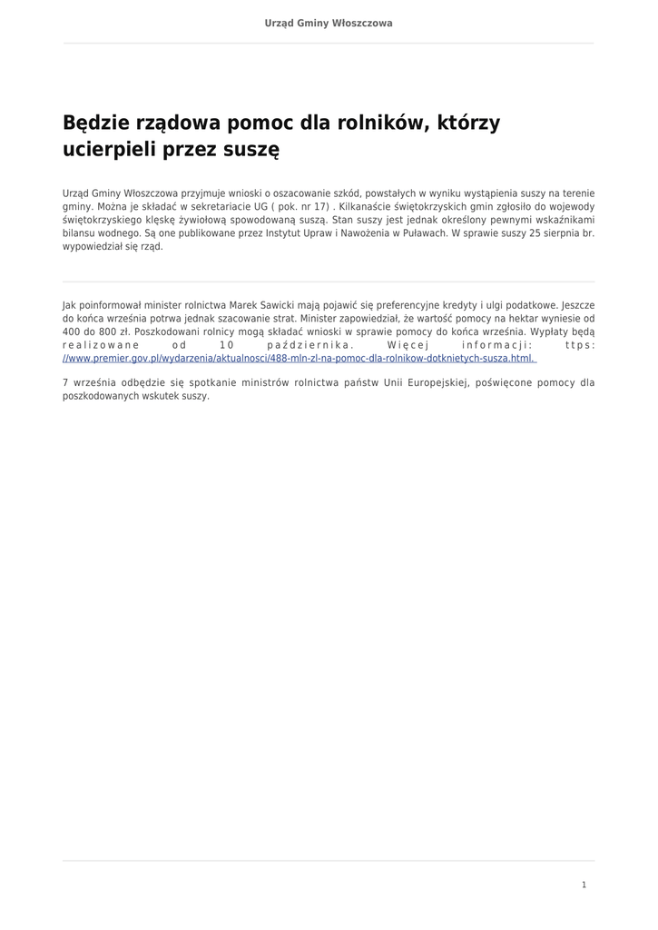 Urząd Gminy Włoszczowa Będzie rządowa pomoc dla rolników, którzy ucierpieli przez suszę Urząd Gminy Włoszczowa przyjmuje wnioski o oszacowanie szkód, powstałych w wyniku wystąpienia suszy na terenie gminy. Można je składać w sekretariacie UG ( pok. nr 17) . Kilkanaście świętokrzyskich gmin zgłosiło do wojewody świętokrzyskiego klęskę żywiołową spowodowaną suszą. Stan suszy jest jednak określony pewnymi wskaźnikami bilansu wodnego. Są one publikowane przez Instytut Upraw i Nawożenia w Puławach. W sprawie suszy 25 sierpnia br. wypowiedział się rząd. Jak poinformował minister rolnictwa Marek Sawicki mają pojawić się preferencyjne kredyty i ulgi podatkowe. Jeszcze do końca września potrwa jednak szacowanie strat. Minister zapowiedział, że wartość pomocy na hektar wyniesie od 400 do 800 zł. Poszkodowani rolnicy mogą składać wnioski w sprawie pomocy do końca września. Wypłaty będą realizowane od 10 października. Więcej informacji: ttps: //www.premier.gov.pl/wydarzenia/aktualnosci/488-mln-zl-na-pomoc-dla-rolnikow-dotknietych-susza.html. 7 września odbędzie się spotkanie ministrów rolnictwa państw Unii Europejskiej, poświęcone pomocy dla poszkodowanych wskutek suszy. 1