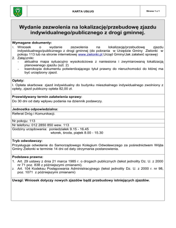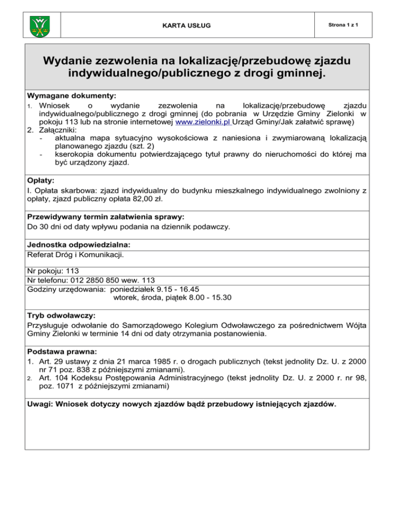 KARTA USŁUG Strona 1 z 1 Wydanie zezwolenia na lokalizację/przebudowę zjazdu indywidualnego/publicznego z drogi gminnej. Wymagane dokumenty: 1. Wniosek o wydanie zezwolenia na lokalizację/przebudowę zjazdu indywidualnego/publicznego z drogi gminnej (do pobrania w Urzędzie Gminy Zielonki w pokoju 113 lub na stronie internetowej www.zielonki.pl Urząd Gminy/Jak załatwić sprawę) 2. Załączniki: aktualna mapa sytuacyjno wysokościowa z naniesiona i zwymiarowaną lokalizacją planowanego zjazdu (szt. 2) kserokopia dokumentu potwierdzającego tytuł prawny do nieruchomości do której ma być urządzony zjazd. Opłaty: I. Opłata skarbowa: zjazd indywidualny do budynku mieszkalnego indywidualnego zwolniony z opłaty, zjazd publiczny opłata 82,00 zł. Przewidywany termin załatwienia sprawy: Do 30 dni od daty wpływu podania na dziennik podawczy. Jednostka odpowiedzialna: Referat Dróg i Komunikacji. Nr pokoju: 113 Nr telefonu: 012 2850 850 wew. 113 Godziny urzędowania: poniedziałek 9.15 - 16.45 wtorek, środa, piątek 8.00 - 15.30 Tryb odwoławczy: Przysługuje odwołanie do Samorządowego Kolegium Odwoławczego za pośrednictwem Wójta Gminy Zielonki w terminie 14 dni od daty otrzymania postanowienia. Podstawa prawna: 1. Art. 29 ustawy z dnia 21 marca 1985 r. o drogach publicznych (tekst jednolity Dz. U. z 2000 nr 71 poz. 838 z późniejszymi zmianami). 2. Art. 104 Kodeksu Postępowania Administracyjnego (tekst jednolity Dz. U. z 2000 r. nr 98, poz. 1071 z późniejszymi zmianami) Uwagi: Wniosek dotyczy nowych zjazdów bądź przebudowy istniejących zjazdów.