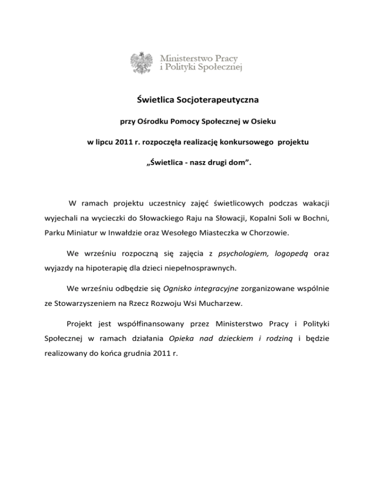 Świetlica Socjoterapeutyczna przy Ośrodku Pomocy Społecznej w Osieku w lipcu 2011 r. rozpoczęła realizację konkursowego projektu „Świetlica - nasz drugi dom”. W ramach projektu uczestnicy zajęć świetlicowych podczas wakacji wyjechali na wycieczki do Słowackiego Raju na Słowacji, Kopalni Soli w Bochni, Parku Miniatur w Inwałdzie oraz Wesołego Miasteczka w Chorzowie. We wrześniu rozpoczną się zajęcia z psychologiem, logopedą oraz wyjazdy na hipoterapię dla dzieci niepełnosprawnych. We wrześniu odbędzie się Ognisko integracyjne zorganizowane wspólnie ze Stowarzyszeniem na Rzecz Rozwoju Wsi Mucharzew. Projekt jest współfinansowany przez Ministerstwo Pracy i Polityki Społecznej w ramach działania Opieka nad dzieckiem i rodziną i będzie realizowany do końca grudnia 2011 r.