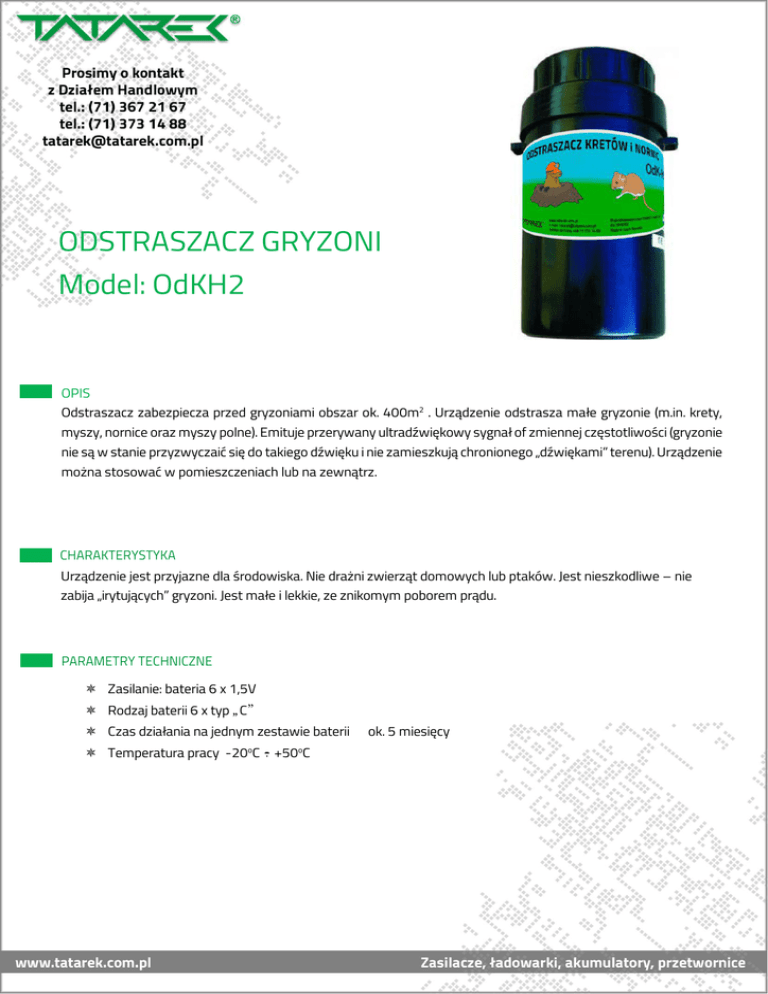 ODSTRASZACZ GRYZONI Model: OdKH2 OPIS Odstraszacz zabezpiecza przed gryzoniami obszar ok. 400m2 . Urządzenie odstrasza małe gryzonie (m.in. krety, myszy, nornice oraz myszy polne). Emituje przerywany ultradźwiękowy sygnał of zmiennej częstotliwości (gryzonie nie są w stanie przyzwyczaić się do takiego dźwięku i nie zamieszkują chronionego „dźwiękami” terenu). Urządzenie można stosować w pomieszczeniach lub na zewnątrz. CHARAKTERYSTYKA URZĄDZENIA: REGULATORA: Urządzenie jest przyjazne dla środowiska. Nie drażni zwierząt domowych lub ptaków. Jest nieszkodliwe – nie zabija „irytujących” gryzoni. Jest małe i lekkie, ze znikomym poborem prądu. PARAMETRY TECHNICZNE Zasilanie: bateria 6 x 1,5V Rodzaj baterii 6 x typ „C” Czas działania na jednym zestawie baterii Temperatura pracy -20oC ÷ +50oC ok. 5 miesięcy