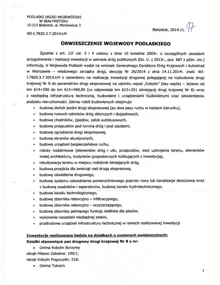 PODLASKI URZĄD WOJEWÓDZKI W BIAŁYMSTOKU 15-213 Białystok, ul. Mickiewicza 3 WI-I.7820.3.7.2014.ŁM Białystok, 2014.11. OBWIESZCZENIE WOJEWODY PODLASKIEGO Zgodnie z art. l l f ust. 3 i 4 ustawy z dnia 10 kwietnia 2003r. o szczególnych zasadach przygotowania i realizacji inwestycji w zakresie dróg publicznych (Dz. U. z 2013r., poz. 687 z późn. zm.) informuję, iż Wojewoda Podlaski wydał na wniosek Generalnego Dyrektora Dróg Krajowych i Autostrad w Warszawie - właściwego zarządcy drogi, decyzję Nr 26/2014 z dnia 14.11.2014r. znak: WI1.7820.3.7.2014.ŁM o zezwoleniu na realizację inwestycji drogowej polegającej na rozbudowie drogi krajowej Nr 8 do parametrów drogi ekspresowej na odcinku węzeł „Kobylin" (bez węzła) - Jeżewo od km 614+500 do km 615+960,85 (co odpowiada km 615+251 istniejącej drogi krajowej Nr 8) wraz z niezbędną infrastrukturą techniczną, budowlami i urządzeniami budowlanymi oraz zatwierdzeniu podziału nieruchomości. Zakres robót budowlanych obejmuje: • budowę dwóch jezdni drogi ekspresowej (po dwa pasy ruchu w każdym kierunku), • budowę nowych odcinków dróg zbiorczych i dojazdowych, • budowę chodników, zjazdów, zatok autobusowych, • budowę przepustów pod koroną dróg i pod zjazdami, • budowę ogrodzenia drogi ekspresowej, • budowę ekranów akustycznych, • budowę urządzeń bezpieczeństwa ruchu, • roboty rozbiórkowe (elementów dróg i ulic, przepustów, sieci uzbrojenia terenu, elementów małej architektury, budynków gospodarczych kolidujących z inwestycją), • rekultywację terenu w miejscu rozbiórek istniejących dróg, • budową przejścia dla zwierząt nad drogą ekspresową, • budowę oświetlenia drogowego, • budowę systemu odwodnienia powierzchniowego poprzez rowy lub kanalizacje deszczową wraz z budową osadników i separatorów, budowę kanału hydrotechnicznego, • budowę kanału technologicznego, • budowę zbiornika retencyjno - infiltracyjnego, • budowę zbiornika retencyjno - oczyszczającego, • budowę zbiornika pełniącego funkcję siedliska dla płazów, • wykonanie nasadzeń niezbędnej zieleni, • przebudowę urządzeń infrastruktury technicznej w ramach realizowanej inwestycji. Inwestycja realizowana będzie na działkach o numerach ewidencyjnych: Działki stanowiące pas drogowy drogi krajowej Nr 8 o nr: • Gmina Kobylin Borzymy obręb Milewo Zabielne: 199/1; obręb Kobylin Pogorzałki: 218; • Gmina Tykocin 1 obręb Jeżewo Nowe: 74, 81/3, 47/3, 47/5, 38/14, 38/12, 50/3, 50/5, 82/4, 82/6, 83/3, 84/1. Działki przeznaczone w całości pod projektowaną drogę krajową Nr 8 o nr: • Gmina Kobylin Borzymy obręb Milewo Zabielne: 186/3, 185/2, 184/2, 183/2, 181/9, 148/2, 149/2, 147, 150/4. Działki, stanowiące teren do czasowego zajęcia, niezbędny podczas realizacji inwestycji o nr: • Gmina Kobylin Borzymy obręb Milewo Zabielne: 188/13 (działka przed podziałem 188/6), 188/15 (działka przed podziałem 188/7); • Gmina Tykocin obręb Jeżewo Nowe: 47/8 (działka przed podziałem 47/4); obręb Kapice Stare: 216/2 (działka przed podziałem 216). Działki, ulegające podziałowi o nr: Powiat Wysokomazowiecki Gmina Kobylin Borzymy • Obręb Milewo Zabielne 1. działka nr 146/2 podzielona na działki: 146/6 (przeznaczona pod drogę) o pow. 2,2537ha i 146/7 o pow. 9,0947ha (w dotychczasowym władaniu). 2. działka nr 146/4 podzielona na działki: 146/8 (przeznaczona pod drogę) o pow. 0,1627ha i 146/9 o pow. 0,1746ha (w dotychczasowym władaniu). 3. działka nr 146/5 podzielona na działki: 146/10 (przeznaczona pod drogę) o pow. 2,2141ha i 146/11 o pow. 0,7186ha (w dotychczasowym władaniu). 4. działka nr 188/4 podzielona na działki: 188/8 (przeznaczona pod drogę) o pow. 0,0019ha i 188/9 o pow. 2,1129ha (w dotychczasowym władaniu). 5. działka nr 188/5 podzielona na działki: 188/10 (przeznaczona pod drogę) o pow. 0,0621ha i 188/11 o pow. 0,9790ha (w dotychczasowym władaniu). 6. działka nr 188/6 podzielona na działki: 188/12 (przeznaczona pod drogę) o pow. 0,0868ha i 188/13 o pow. 2,9550ha (w dotychczasowym władaniu). 7. działka nr 188/7 podzielona na działki: 188/14 (przeznaczona pod drogę) o pow. 0,4357ha i 188/15 o pow. 2,5670ha (w dotychczasowym władaniu). • Obręb Kobylin Pogorzałki 8. działka nr 1/1 podzielona na działki: 1/10 (przeznaczona pod drogę) o pow. 0,2075ha i 1/11 o pow. l,4669ha (w dotychczasowym władaniu). 9. działka nr 1/4 podzielona na działki: 1/12 (przeznaczona pod drogę) o pow. 0,1049ha i 1/13 o pow. 0,2275ha (w dotychczasowym władaniu). 10. działka nr 1/5 podzielona na działki: 1/14 (przeznaczona pod drogę) o pow. 0,1088ha i 1/15 o pow. 0,2169ha (w dotychczasowym władaniu). 11. działka nr 2/1 podzielona na działki: 2/4 (przeznaczona pod drogę) o pow. 0,4222ha i 2/5 o pow. 0,6458ha (w dotychczasowym władaniu). 12. działka nr 3/1 podzielona na działki: 3/9 (przeznaczona pod drogę) o pow. l,0018ha i 3/10 o pow. 0,7050ha (w dotychczasowym władaniu). 13. działka nr 3/2 podzielona na działki: 3/11 (przeznaczona pod drogę) o pow. 0,2031ha i 3/12 o pow. 0,1220ha (w dotychczasowym władaniu). 2 14. działka nr 4/1 podzielona na działki: 4/4 (przeznaczona pod drogę) o pow. l,2087ha i 4/5 o pow. 0,8883ha (w dotychczasowym władaniu). Powiat Białostocki Gmina Tykocin • Obręb Kapice Stare 15. działka nr 215 podzielona na działki: 215/1 (przeznaczona pod drogę) o pow. 0,1501ha i 215/2 o pow. 0,4908ha (w dotychczasowym władaniu). 16. działka nr 216 podzielona na działki: 216/1 (przeznaczona pod drogę) o pow. 0,7731ha i 216/2 o pow. l,5195ha (w dotychczasowym władaniu). 17. działka nr 218 podzielona na działki: 218/1 (przeznaczona pod drogę) o pow. 2,0864ha i 218/2 o pow. 2,2798ha (w dotychczasowym władaniu). • Obręb Jeżewo Nowe 18. działka nr 47/4 podzielona na działki: 47/7 (przeznaczona pod drogę) o pow. 0,0400ha i 47/8 o pow. 3,7438ha (w dotychczasowym władaniu). 19. działka nr 47/