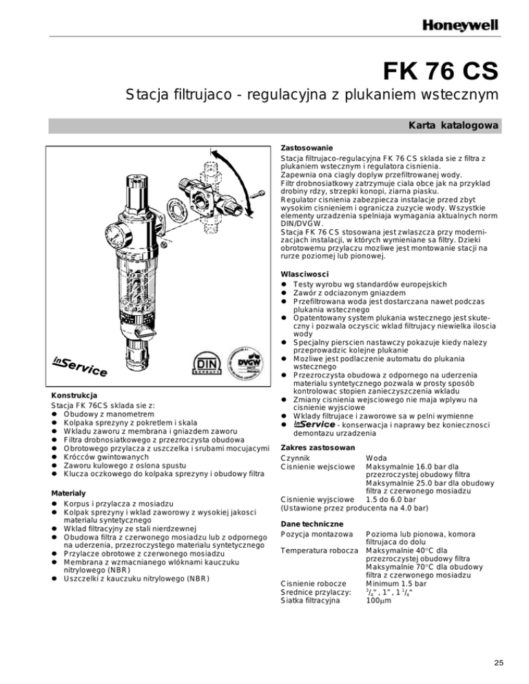 FK 76 CS Stacja filtrujaco - regulacyjna z plukaniem wstecznym Karta katalogowa Zastosowanie Stacja filtrujaco-regulacyjna FK 76 CS sklada sie z filtra z plukaniem wstecznym i regulatora cisnienia. Zapewnia ona ciagly doplyw przefiltrowanej wody. Filtr drobnosiatkowy zatrzymuje ciala obce jak na przyklad drobiny rdzy, strzepki konopi, ziarna piasku. Regulator cisnienia zabezpiecza instalacje przed zbyt wysokim cisnieniem i ogranicza zuzycie wody. Wszystkie elementy urzadzenia spelniaja wymagania aktualnych norm DIN/DVGW. Stacja FK 76 CS stosowana jest zwlaszcza przy modernizacjach instalacji, w których wymieniane sa filtry. Dzieki obrotowemu przylaczu mozliwe jest montowanie stacji na rurze poziomej lub pionowej. Konstrukcja Stacja FK 76CS sklada sie z: l Obudowy z manometrem l Kolpaka sprezyny z pokretlem i skala l Wkladu zaworu z membrana i gniazdem zaworu l Filtra drobnosiatkowego z przezroczysta obudowa l Obrotowego przylacza z uszczelka i srubami mocujacymi l Krócców gwintowanych l Zaworu kulowego z oslona spustu l Klucza oczkowego do kolpaka sprezyny i obudowy filtra Materialy l Korpus i przylacza z mosiadzu l Kolpak sprezyny i wklad zaworowy z wysokiej jakosci materialu syntetycznego l Wklad filtracyjny ze stali nierdzewnej l Obudowa filtra z czerwonego mosiadzu lub z odpornego na uderzenia, przezroczystego materialu syntetycznego l Przylacze obrotowe z czerwonego mosiadzu l Membrana z wzmacnianego wlóknami kauczuku nitrylowego (NBR) l Uszczelki z kauczuku nitrylowego (NBR) Wlasciwosci l Testy wyrobu wg standardów europejskich l Zawór z odciazonym gniazdem l Przefiltrowana woda jest dostarczana nawet podczas plukania wstecznego l Opatentowany system plukania wstecznego jest skuteczny i pozwala oczyscic wklad filtrujacy niewielka iloscia wody l Specjalny pierscien nastawczy pokazuje kiedy nalezy przeprowadzic kolejne plukanie l Mozliwe jest podlaczenie automatu do plukania wstecznego l Przezroczysta obudowa z odpornego na uderzenia materialu syntetycznego pozwala w prosty sposób kontrolowac stopien zanieczyszczenia wkladu l Zmiany cisnienia wejsciowego nie maja wplywu na cisnienie wyjsciowe l Wklady filtrujace i zaworowe sa w pelni wymienne l - konserwacja i naprawy bez koniecznosci demontazu urzadzenia Zakres zastosowan Czynnik Cisnienie wejsciowe Woda Maksymalnie 16.0 bar dla przezroczystej obudowy filtra Maksymalnie 25.0 bar dla obudowy filtra z czerwonego mosiadzu Cisnienie wyjsciowe 1.5 do 6.0 bar (Ustawione przez producenta na 4.0 bar) Dane techniczne Pozycja montazowa Pozioma lub pionowa, komora filtrujaca do dolu Temperatura robocza Maksymalnie 40°C dla przezroczystej obudowy filtra Maksymalnie 70°C dla obudowy filtra z czerwonego mosiadzu Cisnienie robocze Minimum 1.5 bar 3 Srednice przylaczy: /4" , 1” , 1 1/4" Siatka filtracyjna 100µm 25 Zasada dzialania Stacja filtrujaco-regulacyjna FK 76 CS sklada sie z filtra z plukaniem wstecznym i regulatora cisnienia. Strumien wody przeplukujacy filtr ma kierunek przeciwny do kierunku przeplywu podczas normalnej pracy filtra (proces plukania - reczne otwarcie zaworu spustowego). Pozwala to na skuteczne zrzucenie do scieku zanieczyszczen mechanicznych osadzonych na siatce filtracyjnej. Zintegrowany regulator cisnienia dziala na zasadzie równowagi sil - sila oddzialywujaca na membrane równowazona jest przez sile sprezyny nastawnej. Wartosc cisnienia wejsciowego nie ma wplywu na otwieranie lub zamykanie zaworu i z tego powodu zmiany cisnienia wejsciowego nie maja wplywu na cisnienie wyjsciowe. Przy zamknietych wszystkich odbiorach zawór regulacyjny zamyka sie tak, ze wartosc cisnienia w zamknietej czesci instalacji jest równa wartosci zadanej na pokretle. Wielkosci przylaczy Wielkosc nominalna Ciezar ok. Wymiary (mm) R DN (kg) /4" 20 3.9 1" 25 4.0 11/4" 32 4.1 L T 158 95 177 493 363 97 179 95 177 493 363 97 197 99 181 493 363 97 t H h D Szczytowy przeplyw (m3/h) zgodn. z norm. DIN 1988, cz. 5 Instalacje domowe Instalacje przemyslowe Wartosc kvs 3 2.9 3.3 4.7 5.4 7.2 8.6 5.5 6.0 6.5 Oznaczenie: FK 76 CS - ... AA = wielkosc przylacza R * mozliwosc wymiany wkladu filtracyjnego jako czesci zamiennej Akcesoria Z 11 S ZR 10 K FT 09 RS Z 11 S FT 09 RS RV 277 VST 06 B 26 Automat do plukania wstecznego Do automatycznego czyszczenia filtra w ustalonych okresach czasu Dwustronny klucz oczkowy Do zdejmowania obudowy filtra i kolpaka sprezyny Obudowa filtra z czerwonego mosiadzu Dla temperatur do 70°C, dla cisnien roboczych do 25.0 bar RV 277 Wejsciowy zawór zwrotny Rozmiary R 3/4" , R 1” , R 1 1/4" VST 06 Przylacza Z koncówkami gwintowanymi lub do lutowania A = z koncówka gwintowana B = z koncówka do lutowania VST 06 A ZR 10 K przylacza gwintowane dokladnosc filtrowania 100µm * Przyklad instalacji Zasady instalacji l Instalacja pozioma z obudowa filtra skierowana ku dolowi m Polozenie takie zapewnia najwieksza efektywnosc filtrowania l Zamontowanie zaworów odcinajacych po obydwu stronach wodomierza m Umozliwia to ciagly l Zapewnienie dostepu do urzadzenia m Tak by manometr byl dobrze widoczny m Przy przezroczystej obudowie filtra mozna latwo okreslic stopien zanieczyszczenia siatki filtracyjnej m Ulatwia konserwacje i kontrole l Montaz bezposrednio za wodomierzem m Zgodnie z DIN 1988, Czesc 2 Typowe zastosowania Stacja filtrujaco-regulacyjna FK 76 CS moze byc montowana we wszystkich miejscach, w których zalecane jest stosowanie filtrów, regulatorów cisnienia lub kombinacji tych urzadzen. Sprawdza sie zwlaszcza we wszystkich typach instalacji domowych, pozwalajac zachowac zgodnosc z obowiazujacymi normami oraz w wybranych zastosowaniach przemyslowych. Stacja FK 76 CS jest instalowana: l W istniejacej instalacji (rury metalowe, plastikowe lub miedziane) l Do zabudowy poziomej i pionowej w instalacji l W miejscach o ograniczonym dostepie np. przy malej odleglosci od muru l W celu zapewnienia niskiego poziomu halasu, gdy cisnienie statyczne w punktach poboru przekracza 5.0 bar l Gdy cisnienie statyczne przekracza maksymalne