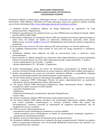 REGULAMIN ZWIEDZANIA FABRYKI SAMOCHODÓW UŻYTKOWYCH VOLKSWAGEN POZNAŃ Zwiedzanie zakładu produkcyjnego Volkswagen Poznań w Antoninku jest organizowane przez Dział Komunikacji- Public Relations. Wszystkie informacje dotyczące zasad oraz regulamin spotkań znajdują się na stronie internetowej http://www.volkswagen-poznan.pl/zwiedzanie_zakladu. 1. Ustalenie terminu zwiedzania odbywa się drogą telefoniczną po zapoznaniu się osób zainteresowanych z Regulaminem. 2. Osobami upoważnionymi do ustalenia terminu są: Jerzy Włodarczyk oraz Maciej Łuczewski- telefon 61-871-4078 61-887-2549. 3. Warunkiem niezbędnym do zwiedzenia Fabryki VWP jest przesłanie formularza zgłoszeniowego na adres firmy nie później niż tydzień po dokonaniu telefonicznej rezerwacji, adres poczty elektronicznej: [email protected]. Niedopełnienie tej formalności oznacza rezygnację ze zwiedzania. 4. Grupa może liczyć minimum 10 osób, maksimum 30 osób [wliczając w to również opiekunów]. 5. Ze względów bezpieczeństwa osoby poniżej 15 roku życia nie mogą uczestniczyć w zwiedzaniu Fabryki. 6. Zwiedzanie Zakładu może odbywać się tylko po wyznaczonej trasie, w obecności osoby oprowadzającej. 7. Przed wejściem na zakład niezbędne jest wskazanie osoby odpowiedzialnej za grupę zwiedzającą [Podczas wycieczki obecna musi być osoba zgłaszająca grupę] • grupa pełnoletnia -1 opiekun, • grupa niepełnoletnia ( do 15 osób) – 1 opiekun, • grupa niepełnoletnia ( 15 - 30 osób) – 2 opiekunów. 8. Osoba oprowadzająca grupę ma prawo do odmówienia oprowadzenia na Zakład osób, w stosunku, do których istnieje podejrzenie, że są pod wpływem alkoholu bądź środków odurzających. 9. Osoba oprowadzająca ma prawo do przerwania zwiedzania Zakładu w przypadkach rażącego łamania zasad bezpieczeństwa lub nieprzestrzegania zasad regulaminu.. 10. W hali Działu Budowy Karoserii obowiązuje bezwzględny nakaz noszenia okularów ochronnych (okulary wypożycza VWP). Volkswagen Poznań nie ponosi odpowiedzialności za ewentualne uszkodzenie ubrania spowodowane iskrami odpryskowymi. 11. Na terenie Fabryki VWP obowiązuje kategoryczny zakaz rejestrowania obrazu i dźwięku, w szczególności zakaz wnoszenia na teren fabryki: • aparatów fotograficznych, • dyktafonów, • telefonów komórkowych z wbudowanym aparatem fotograficznym, • kamer video. 12. Podczas zwiedzania zakładu VWP obowiązuje zakaz palenia papierosów. 13. Na terenie zakładu VWP istnieje wzmożony ruch samochodów ciężarowych, wózków widłowych oraz innych pojazdów uczestniczących w procesie produkcji. Każdy taki pojazd jest uprzywilejowany, uczestnicy wycieczki są zobowiązani do ustąpienia pierwszeństwa, oraz do niezakłócania procesu produkcji. 14. VWP nie ponosi odpowiedzialności za: • pozostawione przez zwiedzających przedmioty na terenie zakładu. • szkody poniesione przez zwiedzających na skutek nie przestrzegania niniejszego regulaminu i powszechnych zasad bezpieczeństwa. 15. Opiekun grupy jest zobowiązany do okazania polisy ubezpieczeniowej. 16. Zwiedzanie zakładu przewidziane jest wyłącznie dla grup zorganizowanych. Fabryka nie pobiera opłat za organizację zwiedzania, oraz nie prowadzi działalności komercyjnej w tym zakresie ( np. za pośrednictwem biur podróży).