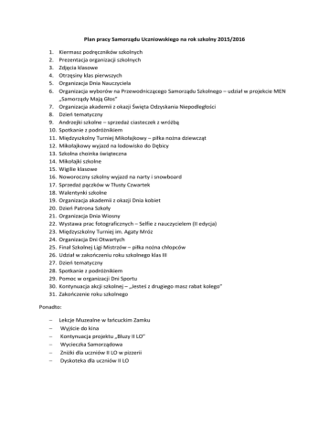 Plan pracy Samorządu Uczniowskiego na rok szkolny 2015/2016 1. 2. 3. 4. 5. 6. 7. 8. 9. 10. 11. 12. 13. 14. 15. 16. 17. 18. 19. 20. 21. 22. 23. 24. 25. 26. 27. 28. 29. 30. 31. Kiermasz podręczników szkolnych Prezentacja organizacji szkolnych Zdjęcia klasowe Otrzęsiny klas pierwszych Organizacja Dnia Nauczyciela Organizacja wyborów na Przewodniczącego Samorządu Szkolnego – udział w projekcie MEN „Samorządy Mają Głos” Organizacja akademii z okazji Święta Odzyskania Niepodległości Dzień tematyczny Andrzejki szkolne – sprzedaż ciasteczek z wróżbą Spotkanie z podróżnikiem Międzyszkolny Turniej Mikołajkowy – piłka nożna dziewcząt Mikołajkowy wyjazd na lodowisko do Dębicy Szkolna choinka świąteczna Mikołajki szkolne Wigilie klasowe Noworoczny szkolny wyjazd na narty i snowboard Sprzedaż pączków w Tłusty Czwartek Walentynki szkolne Organizacja akademii z okazji Dnia kobiet Dzień Patrona Szkoły Organizacja Dnia Wiosny Wystawa prac fotograficznych – Selfie z nauczycielem (II edycja) Międzyszkolny Turniej im. Agaty Mróz Organizacja Dni Otwartych Finał Szkolnej Ligi Mistrzów – piłka nożna chłopców Udział w zakończeniu roku szkolnego klas III Dzień tematyczny Spotkanie z podróżnikiem Pomoc w organizacji Dni Sportu Kontynuacja akcji szkolnej – „Jesteś z drugiego masz rabat kolego” Zakończenie roku szkolnego Ponadto: − − − − − − Lekcje Muzealne w łańcuckim Zamku Wyjście do kina Kontynuacja projektu „Bluzy II LO” Wycieczka Samorządowa Zniżki dla uczniów II LO w pizzerii Dyskoteka dla uczniów II LO