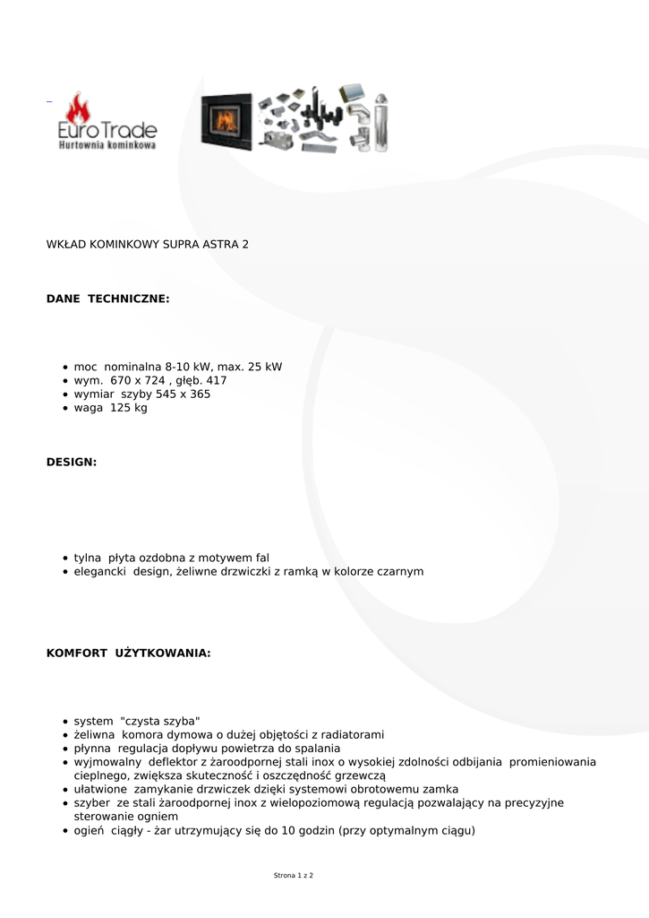 WKŁAD KOMINKOWY SUPRA ASTRA 2 DANE TECHNICZNE: moc nominalna 8-10 kW, max. 25 kW wym. 670 x 724 , głęb. 417 wymiar szyby 545 x 365 waga 125 kg DESIGN: tylna płyta ozdobna z motywem fal elegancki design, żeliwne drzwiczki z ramką w kolorze czarnym KOMFORT UŻYTKOWANIA: system "czysta szyba" żeliwna komora dymowa o dużej objętości z radiatorami płynna regulacja dopływu powietrza do spalania wyjmowalny deflektor z żaroodpornej stali inox o wysokiej zdolności odbijania promieniowania cieplnego, zwiększa skuteczność i oszczędność grzewczą ułatwione zamykanie drzwiczek dzięki systemowi obrotowemu zamka szyber ze stali żaroodpornej inox z wielopoziomową regulacją pozwalający na precyzyjne sterowanie ogniem ogień ciągły - żar utrzymujący się do 10 godzin (przy optymalnym ciągu) Strona 1 z 2 WYPOSAŻENIE: tylna żeliwna płyta oraz boki z możliwością demontażu od środka kołnierz wylotu dymu o średnicy 180 mm szyber ze stali żaroodpornej inox żeliwne wilki umocowane na stałe wyjmowany żeliwny ruszt wysuwany pojemny popielnik OPCJE: dystrybutor gorącego powietrza nóżki stalowa izolacja UWAGA:KAŻDY PRODUKT SPRZEDAWANY PRZEZ NASZĄ HURTOWNIĘ ZOSTANIE INDYWIDUALNIE DOPASOWANY CENOWO DO PAŃSTWA POTRZEB,ORAZ AKTUALNEJ SYTUACJI NA RYNKU. ISTNIEJE MOŻLIWOŚĆ INDYWIDUALNEGO USTALENIA RABATU. W CELU TYM PROSIMY O KONTAKT Z NASZYM BIUREM: TEL.535-651-007 lub [email protected] Strona 2 z 2