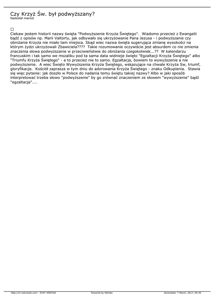 Czy Krzyż Św. był podwyższany? Nadesłał marost Ciekaw jestem historii nazwy święta "Podwyższenie Krzyża Świętego". Wiadomo przecież z Ewangelii bądź z opisów np. Marii Valtorty, jak odbywało się ukrzyżowanie Pana Jezusa - i podwyższanie czy obniżanie Krzyża nie miało tam miejsca. Skąd wiec nazwa święta sugerująca zmianę wysokości na którym żydzi ukrzyżowali Zbawiciela???? Takie rozumowanie oczywiście jest absurdem co nie zmienia znaczenia słowa podwyższanie w przeciwieństwie do obniżania czegokolwiek...?? W kalendarzu francuskim i tak samo we mszaliku pod ta sama data widnieje święto "Egzaltacji Krzyża Świętego" albo "Triumfu Krzyża Świętego" - a to przecież nie to samo. Egzaltacja, bowiem to wywyższenie a nie podwyższenie. A wiec Święto Wywyższenia Krzyża Świętego, wskazujące na chwale Krzyża Sw, triumf, gloryfikacje. Kościół zaprasza w tym dniu do adorowania Krzyża Świętego - znaku Odkupienia. Stawia się więc pytanie: jak doszło w Polsce do nadania temu świętu takiej nazwy? Albo w jaki sposób interpretować trzeba słowo "podwyższenie" by go zrównać znaczeniem ze słowem "wywyższenie" bądź "egzaltacja".... http://m-ostrowski.com - STAT VERITAS Powered by Mambo Generated: 7 March, 2017, 09:45