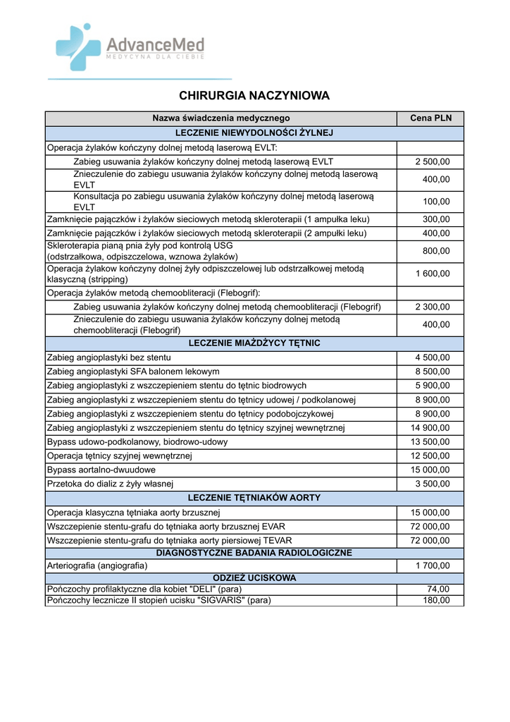 CHIRURGIA NACZYNIOWA Nazwa świadczenia medycznego Cena PLN LECZENIE NIEWYDOLNOŚCI ŻYLNEJ Operacja żylaków kończyny dolnej metodą laserową EVLT: Zabieg usuwania żylaków kończyny dolnej metodą laserową EVLT Znieczulenie do zabiegu usuwania żylaków kończyny dolnej metodą laserową EVLT Konsultacja po zabiegu usuwania żylaków kończyny dolnej metodą laserową EVLT Zamknięcie pajączków i żylaków sieciowych metodą skleroterapii (1 ampułka leku) Zamknięcie pajączków i żylaków sieciowych metodą skleroterapii (2 ampułki leku) Skleroterapia pianą pnia żyły pod kontrolą USG (odstrzałkowa, odpiszczelowa, wznowa żylaków) Operacja żylakow kończyny dolnej żyły odpiszczelowej lub odstrzałkowej metodą klasyczną (stripping) Operacja żylaków metodą chemoobliteracji (Flebogrif): Zabieg usuwania żylaków kończyny dolnej metodą chemoobliteracji (Flebogrif) Znieczulenie do zabiegu usuwania żylaków kończyny dolnej metodą chemoobliteracji (Flebogrif) LECZENIE MIAŻDŻYCY TĘTNIC 2 500,00 400,00 100,00 300,00 400,00 800,00 1 600,00 2 300,00 400,00 Zabieg angioplastyki bez stentu 4 500,00 Zabieg angioplastyki SFA balonem lekowym 8 500,00 Zabieg angioplastyki z wszczepieniem stentu do tętnic biodrowych 5 900,00 Zabieg angioplastyki z wszczepieniem stentu do tętnicy udowej / podkolanowej 8 900,00 Zabieg angioplastyki z wszczepieniem stentu do tętnicy podobojczykowej 8 900,00 Zabieg angioplastyki z wszczepieniem stentu do tętnicy szyjnej wewnętrznej 14 900,00 Bypass udowo-podkolanowy, biodrowo-udowy 13 500,00 Operacja tętnicy szyjnej wewnętrznej 12 500,00 Bypass aortalno-dwuudowe 15 000,00 Przetoka do dializ z żyły własnej 3 500,00 LECZENIE TĘTNIAKÓW AORTY Operacja klasyczna tętniaka aorty brzusznej 15 000,00 Wszczepienie stentu-grafu do tętniaka aorty brzusznej EVAR 72 000,00 Wszczepienie stentu-grafu do tętniaka aorty piersiowej TEVAR DIAGNOSTYCZNE BADANIA RADIOLOGICZNE Arteriografia (angiografia) ODZIEŻ UCISKOWA Pończochy profilaktyczne dla kobiet "DELI" (para) Pończochy lecznicze II stopień ucisku "SIGVARIS" (para) 72 000,00 1 700,00 74,00 180,00