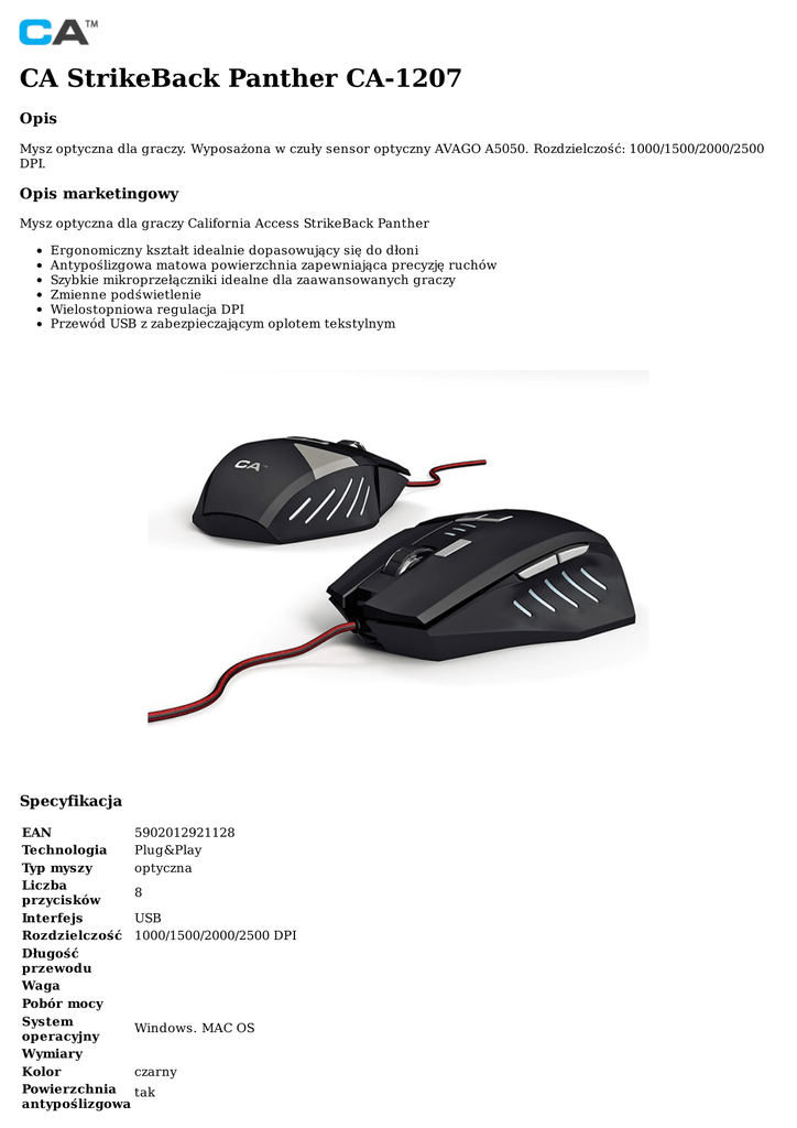 CAStrikeBackPantherCA-1207 Opis Myszoptycznadlagraczy.WyposażonawczułysensoroptycznyAVAGOA5050.Rozdzielczość:1000/1500/2000/2500 DPI. Opismarketingowy MyszoptycznadlagraczyCaliforniaAccessStrikeBackPanther Ergonomicznykształtidealniedopasowującysiędodłoni Antypoślizgowamatowapowierzchniazapewniającaprecyzjęruchów Szybkiemikroprzełącznikiidealnedlazaawansowanychgraczy Zmiennepodświetlenie WielostopniowaregulacjaDPI PrzewódUSBzzabezpieczającymoplotemtekstylnym Specyfikacja EAN 5902012921128 Technologia Plug&Play Typmyszy optyczna Liczba 8 przycisków Interfejs USB Rozdzielczość 1000/1500/2000/2500DPI Długość przewodu Waga Pobórmocy System Windows.MACOS operacyjny Wymiary Kolor czarny Powierzchnia tak antypoślizgowa Ilośćklatekna 3600FPS sekundę metalowastrukturapodstawyzapewniającaprawidłowewyważenieurządzenia,zmienne Pozostałe podświetlenie,czułysensoroptycznyAVAGOA5050,przewódUSBzzabezpieczającymoplotem cechy tekstylnym, e-mail:[email protected] ©2015-2017CaliforniaAccessWszystkieprawazastrzeżone