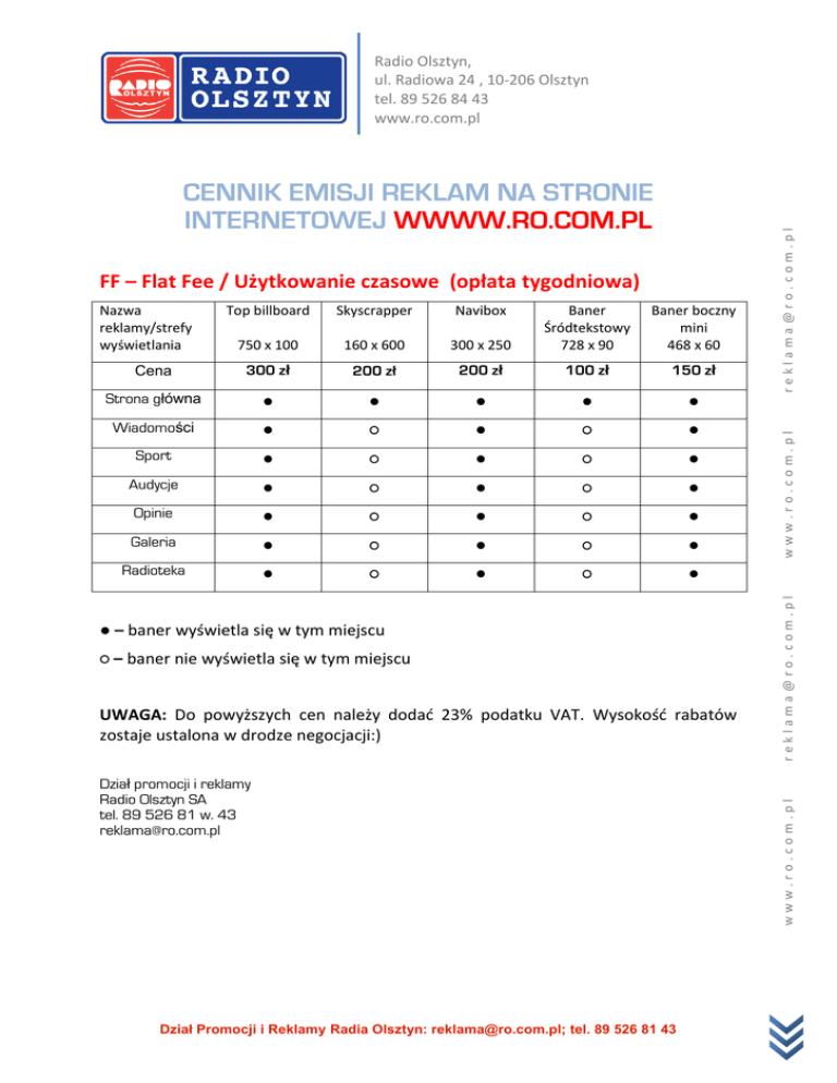 Top billboard Skyscrapper Navibox 300 x 250 Baner Śródtekstowy 728 x 90 Baner boczny mini 468 x 60 750 x 100 160 x 600 Cena 300 zł 200 zł 200 zł 100 zł 150 zł Strona główna ● ● ● ● ● Wiadomości ● ○ ● ○ ● Sport ● ○ ● ○ ● Audycje ● ○ ● ○ ● Opinie ● ○ ● ○ ● Galeria ● ○ ● ○ ● Radioteka ● ○ ● ○ ● ● – baner wyświetla się w tym miejscu ○ – baner nie wyświetla się w tym miejscu UWAGA: Do powyższych cen należy dodać 23% podatku VAT. Wysokość rabatów zostaje ustalona w drodze negocjacji:) Dział promocji i reklamy Radio Olsztyn SA tel. 89 526 81 w. 43 [email protected] Dział Promocji i Reklamy Radia Olsztyn: [email protected]; tel. 89 526 81 43 www.ro.com.pl Nazwa reklamy/strefy wyświetlania [email protected] FF – Flat Fee / Użytkowanie czasowe (opłata tygodniowa) www.ro.com.pl CENNIK EMISJI REKLAM NA STRONIE INTERNETOWEJ WWWW.RO.COM.PL [email protected] Radio Olsztyn, ul. Radiowa 24 , 10-206 Olsztyn tel. 89 526 84 43 www.ro.com.pl
