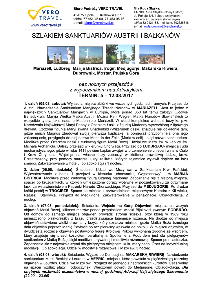 Biuro Podróży VERO TRAVEL www.verotravel.pl 45-075 Opole, ul. Krakowska 37 tel/fax 77 454 45 69, 77 453 95 76 e-mail: [email protected] filia Ruda Śląska: 41-709 Ruda Śląska (Nowy Bytom) ul. Pokoju 1/4, I piętro (zabytkowa kamienica z zegarem słonecznym) tel/fax 32 2421183, tel. kom. 602526316 e-mail: [email protected] SZLAKIEM SANKTUARIÓW AUSTRII I BAŁKANÓW Mariazell, Ludbreg, Marija Bistrica,Trogir, Medjugorje, Makarska Riwiera, Dubrownik, Mostar, Ptujska Góra bez nocnych przejazdów z wypoczynkiem nad Adriatykiem TERMIN: 5 – 12.08.2017 1. dzień (05.08, sobota): Wyjazd z miejsca zbiórki we wczesnych godzinach rannych. Przejazd do Austrii. Nawiedzenie Sanktuarium Maryjnego Trzech Narodów w MARIAZELL. Jest to jedno z największych Sanktuariów Maryjnych w Europie, które ponad 850 lat temu założyli Ojcowie Benedyktyni. Maryja Wielka Matka Austrii, Można Pani Węgier, Matka Narodów Słowiańskich to wszystkie tytuły, jakie nadano Madonnie z Mariazell. W skład kompleksu wchodzi bazylika p.w. Narodzenia Najświętszej Maryi Panny z Ołtarzem Łaski z figurką Madonny wyrzeźbioną z lipowego drewna. Czczona figurka Maryi zwana Gnadenbild (Wizerunek Łaski) znajduje się dokładnie tam, gdzie mnich Magnus zbudował swoją pierwszą kapliczkę, a ponieważ przypominała ona jego zakonną celę, przylgnęła do niej nazwa Maria In der Zelle (Maria w celi) - stąd nazwa sanktuarium. Modlitwa przed Ołtarzem Łaski z cudowną figurą Matki Bożej. Udział we Mszy św. w kaplicy św. Michała Archanioła. Dalszy przejazd w kierunku Chorwacji. Przyjazd do LUDBREGU- miejsca cudu eucharystycznego, gdzie w roku 1411 pewien kapłan zwątpił w przemienienie chleba i wina w Ciało i Krew Chrystusa. Wątpiąc, na własne oczy zobaczył w kielichu prawdziwą ludzką krew. Przestraszony, przy pomocy murarza, ukrył relikwie, których tajemnicę wyjawił dopiero na łożu śmierci. Zakwaterowanie w hotelu, obiadokolacja i 1 nocleg. 2. dzień (06.08, niedziela): Śniadanie. Udział we Mszy św. w Sanktuarium Krwi Pańskiej. Wykwaterowanie z hotelu i przejazd w kierunku „chorwackiej Częstochowy” - w MARIJA BISTRICA, Modlitwa przed cudowną figurą Czarnej Madonny. Zapoznanie się z historią miejsca, spacer po krużgankach, w których umieszczone obrazy wotywne w podziękowaniu za otrzymane łaski za wstawiennictwem Patronki Narodu Chorwackiego. Przyjazd do MEDJUGORIE. Po drodze krótki postój w TROGIRZE. Spacer po mieście z przewodnikiem miejscowym: Katedra z XII wieku, Ratusz i Starówka. Przyjazd do Medjugorje. Zakwaterowanie w pensjonacie. Obiadokolacja. 2 nocleg. 3. dzień (07.08, poniedziałek): Śniadanie. Wejście na Górę Objawień: miejsca pierwszych objawień Matki Bożej, kilkaset metrów ponad przysiółkiem wioski Bijakovici zwanym PODBRDO. Od domów do samego miejsca objawień prowadzi stroma ścieżka, przy której w 1989 roku umieszczono płaskorzeźby z brązu przedstawiające tajemnice różańca. Na drodze do miejsca objawień ustawiono wielki drewniany krzyż, który oznacza miejsce, gdzie Matka Boża trzeciego dnia objawień poprzez Mariję Pavlović po raz pierwszy wezwała do pokoju. W miejscu objawień, w dwudziestą rocznicę objawień postawiono figurę Królowej Pokoju wykonaną zgodnie ze wzorcem, który znajduje się przed kościołem parafialnym. Spotkanie z Podbrdem jest dla pielgrzymów spotkaniem z Matką Bożą dzięki modlitwie prywatnej i modlitwie różańcowej. Spacer po miasteczku. Zapoznanie się z najważniejszymi dla pielgrzyma miejscami kultu maryjnego. Czas na indywidualną modlitwę. Obiadokolacja. Udział w modlitwie różańcowej i Mszy św. 3 nocleg. 4. dzień (08.08, wtorek): Śniadanie. Wyjazd do Dalmacji na MAKARSKĄ RIWIERĘ. Nawiedzenie sanktuarium Matki Boskiej z Lourdes w VEPRIĆ- miejscu, które powstało w pięćdziesiątą rocznicę objawień w Lourdes. Udział we Mszy św. Przejazd do jednego z nadmorskich kurortów. Czas wolny na spacer wzdłuż plaży i odpoczynek. Wieczorem powrót do Medjugorie. Obiadokolacja. Dla chętnych możliwość uczestnictwa w nocnej, godzinnej Adoracji Najświętszego Sakramentu (22.00 – 23.00) Biuro Podróży VERO TRAVEL www.verotravel.pl 45-075 Opole, ul. Krakowska 37 tel/fax 77 454 45 69, 77 453 95 76 e-mail: [email protected] filia Ruda Śląska: 41-709 Ruda Śląska (Nowy Bytom) ul. Pokoju 1/4, I piętro (zabytkowa kamienica z zegarem słonecznym) tel/fax 32 2421183, tel. kom. 602526316 e-mail: [email protected] 5. dzień (09.08, środa): Wyjście (w godzinach rannych) na Drogę Krzyżową na górę KRIZEVAC. Križevac to wzgórze wznoszące się ponad Medjugoriem (520 m), na którym parafianie 15 marca 1934 roku wznieśli krzyż ze zbrojonego betonu. Na krzyżu wyryto napis: «Jezusowi Chrystusowi, Odkupicielowi rodzaju ludzkiego na znak wiary, miłości i nadziei, na pamiątkę 1900 rocznicy męki Jezusowej». W cokół krzyża zostały wmurowane relikwie Krzyża Świętego otrzymane na tę okazję z Rzymu. Od początku objawień Matki Bożej na Križevacu zaczęto odmawiać Drogę Krzyżową. Na początku stacje oznaczone były drewnianymi krzyżami, a w 1988 roku umieszczono tam płaskorzeźby wykonane z brązu. Na każdej z nich (oprócz modlitwy w ogrodzie Getsemani) znajduje się postać Matki Bożej. Dla pielgrzymów Križevac oznacza wezwanie, by spotkać Jezusa w Jego męce i odkryć Jego miłość. Powrót do pensjonatu na śniadanie. Program Duszpasterski w MEDJUGORIE. Wieczorami udział w modlitwie różańcowej, Mszy św. i wspólnych śpiewach. Obiadokolacja. 5 nocleg. 6. dzień (10.08, czwartek): Śniadanie. Przejazd do DUBROWNIKA, miasta potocznie nazywanego „Perłą Adriatyku” Zwiedzanie starówki z przewodnikiem miejscowym (Studnia Onufrego, katedra, kościół św. Błażeja, port). Udział we Mszy św. w kościele św. Błażeja – głównego Patrona miasta. Czas wolny. Przyjazd do Medjugorie. Obiadokolacja. 6 nocleg. 7. dzień (11.08, piątek): Śniadanie.