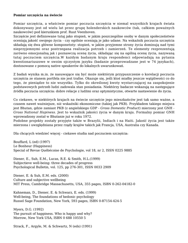 Pomiar szczęścia na świecie Pomiar szczęścia, a właściwie pomiar poczucia szczęścia w niemal wszystkich krajach świata dokonywany jest od wielu lat przez grupę holenderskich naukowców (tak, całkiem poważnych naukowców) pod kierunkiem prof. Ruut Veenhoven. Szczęście jest definiowane tutaj jako stopień, w jakim poszczególne osoby w danym społeczeństwie oceniają jakość swojego życia - czy ogólnie oceniają je jako udane. Na wskaźnik poczucia szczęścia składają się dwa główne komponetnty: stopień, w jakim przyjemne strony życia dominują nad tymi nieprzyjemnymi oraz postrzegana realizacja potrzeb i zamierzeń. Te elementy rezprezentują zarówno emocjonalną jak i poznawczą ocenę życia, składając się na ogólną ocenę życia, nazywaną tutaj poczuciem szczęścia.W każdym badanym kraju respondenci odpowiadają na pytania kwestionariuszowe w swoim ojczystym języku (badanie przeprowadzane jest w 74 językach), dostosowane z pomocą native speakerów do lokalnych uwarunkowań. Z badań wynika m.in. że nasuwające się być może niektórym przypuszczenie o korelacji poczucia szczęścia ze stanem portfela nie jest trafne. Okazuje się, jeśli ktoś miałby jeszcze wątpliwości co do tego, że pieniądze to nie wszystko. Tylko do określonej kwoty wystarczającej na zaspokojenie podstawowych potrzeb ludzi zadowala stan posiadania. Niektórzy badacze wskazują na następujące źródła poczucia szczęścia: dobre relacje z ludźmi oraz optymistyczne, otwarte nastawienie do życia. Co ciekawe, w niektórych krajach na świecie szczęście jego mieszkańców jest tak samo ważne, a czasem nawet ważniejsze, niż wskaźniki ekonomiczne (takiej jak PKB). Przykładem takiego miejsca jest Bhutan, gdzie zamiast PKB (z angielskiego GDP - Gross Domestic Product) mierzony jest GNH Gross National Hapiness. Jest to wskaźnik jakości życia w danym kraju. Formalny pomiar GNH wprowadzony został w Bhutanie już w roku 1972. Podobne projekty zostały przyjęte także w Brazylii, Indiach i na Haiti. Jakość życia jest także mierzona i uwzględniana przez rządy krajów takich jak Francja, USA, Australia czy Kanada. Dla chcących wiedzieć więcej - ciekawe studia nad poczuciem szczęścia: Bouffard, L (ed) (1997) Le Bonheur (Happiness) Special of Revue Québécoise de Psychologie, vol 18, nr 2, ISSN 0225 9885 Diener, E., Suh, E.M., Lucas, R.E. & Smith, H.L.(1999) Subjectieve well-being: three decades of progress Psychological Bulletin, vol. 125, pp 276-301, ISSN 0033 2909 Diener, E. & Suh, E.M. eds. (2000) Culture and subjective wellbeing MIT Press, Cambridge Massachusetts, USA, 355 pages, ISBN 0-262-04182-0 Kahneman, D., Diener, E. & Schwarz, E. eds. (1999) Well-being, The foundations of hedonic psychology Russel Sage Foundation, New York, 593 pages, ISBN 0-87154-424-5 Myers, D.G. (1992) The pursuit of happiness. Who is happy and why? Morrow, New York USA, ISBN 0 688 10550 5 Strack, F., Argyle, M. & Schwartz, N (eds) (1991) Subjective well-being: An interdisciplinairy perspective Pergamon Press, London UK, 291 pages ISBN 0 08 037264 3 Veenhoven, R.(1984) Conditions of happiness Kluwer academic, Dordrecht Netherlands, 1984, 461 pages, ISBN 90 277 1792 3 Veenhoven, R. (1997) Advances in the understanding of happiness Published in French in Revue Québécoise de psychologie, vol 18, pp.29-74 Ostatni artykuł dostępny jest do pobrania poniżej (w j. angielskim).