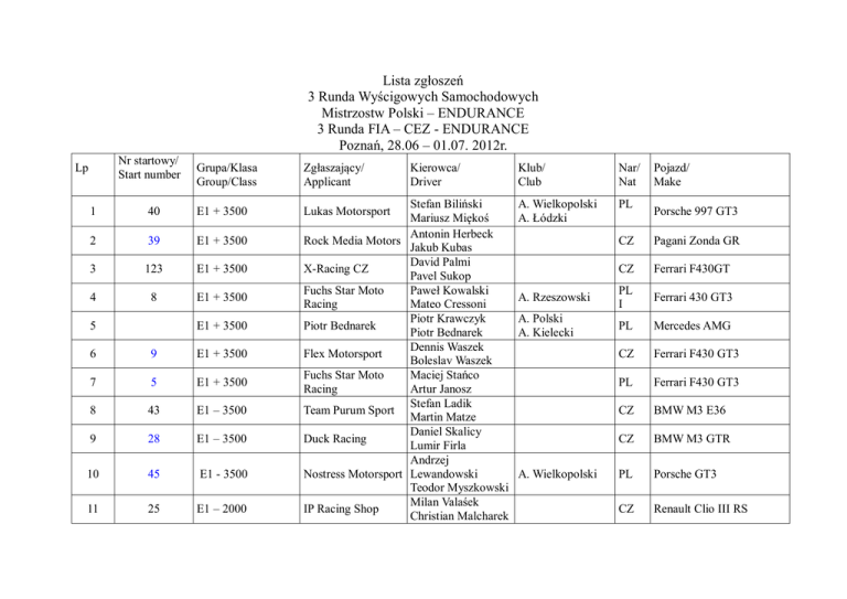 Lista zgłoszeń 3 Runda Wyścigowych Samochodowych Mistrzostw Polski – ENDURANCE 3 Runda FIA – CEZ - ENDURANCE Poznań, 28.06 – 01.07. 2012r. Nr startowy/ Start number Lp Grupa/Klasa Group/Class Zgłaszający/ Applicant Lukas Motorsport 1 40 E1 + 3500 2 39 E1 + 3500 3 123 E1 + 3500 4 8 E1 + 3500 5 E1 + 3500 6 9 E1 + 3500 7 5 E1 + 3500 8 43 E1 – 3500 9 28 E1 – 3500 10 45 E1 - 3500 11 25 E1 – 2000 Kierowca/ Driver Stefan Biliński Mariusz Miękoś Antonin Herbeck Rock Media Motors Jakub Kubas David Palmi X-Racing CZ Pavel Sukop Fuchs Star Moto Paweł Kowalski Racing Mateo Cressoni Piotr Krawczyk Piotr Bednarek Piotr Bednarek Dennis Waszek Flex Motorsport Boleslav Waszek Fuchs Star Moto Maciej Stańco Racing Artur Janosz Stefan Ladik Team Purum Sport Martin Matze Daniel Skalicy Duck Racing Lumir Firla Andrzej Nostress Motorsport Lewandowski Teodor Myszkowski Milan Valaśek IP Racing Shop Christian Malcharek Klub/ Club Nar/ Nat A. Wielkopolski A. Łódzki PL Pojazd/ Make Porsche 997 GT3 CZ Pagani Zonda GR CZ Ferrari F430GT A. Rzeszowski PL I Ferrari 430 GT3 A. Polski A. Kielecki PL Mercedes AMG CZ Ferrari F430 GT3 PL Ferrari F430 GT3 CZ BMW M3 E36 CZ BMW M3 GTR PL Porsche GT3 CZ Renault Clio III RS A. Wielkopolski 12 66 E1 – 2000 13 89 E1 – 2000 14 44 E1 – 2000 15 113 E1 – 2000 Petr Mandelik Josef Zaruba Marek Fried KT Motosport s.r.o Milan Braun Basen Hurt PMR Marek Rzepecki Team Wojciech Wetula Paweł Tarnawski Nostress Motorsport Adam Głowiński KT Motosport s.r.o A. Wielkopolski CZ Lotus Exige GT-R CZ Lotus Exige PL Renault Clio III RS PL Alfa Romeo 147 Lista zgłoszeń 5 i 6 Runda Wyścigowych Samochodowych Mistrzostw Polski – SPRINT 9 i 10 Runda FIA CEZ - SPRINT Poznań, 28.06 – 01.07. 2012r. Nr startowy/ Start Grupa/Klasa Zgłaszający/ number Group/Class Applicant Lp Kierowca/ Driver Klub/ Club Nar/ Pojazd/ Nat Make 1. 1 5 E1 + 3500 Fuchs Star Moto Racing Artur Janosz A. Kielecki PL Ferrari 430 GT3 2. 2 8 E1 + 3500 Fuchs Star Moto Racing Paweł Kowalski A. Rzeszowski PL Ferrari 430 GT3 3. 3 10 E1 + 3500 Bohemia Racing Team Tomas Kostka CZ Audi A4 4. 4 39 E1 + 3500 Rock Media Motors Antonin Herbeck CZ Pagani Zonda GR 5. 5 96 E1 + 3500 GT 3 Poland Jarosław Budzyński PL 6. 6 60 E1 + 3500 TopCar Machanek Rudolf Machanek 7. 7 21 E1 + 3500 GT 3 Poland Bartosz Opioła A. Rzeszowski PL 8. 8 1 E1 + 3500 Fuchs Star Moto Racing Maciej Stańco A. Kielecki PL Porsche 997 GT3 Porsche 911 GT3 RS Porsche 997 GT3 5i6 Ferrari 430 GT3 9. 9 44 E1 + 3500 Racing Trevor Attila Barta H BMW B6 GT3 9 E1 + 3500 Flex Motorsport Dennis Waszek CZ Ferrari F430 GT3 11. 11 E1 + 3500 Nostress & Premium Motosport Poland Scarpaccio Luis 12. E1 + 3500 Lukas Motorsport Selzer Przemysław PL Mercedes AMG SLS Porsche 911 GT3 R 10. 10 A. Rzeszowski SL A. Wielkopolski 13. 12 43 E1 – 3500 Team Purum Sport Martin Matzke CZ BMW M3 E 36 14. 13 25 E1 – 3500 Senkyr Motosport Michal Harasek CZ BMW M3 E36 GTR 15. 14 23 E1 – 3500 Senkyr Motosport Lukas Vrecka CZ BMW E36 GTR 16. 15 Wycofał E1 – 3500 Senkyr Motosport Milan Braun CZ BMW M3 E36 GTR 17. 16 36 E1 – 3500 K&K Racing Team Zdenek Tesarik CZ BMW Z4 GTR 18. 17 27 E1 – 3500 Duck Racing Peter Kacirek CZ BMW M3 GTR 19. 18 88 E1 – 3500 KT Motosport s.r.o Tomaś Kusy CZ Lotus Evora GT-R 20. 19 45 E1 – 3500 Nostress Motorsport Andrzej Lewandowski PL Porsche GT3 21. 20 147 E1 – 2000 Filip Mocie Filip Mocie PL Renault Clio 22. 21 89 E1 – 2000 KT Motosport s.r.o Marek Fried CZ Lotus Exige 23. 22 66 E1 – 2000 KT Motosport s.r.o Petr Mandelik CZ Lotus Exige GT-R 24. 23 46 E1 – 2000 MARIUS PEDERSEN TEAM Petr Muzik CZ Renault Clio Sport 25. 24 48 E1 – 2000 Cezary Ruszkowski Cezary Ruszkowski PL Lotus Exige 26. 25 47 E1 – 2000 Basen Hurt PMR Team Adam Rzepecki PL Renault Clio III RS 27. 26 144 E1 – 2000 Basen Hurt PMR Team Marcin Scheffler PL Honda Type-R 28. 27 49 E1 – 2000 Basen Hurt PMR Team Maciej Roch-Pietrzak PL Honda Type-R 29. 28 44 E1 – 2000 Basen Hurt PMR Team Marek Rzepecki A. Wielkopolski PL Renault Clio III RS 30. 29 50 E1 – 2000 Waab Motosport Maciej OstojaChyżyński A. Rzemieślnik PL Renault Clio III RS A. Wielkopolski A. Galicyjski A. Rzemieślnik A. Wielkopolski A. Wielkopolski A. Wielkopolski Lista zgłoszeń 5 i 6 Runda Wyścigowych Samochodowych Mistrzostw Polski – Formuł E2-2000 9 i 10 Runda FIA-CEZ Formuła E2-2000 Poznań, 28.06 – 01.07. 2012r. Lp Nr startowy/ Start number Grupa/Klasa Group/Class Zgłaszający/ Applicant Kierowca/ Driver 1 E2 – 2000 Inter Europol Competition 2 E2 – 2000 Chabrmotorsport 3 E2 – 2000 4 Klub/ Club Nar/ Nat Pojazd/ Make Jakub Śmiechowski A. Rzemieślnik PL Formuła Renault Tomaś Chabr junior CZ Tomis AMK ECCE Homo Petr Trnka CZ Gloria C8FT E2 – 2000 Roman Hoffmann Roman Hoffmann A Tatuus Honda 5 E2 – 2000 FRAS MOTORSPORT Sus Antonin CZ Gloria C8FT 6 E2 - 2000 Helga Heinrich Helga Heinrich AMC Schleiz D Formuła Renault 7 E2 - 2000 Matthias Stark Matthias Stark AMC Schleiz D Formuła Renault 8 E2 - 2000 Ulrich Dr Drechsler Ulrich Dr Drechsler AvD D Formuła Renault 9 D3 FORMULASTAR Lapinova Branislava CZ Gloria C8FT 10 D3 FORMULASTAR Hanzl Lukas CZ Gloria C8FT Lista zgłoszeń 3 i 4 Runda Wyścigowego Pucharu Polski Poznań, 28.06 – 01.07. 2012r. LP Nr startowy 1. 3 WPP - 1 N Łukasz Janiak Łukasz Janiak A. Wielkopolski Na Samochód r PL Fiat Cinquecento 2. 4 WPP - 1 N Bartosz Knast A. Wielkopolski PL Fiat Seicento 3. 6 WPP - 1 N Przemysław Kaźmierczak A. Wielkopolski PL Fiat Seicento 4. 7 WPP – 1 N Michał Bordzioł Bartosz Knast Przemysław Kaźmierczak Michał Bordzioł A. Polski PL Fiat Seicento 5. 10 WPP – 1 N Dawid Kaniewski Dawid Kaniewski A. Wielkopolski PL Fiat Seicento 6. 101 WPP – 1 N Mariusz Szkudlarek Mariusz Szkudlarek A. Wielkopolski PL Fiat Seicento 7. 102 WPP – 1 N Arkadiusz Urbański Arkadiusz Urbański A. Wielkopolski PL Fiat Cinquecento 8. 104 WPP – 1 N Michał Bastjan Michał Bastjan A. Rzemieślnik PL Fiat Seicento 9. 106 W