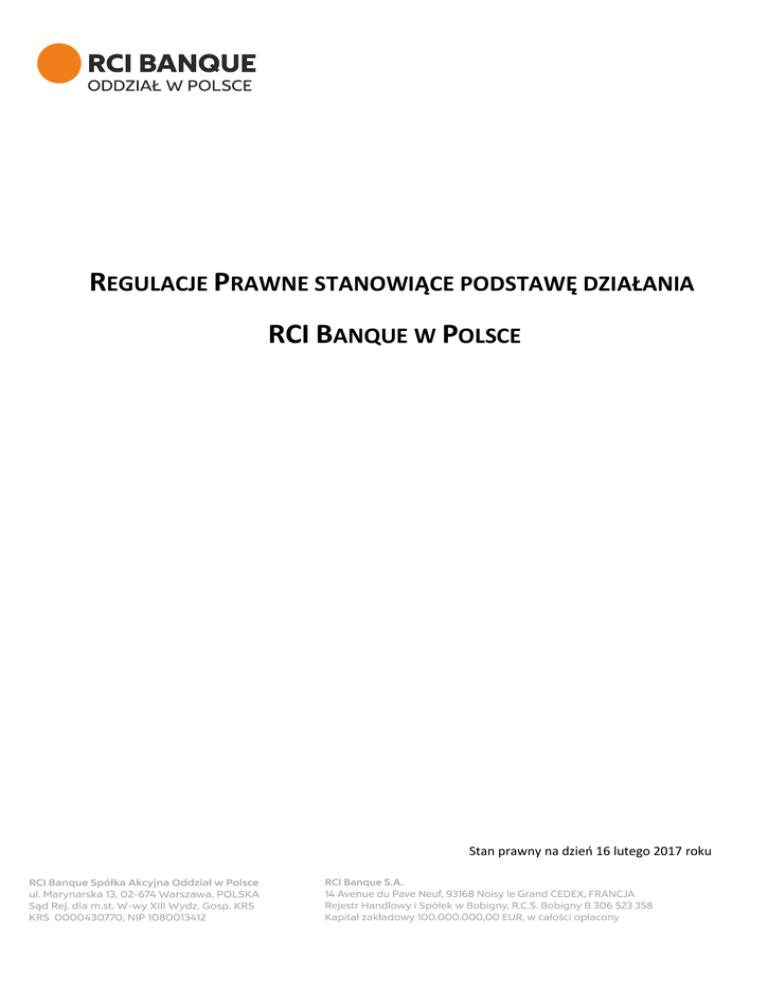 REGULACJE PRAWNE STANOWIĄCE PODSTAWĘ DZIAŁANIA RCI BANQUE W POLSCE Stan prawny na dzień 16 lutego 2017 roku Działalność RCI Banque Spółka Akcyjna Oddział w Polsce regulują przede wszystkim przepisy następujących aktów prawnych: 1. Ustawa z dnia 2 lipca 2004 r. o swobodzie działalności gospodarczej (tj. z dnia 12 października 2016 r., Dz. U. z 2016 r. poz. 1829) -wyciąg przepisów str. 3. 2. Ustawa z dnia 29 sierpnia 1997 r. – Prawo bankowe (tj. z dnia 7 listopada 2015, Dz. U. z 2016 r. poz. 1988) – wyciąg przepisów str.7. 3. Ustawa z dnia 29 sierpnia 1997 roku o Narodowym Banku Polskim (tj. Dz. U. z 2013 r. Nr 1, poz. 908). 4. Ustawa z dnia 21 lipca 2006 roku o nadzorze nad rynkiem finansowym (tj. dnia 17 stycznia 2017 r., Dz.U. z 2017 r. poz. 196 ze zm.). 5. Ustawa z dnia 12 maja 2011 roku o kredycie konsumenckim (tj. z dnia 23 sierpnia 2016 r., Dz.U. z 2016 r. poz. 1528 ze zm.). 6. Ustawa z dnia 29 lipca 2005 roku o ofercie publicznej i warunkach wprowadzania instrumentów finansowych do zorganizowanego systemu obrotu oraz o spółkach publicznych (tj. z dnia 15 września 2016 r. , Dz.U. z 2016 r. poz. 1639). 7. Ustawa z dnia 29 lipca 2005 roku o obrocie instrumentami finansowymi (tj. z dnia 12 września 2016 r., Dz.U. z 2016 r. poz. 1636 ze zm.). 8. Ustawa z dnia 29 lipca 2005 roku o nadzorze nad rynkiem kapitałowym (tj. z dnia 22 lipca 2016 r., Dz.U. z 2016 r. poz. 1289 ze zm.). 9. Ustawa z dnia 19 sierpnia 2011 roku o usługach płatniczych (tj. z dnia 29 sierpnia 2016 r., Dz.U. z 2016 r. poz. 1572 ze zm.). 10. Ustawa z dnia 16 listopada 2000 roku o przeciwdziałaniu praniu pieniędzy oraz finansowaniu terroryzmu (tj. z dnia 17 lutego 2016 r., Dz.U. z 2016 r. poz. 299 ze zm.). 11. Ustawa z dnia 16 lutego 2007 roku o ochronie konkurencji i konsumentów ( tj. z dnia 26 stycznia 2017r., Dz.U. z 2017 r. poz. 229 ze zm.). 12. Ustawa z dnia 16 kwietnia 1993 roku o zwalczaniu nieuczciwej konkurencji (Dz. U. z 2003 r. Nr 153, poz. 1503 ze zm.). 13. Ustawa z dnia 15 lutego 1992 roku o podatku dochodowym od osób prawnych (tj. z dnia 26 października 2016 r., Dz.U. z 2016 r. poz. 1888 ze zm.). 14. Ustawa z dnia 29 września 1994 roku o rachunkowości (tj. z dnia 22 czerwca 2016 r., Dz.U. z 2016 r. poz. 1047 ze zm.). 15. Ustawa z dnia 10 czerwca 2016 roku o Bankowym Funduszu Gwarancyjnym, systemie gwarantowania depozytów oraz przymusowej restrukturyzacji (Dz.U. z 2016 r. poz. 996 ze zm.) 16. Ustawa o rozpatrywaniu reklamacji przez podmioty rynku finansowego i o rzeczniku finansowym (tj. z dnia 8 czerwca 2016 r., Dz. U. z 2016 r., poz. 892 ze zm.) 2|S t r o n a WYCIĄG Z PRZEPISÓW Ustawa z dnia 2 lipca 2004 r. o swobodzie działalności gospodarczej (tj. z dnia 12 października 2016 r., Dz. U. z 2016 r. poz. 1829) Rozdział 6. Oddziały i przedstawicielstwa przedsiębiorców zagranicznych. Art. 85 [Oddziały] 1. Dla wykonywania działalności gospodarczej na terytorium Rzeczypospolitej Polskiej przedsiębiorcy zagraniczni mogą, na zasadzie wzajemności, o ile ratyfikowane umowy międzynarodowe nie stanowią inaczej, tworzyć oddziały z siedzibą na terytorium Rzeczypospolitej Polskiej, zwane dalej "oddziałami". 2. Do tworzenia oddziałów przez przedsiębiorców zagranicznych z państw członkowskich Unii Europejskiej, państw Europejskiego Obszaru Gospodarczego nienależących do Unii Europejskiej oraz państw niebędących stronami umowy o Europejskim Obszarze Gospodarczym, którzy mogą korzystać ze swobody przedsiębiorczości na podstawie umów zawartych przez te państwa ze Wspólnotą Europejską i jej państwami członkowskimi, przepis art. 13 ust. 1 stosuje się odpowiednio. Art. 86 [Przedmiot działalności] Przedsiębiorca zagraniczny tworzący oddział może wykonywać działalność gospodarczą wyłącznie w zakresie przedmiotu działalności przedsiębiorcy zagranicznego. Art. 87 [Reprezentacja] Przedsiębiorca zagraniczny tworzący oddział jest obowiązany ustanowić osobę upoważnioną w oddziale do reprezentowania przedsiębiorcy zagranicznego. Art. 88 [Wpis do rejestru] Przedsiębiorca zagraniczny może rozpocząć działalność w ramach oddziału po uzyskaniu wpisu oddziału do rejestru przedsiębiorców. Zasady wpisu do rejestru przedsiębiorców określają przepisy odrębnej ustawy. Art. 89 [Dane przedsiębiorcy] Niezależnie od obowiązków określonych w przepisach o Krajowym Rejestrze Sądowym przedsiębiorca zagraniczny jest obowiązany: 1) podać imię i nazwisko oraz adres na terytorium Rzeczypospolitej Polskiej osoby upoważnionej w oddziale do reprezentowania przedsiębiorcy zagranicznego; 2) dołączyć poświadczony notarialnie wzór podpisu osoby, o której mowa w pkt 1; 3) jeżeli działa na podstawie aktu założycielskiego, umowy lub statutu - złożyć ich odpisy do akt rejestrowych oddziału wraz z uwierzytelnionym tłumaczeniem na język polski; w przypadku gdy przedsiębiorca zagraniczny utworzył na terytorium Rzeczypospolitej Polskiej więcej niż jeden oddział, złożenie tych dokumentów może nastąpić w aktach jednego z oddziałów, z tym że w aktach rejestrowych pozostałych oddziałów należy wskazać ten oddział, w którego aktach złożono wskazane dokumenty, wraz z oznaczeniem sądu, w którym znajdują się akta, i numeru oddziału w rejestrze; 4) jeżeli istnieje lub wykonuje działalność na podstawie wpisu do rejestru - złożyć do akt rejestrowych oddziału odpis z tego rejestru wraz z uwierzytelnionym tłumaczeniem na język polski; w przypadku gdy przedsiębiorca zagraniczny utworzył na terytorium Rzeczypospolitej Polskiej więcej niż jeden oddział, złożenie tych dokumentów może nastąpić w aktach jednego z oddziałów, z tym że w aktach rejestrowych pozostałych 3|S t r o n a oddziałów należy wskazać ten oddział, w którego aktach złożono wskazane dokumenty, wraz z oznaczeniem sądu, w którym znajdują się akta, i numeru oddziału w rejestrze. Art. 90 [Obowiązki przedsiębiorc