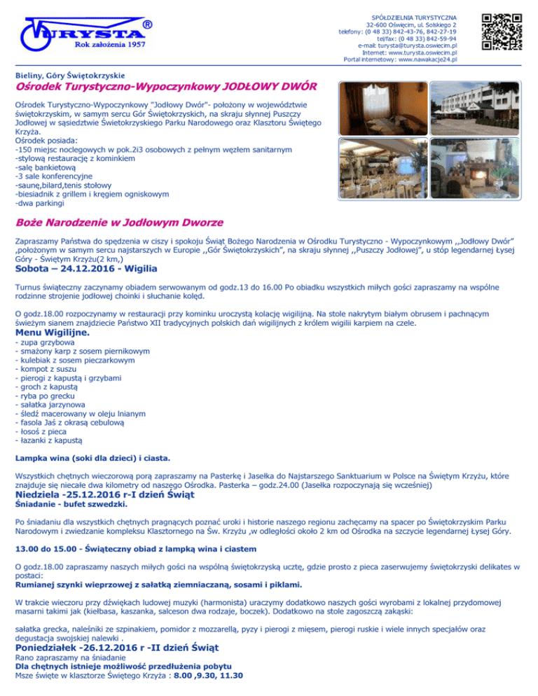 SPÓŁDZIELNIA TURYSTYCZNA 32-600 Oświęcim, ul. Solskiego 2 telefony: (0 48 33) 842-43-76, 842-27-19 tel/fax: (0 48 33) 842-59-94 e-mail: [email protected] Internet: www.turysta.oswiecim.pl Portal internetowy: www.nawakacje24.pl Ośrodek Turystyczno-Wypoczynkowy JODŁOWY DWÓR Ośrodek Turystyczno-Wypoczynkowy "Jodłowy Dwór"- położony w województwie świętokrzyskim, w samym sercu Gór Świętokrzyskich, na skraju słynnej Puszczy Jodłowej w sąsiedztwie Świetokrzyskiego Parku Narodowego oraz Klasztoru Świętego Krzyża. Ośrodek posiada: -150 miejsc noclegowych w pok.2i3 osobowych z pełnym węzłem sanitarnym -stylową restaurację z kominkiem -salę bankietową -3 sale konferencyjne -saunę,bilard,tenis stołowy -biesiadnik z grillem i kręgiem ogniskowym -dwa parkingi Boże Narodzenie w Jodłowym Dworze Zapraszamy Państwa do spędzenia w ciszy i spokoju Świąt Bożego Narodzenia w Ośrodku Turystyczno - Wypoczynkowym ,,Jodłowy Dwór” ,położonym w samym sercu najstarszych w Europie ,,Gór Świętokrzyskich”, na skraju słynnej ,,Puszczy Jodłowej”, u stóp legendarnej Łysej Góry - Świętym Krzyżu(2 km,) Sobota – 24.12.2016 - Wigilia Turnus świąteczny zaczynamy obiadem serwowanym od godz.13 do 16.00 Po obiadku wszystkich miłych gości zapraszamy na wspólne rodzinne strojenie jodłowej choinki i słuchanie kolęd. O godz.18.00 rozpoczynamy w restauracji przy kominku uroczystą kolację wigilijną. Na stole nakrytym białym obrusem i pachnącym świeżym sianem znajdziecie Państwo XII tradycyjnych polskich dań wigilijnych z królem wigilii karpiem na czele. Menu Wigilijne. - zupa grzybowa smażony karp z sosem piernikowym kulebiak z sosem pieczarkowym kompot z suszu pierogi z kapustą i grzybami groch z kapustą ryba po grecku sałatka jarzynowa śledź macerowany w oleju lnianym fasola Jaś z okrasą cebulową łosoś z pieca łazanki z kapustą Lampka wina (soki dla dzieci) i ciasta. Wszystkich chętnych wieczorową porą zapraszamy na Pasterkę i Jasełka do Najstarszego Sanktuarium w Polsce na Świętym Krzyżu, które znajduje się niecałe dwa kilometry od naszego Ośrodka. Pasterka – godz.24.00 (Jasełka rozpoczynają się wcześniej) Niedziela -25.12.2016 r-I dzień Świąt Śniadanie - bufet szwedzki. Po śniadaniu dla wszystkich chętnych pragnących poznać uroki i historie naszego regionu zachęcamy na spacer po Świętokrzyskim Parku Narodowym i zwiedzanie kompleksu Klasztornego na Św. Krzyżu ,w odległości około 2 km od Ośrodka na szczycie legendarnej Łysej Góry. 13.00 do 15.00 - Świąteczny obiad z lampką wina i ciastem O godz.18.00 zapraszamy naszych miłych gości na wspólną świętokrzyską ucztę, gdzie prosto z pieca zaserwujemy świętokrzyski delikates w postaci: Rumianej szynki wieprzowej z sałatką ziemniaczaną, sosami i piklami. W trakcie wieczoru przy dźwiękach ludowej muzyki (harmonista) uraczymy dodatkowo naszych gości wyrobami z lokalnej przydomowej masarni takimi jak (kiełbasa, kaszanka, salceson dwa rodzaje, boczek). Dodatkowo na stole zagoszczą zakąski: sałatka grecka, naleśniki ze szpinakiem, pomidor z mozzarellą, pyzy i pierogi z mięsem, pierogi ruskie i wiele innych specjałów oraz degustacja swojskiej nalewki . Poniedziałek -26.12.2016 r -II dzień Świąt Rano zapraszamy na śniadanie Dla chętnych istnieje możliwość przedłużenia pobytu Msze święte w klasztorze Świętego Krzyża : 8.00 ,9.30, 11.30 Cena : 420 zł/osoba - dorosła 290 zł/ dziecko do 10 roku życia W cenę wliczony jest jeden pobyt w saunie. Po kolacji wigilijnej Św. Mikołaj będzie rozdawał prezenty . Szampańsk i Sylwester w Górach Świętokrzyskich Od Piątku 30.12.2016 r do Niedzieli 1.01.2017 r Zapraszamy Państwa do szampańskiej zabawy w Ośrodku Turystyczno-Wypoczynkowym ,,Jodłowy Dwór” ,położonym w samym sercu najstarszych w Europie ,,Gór Świętokrzyskich”, na skraju słynnej ,,Puszczy Jodłowej”, u stóp legendarnej Łysej Góry - Świętym Krzyżu(2 km) W dniu przyjazdu miłych gości witał będzie groźny Zbój i urocza Czarownica poddając każdego śmiałka próbie magicznej nalewki – dzięki której goście nasi nabiorą mocy i wigoru na cały okres pobytu i wspólnej zabawy. Do Państwa dyspozycji czekać będą dwu osobowe pokoje z pełnym węzłem sanitarnym i TV. Po zakwaterowaniu zapraszamy na kolację przy szwedzkim stole w sali restauracyjnej, gdzie przywita gości DJ i chętnych zaprosi do pląsania w rytmach disco. Podczas kolacji zapraszamy na nasze „Święto Golonki” Golonka przyrządzona na kilka różnych sposobów serwowana prosto z gorących patelni z takimi dodatkami jak pure z grochu i cieciorki kiszony ogórek, musztarda, chrzan , ćwikła, swojski chleb, podpłomyki, kapusta zasmażana. Uraczymy również państwa wyrobami z lokalnej przydomowej masarni takimi jak (kiełbasa ,kaszanka ,salceson dwa rodzaje, boczek). Ponadto na stole zagoszczą pyzy z mięsem ,naleśniki ze szpinakiem sałatka grecka , pomidor, ogórek itp. Zabawę umili groźny Zbój Madej ,który poprowadzi zabawy i wybory na Miss Czarownicy i poszuka swojego godnego następcy . Zapraszamy na śniadanko. O godz. 11.00 przed obiektem będą czekać na Państwa zaprzęgi konne, które wszystkich pragnących poznać uroki i historie naszego regionu powiozą na wycieczkę z przewodnikiem na Święty Krzyż- zwiedzanie Klasztoru, Muzeum Misyjnego, Gołoborza. (trasa 2 km). W godzinach od 13.00.15.00 - obiad Po obiadku zapraszamy na odpoczynek i przygotowanie do balu sylwestrowego Bal Sylwestrowy o godz.20.00 ,który odbywać się będzie na dwóch poziomach : -część restauracyjna orkiestra -sala dyskotekowa zabawa z DJ-em. W trakcie sylwestrowego wieczoru kuchnia zaserwuje cztery gorące posiłki, zakąski, napoje zimne i gorące, 0,5 l alkoholu na parę oraz lampka szampana na powitanie Nowego Roku. O godzinie 24,00 zapraszamy przed obiekt na pokaz sztucznych ogni. Zabawa trwa do rana lub ostatni