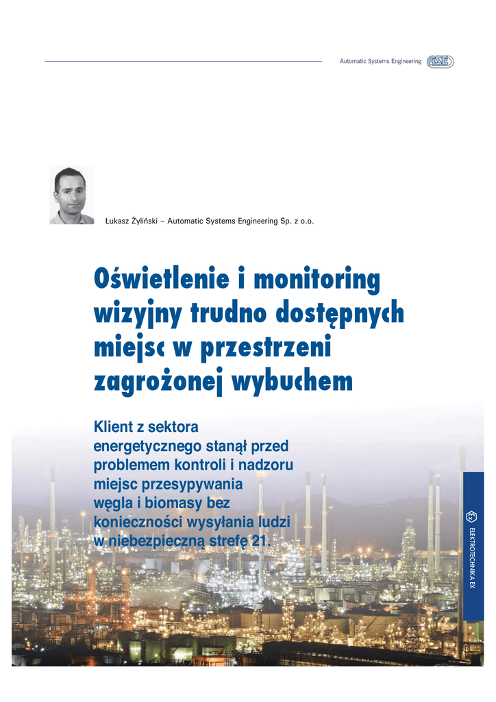 Automatic Systems Engineering Łukasz Żyliński – Automatic Systems Engineering Sp. z o.o. Oświetlenie i monitoring wizyjny trudno dostępnych miejsc w przestrzeni zagrożonej wybuchem ELEKTROTECHNIKA EX Klient z sektora energetycznego stanął przed problemem kontroli i nadzoru miejsc przesypywania węgla i biomasy bez konieczności wysyłania ludzi w niebezpieczną strefę 21. ELEKTROTECHNIKA EX W 2016 roku jeden z klientów z sektora energetycznego zwrócił się do ASE z prośbą o pomoc w rozwiązaniu problemu kontroli i nadzoru miejsc przesypywania węgla i biomasy bez konieczności wysyłania ludzi w tak niebezpieczne miejsce, jakim jest strefa 21. Kolejnym wyzwaniem było doświetlenie całego obszaru, tak aby najciemniejsze i najczarniejsze miejsca stały się widoczne dla obsługi. Klient wymagał ponadto, aby cały system był nowoczesny, unikalny oraz charakteryzował się długą żywotnością. Takie parametry spełnia oprawa do doświetlania miejsc firmy R. Stahl serii 6039 ze źródłem światła LED. Mając wieloletnie doświadczenie w sektorze energetycznym oraz szeroką gamę produktów, zaproponowaliśmy użytkownikowi zastosowanie kamer w wykonaniu przeciwwybuchowym wraz z oprawami doświetlenia miejscowego. Podczas wizji lokalnej zwróciliśmy uwagę, że miejsce, w którym mamy zainstalować oświetlenie i kamery, odznacza się bardzo małą przestrzenią. Idealnym rozwiązaniem okazała się najmniejsza na świecie kamera w wykonaniu przeciwwybuchowym firmy R. Stahl EC-710. Kamera, której średnica nie przekracza średnicy piłki do tenisa, ważąca mniej niż parę jabłek, miała optymalne parametry, aby wpasować się w istniejącą instalację. Kamera EC-710 podczas pracy w niebezpiecznych warunkach 6 • 1/2016 BIULETYN TECHNICZNY • www.biuletyntechniczny.com.pl Automatic Systems Engineering Ekran monitora z obrazem z kamer Po kilku miesiącach eksploatacji użytkownik wyraził zadowolenie z przedstawionego rozwiązania, nie musi bowiem wysyłać pracowników w niebezpieczne miejsca, a dzięki zastosowaniu kamer EC-710 oraz opraw ledowych serii 6039 cały proces widoczny jest na ekranie monitora, w jednym miejscu, umieszczonym w strefie bezpiecznej. Cały system monitoringu składa się z czterech kamer EC710 umieszczonych w różnych miejscach zsypowych. Przy każdej kamerze zamocowana została oprawa serii 6039. Kamery podłączono do istniejącego już systemu CCTV będącego na stanie zakładu, dzięki czemu użytkownik nie poniósł dodatkowych kosztów związanych z budową instalacji teletechnicznej. Zasilenie z napięcia zmiennego 230 V do opraw LED typu 6039 doprowadzono z rozdzielnicy dostępnej na instalacji. Dzięki temu cały koszt rozwiązania problemu użytkownika wiązał się tylko z zakupem i montażem urządzeń w wykonaniu przeciwwybuchowym, jakimi są kamera EC-710 i oprawa LED 6039. ELEKTROTECHNIKA EX Oprawa LED 6039 wraz z kamerą EC-710 w miejscu trudno dostępnym Kontakt: Łukasz Żyliński 58 520 77 35 [email protected] www.biuletyntechniczny.com.pl • BIULETYN TECHNICZNY • 1/2016 • 7 ELEKTROTECHNIKA EX Michał Guła System HRD na obiektach instalacji węgla i biomasy w elektrociepłowni Celem systemu HRD jest redukcja gwałtownego przyrostu ciśnienia towarzyszącego każdemu wybuchowi i utrzymanie ciśnienia wewnątrz chronionej instalacji na bezpiecznym poziomie. Automatic Systems Engineering Butla tłumienia wybuchów z blokadą Czujnik ciśnienia PXD Produkcja energii zawsze wiązała się z różnego rodzaju zagrożeniami. Towarzyszące jej strefy pyłowe mogą stać się przyczyną wybuchów i pożarów, stanowiąc tym samym niebezpieczeństwo dla zdrowia i życia obsługi. Wybuchów pyłów biomasy czy węgla w energetyce było już kilka, przypomnijmy choćby wybuchy w Elektrowni „Dolna Odra” i w Elektrowni w Turowie. Podobne zagrożenia można zaobserwować w elektrociepłowniach. W jednej z nich firma Automatic Systems Engineering zainstalowała system tłumienia/odizolowania wybuchów (HRD) na instalacji silosów biomasy oraz na trzech obiegach młynowych i elewatorach kubełkowych, podających węgiel z placu składowego na obiegi młynowe (OM). System w sposób ciągły dokonuje odczytu ciśnienia, z zainstalowanych na obiekcie czujników PXD. Podczas aktywacji butli środek tłumiący miesza się z pyłem wybuchowym, ELEKTROTECHNIKA EX Celem systemu HRD jest redukcja gwałtownego przyrostu ciśnienia towarzyszącego każdemu wybuchowi i utrzymanie ciśnienia wewnątrz chronionej instalacji na bezpiecznym poziomie. System HRD składa się z czujników ciśnienia PXD, centrali sterującej oraz umieszczonych na instalacji butli z proszkiem tłumiącym. Butle tłumienia wybuchów na instalacji biomasy www.biuletyntechniczny.com.pl • BIULETYN TECHNICZNY • 1/2016 • 9 ELEKTROTECHNIKA EX Kolejnym punktem było odtworzenie dokumentacji technicznej OM. Została ona wykonana za pomocą skanera 3D (modelu bryłowego). Dokonano również pomiaru grubości ścian urządzeń w celu określenia potencjalnych punktów uszkodzeń instalacji w razie ewentualnego wybuchu. Był to niezbędny zabieg, pozwalający zidentyfikować szereg słabych miejsc, które podczas niekontrolowanego wzrostu ciśnienia wewnątrz instalacji, mogłyby ulec zniszczeniu jako pierwsze, doprowadzając tym samym do eskalacji niebezpiecznych zjawisk i przeniesienia ich na kolejne urządzenia oraz znajdujących się w pobliżu pracowników. System HRD produkcji niemieckiej firmy o globalnym zasięgu ATEX Explosionsschutz został – tak jak każdy inny – ściśle dostosowany do specyfiki produkcji i warunków pracy całej instalacji. Jako system nowej generacji, pozwala on osiągnąć bardzo dobre parametry eksploatacyjne. Panel centrali sterującej przez co zmniejsza właściwości wybuchowe pyłu i tym samym redukuje skutki powstania wybuchu. Centrala sterująca w momencie otrzymania informacji od czujników ciśnienia, wyzwala wszystkie b