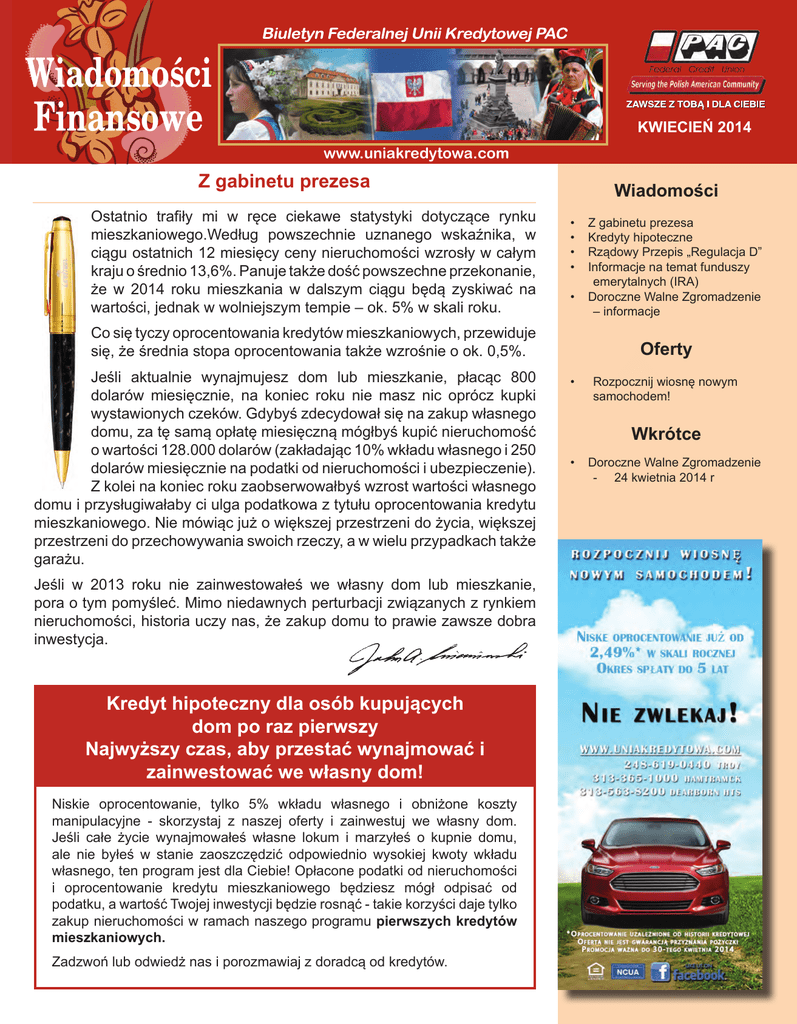 Kwiecień 2014 www.uniakredytowa.com Z gabinetu prezesa Ostatnio trafiły mi w ręce ciekawe statystyki dotyczące rynku mieszkaniowego.Według powszechnie uznanego wskaźnika, w ciągu ostatnich 12 miesięcy ceny nieruchomości wzrosły w całym kraju o średnio 13,6%. Panuje także dość powszechne przekonanie, że w 2014 roku mieszkania w dalszym ciągu będą zyskiwać na wartości, jednak w wolniejszym tempie – ok. 5% w skali roku. Wiadomości • • • • Z gabinetu prezesa Kredyty hipoteczne Rządowy Przepis „Regulacja D” Informacje na temat funduszy emerytalnych (IRA) • Doroczne Walne Zgromadzenie – informacje Co się tyczy oprocentowania kredytów mieszkaniowych, przewiduje się, że średnia stopa oprocentowania także wzrośnie o ok. 0,5%. Jeśli aktualnie wynajmujesz dom lub mieszkanie, płacąc 800 dolarów miesięcznie, na koniec roku nie masz nic oprócz kupki wystawionych czeków. Gdybyś zdecydował się na zakup własnego domu, za tę samą opłatę miesięczną mógłbyś kupić nieruchomość o wartości 128.000 dolarów (zakładając 10% wkładu własnego i 250 dolarów miesięcznie na podatki od nieruchomości i ubezpieczenie). Z kolei na koniec roku zaobserwowałbyś wzrost wartości własnego domu i przysługiwałaby ci ulga podatkowa z tytułu oprocentowania kredytu mieszkaniowego. Nie mówiąc już o większej przestrzeni do życia, większej przestrzeni do przechowywania swoich rzeczy, a w wielu przypadkach także garażu. Jeśli w 2013 roku nie zainwestowałeś we własny dom lub mieszkanie, pora o tym pomyśleć. Mimo niedawnych perturbacji związanych z rynkiem nieruchomości, historia uczy nas, że zakup domu to prawie zawsze dobra inwestycja. Kredyt hipoteczny dla osób kupujących dom po raz pierwszy Najwyższy czas, aby przestać wynajmować i zainwestować we własny dom! Niskie oprocentowanie, tylko 5% wkładu własnego i obniżone koszty manipulacyjne - skorzystaj z naszej oferty i zainwestuj we własny dom. Jeśli całe życie wynajmowałeś własne lokum i marzyłeś o kupnie domu, ale nie byłeś w stanie zaoszczędzić odpowiednio wysokiej kwoty wkładu własnego, ten program jest dla Ciebie! Opłacone podatki od nieruchomości i oprocentowanie kredytu mieszkaniowego będziesz mógł odpisać od podatku, a wartość Twojej inwestycji będzie rosnąć - takie korzyści daje tylko zakup nieruchomości w ramach naszego programu pierwszych kredytów mieszkaniowych. Zadzwoń lub odwiedż nas i porozmawiaj z doradcą od kredytów. Oferty • Rozpocznij wiosnę nowym samochodem! Wkrótce • Doroczne Walne Zgromadzenie - 24 kwietnia 2014 r Nasze biura PAC będą nieczynne w następujących dniach: PRZYDATNE WIADOMOŚCI Dzień Pamięci poniedziałek, 26 maja Rządowy Przepis „Regulacja D” Federalna Regulacja D ogranicza liczbę uprzednio zleconych lub automatycznych wypłat, przelewów telefonicznych lub przelewów zleconych za pośrednictwem komputera na inne konto lub na rzecz osób trzecich z konta oszczędnościowego i inwestycyjnego „Money Market”do sześciu (6) miesięcznie. Obejmuje to przelewy automatyczne wykonywane w celu pokrycia debetu na rachunku czekowym. W przypadku przekroczenia dozwolonego miesięcznego limitu otrzymasz pismo informujące o przekroczeniu limitu transakcji i konieczności przechowywania większej sumy na Twoim rachunku czekowym. Na zasadzie wyjątku możemy uznać wypłatę/przelew, jednak w przyszłości po przekroczeniu limitu transakcji będziemy zobowiązani do zwrócenia nieopłaconych przedmiotów. Jednym z rozwiązań, które pozwolą Ci uniknąć problemów, jest wykonywanie uprzednio zleconych lub automatycznych wypłat ze swojego rachunku czekowego w PAC FCU. Rachunki czekowe nie podlegają ograniczeniom prawnym jeśli chodzi o liczbę elektronicznych wypłat miesięcznie. Ponadto, powinieneś się upewnić, że na Twoim koncie czekowym znajdują się odpowiednie środki na pokrycie wystawionych przez Ciebie czeków. Jeśli nie masz rachunku czekowego w PAC FCU, zachęcamy do odwiedzenia jednego z naszych oddziałów i założenia takiego konta. Informacje na temat funduszy emerytalnych (IRA) Wpłaty za rok 2013 można dokonywać do 15 kwietnia 2014. Limit wpłaty za rok 2013 wynosi 5500$, zarówno na tradycyjny fundusz emerytalny IRA, jak i na ROTH IRA. Jeśli przekroczyli Państwo pięćdziesiąty rok życia, mogą Państwo wpłacić dodatkowo 1000$. Wszystkie fundusze emerytalne są objęte ubezpieczeniem National Credit Union Administration (NCUA). Doroczne Walne Zgromadzenie – informacje 38 Doroczne Walne Zgromadzenie Członkowskie odbędzie się w czwartek 24 kwietnia 2014 w Amerykańsko-Polskim Centrum Kulturalnym w Troy. Rejestracja rozpocznie się o 17:30. Podczas Walnego Zgromadzenia chcielibyśmy uzupełnić sześć wolnych miejsc w Radzie Dyrektorów. Komitet d/s Nominacji podaje poniżej nazwiska osób, kandydujących do Rady Dyrektorów: Mariusz Arszylo Zdzislaw Miloboszewski Matthew Grecki David Porada Sophie Kosowski Mark Reaume Nie istnieje możliwość zgłaszania kandydatury w trakcie trwania Zgromadzenia. Głosowanie nie odbędzie się, ponieważ na każdą pozycję została zgłoszona tylko jedna kandydatura. Święto Niepodległości piątek, 4 lipca Aby zgłosić utratę (kradzież lub zagubienie) karty kredytowej VISA zadzwoń pod numer: 1-800-828-3901 po 17:00 oraz w soboty i niedziele: 1-800-991-4961 Karta Debetowa: 1-888-241-2510 – bezpłatna linia zgłoszeniowa na terenie USA 1-909-941-1398 – bezpłatna linia zgłoszeniowa poza terytorium USA Adres kontaktowy do Rady Dyrektorów: 2889 E. Maple Rd, Troy, MI 48083 www.pacfcu.com www.uniakredytowa.com 2889 E. Maple Troy, MI 48083 (248) 619-0440 Fax: (248) 619-3230 11905 Joseph Campau Hamtramck, MI 48212 (313) 365-1000 Fax: (313) 365-6321 25555 West Warren Dearborn Heights, MI 48127 (313) 563-8200 Fax: (313) 563-8009 Wszystkie Oddziały są czynne: Pn. - Cz. 9:30 – 17:00 Piątek 9:30 – 19:00 Sobota 9:30 – 