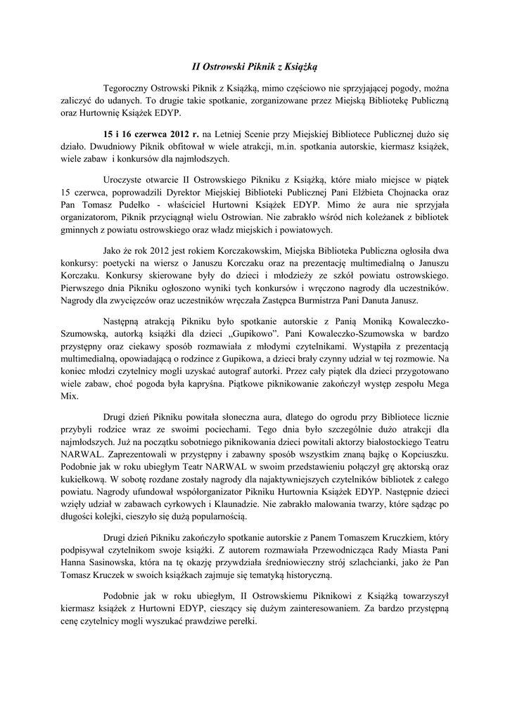 II Ostrowski Piknik z Książką Tegoroczny Ostrowski Piknik z Książką, mimo częściowo nie sprzyjającej pogody, można zaliczyć do udanych. To drugie takie spotkanie, zorganizowane przez Miejską Bibliotekę Publiczną oraz Hurtownię Książek EDYP. 15 i 16 czerwca 2012 r. na Letniej Scenie przy Miejskiej Bibliotece Publicznej dużo się działo. Dwudniowy Piknik obfitował w wiele atrakcji, m.in. spotkania autorskie, kiermasz książek, wiele zabaw i konkursów dla najmłodszych. Uroczyste otwarcie II Ostrowskiego Pikniku z Książką, które miało miejsce w piątek 15 czerwca, poprowadzili Dyrektor Miejskiej Biblioteki Publicznej Pani Elżbieta Chojnacka oraz Pan Tomasz Pudełko - właściciel Hurtowni Książek EDYP. Mimo że aura nie sprzyjała organizatorom, Piknik przyciągnął wielu Ostrowian. Nie zabrakło wśród nich koleżanek z bibliotek gminnych z powiatu ostrowskiego oraz władz miejskich i powiatowych. Jako że rok 2012 jest rokiem Korczakowskim, Miejska Biblioteka Publiczna ogłosiła dwa konkursy: poetycki na wiersz o Januszu Korczaku oraz na prezentację multimedialną o Januszu Korczaku. Konkursy skierowane były do dzieci i młodzieży ze szkół powiatu ostrowskiego. Pierwszego dnia Pikniku ogłoszono wyniki tych konkursów i wręczono nagrody dla uczestników. Nagrody dla zwycięzców oraz uczestników wręczała Zastępca Burmistrza Pani Danuta Janusz. Następną atrakcją Pikniku było spotkanie autorskie z Panią Moniką KowaleczkoSzumowską, autorką książki dla dzieci „Gupikowo”. Pani Kowaleczko-Szumowska w bardzo przystępny oraz ciekawy sposób rozmawiała z młodymi czytelnikami. Wystąpiła z prezentacją multimedialną, opowiadającą o rodzince z Gupikowa, a dzieci brały czynny udział w tej rozmowie. Na koniec młodzi czytelnicy mogli uzyskać autograf autorki. Przez cały piątek dla dzieci przygotowano wiele zabaw, choć pogoda była kapryśna. Piątkowe piknikowanie zakończył występ zespołu Mega Mix. Drugi dzień Pikniku powitała słoneczna aura, dlatego do ogrodu przy Bibliotece licznie przybyli rodzice wraz ze swoimi pociechami. Tego dnia było szczególnie dużo atrakcji dla najmłodszych. Już na początku sobotniego piknikowania dzieci powitali aktorzy białostockiego Teatru NARWAL. Zaprezentowali w przystępny i zabawny sposób wszystkim znaną bajkę o Kopciuszku. Podobnie jak w roku ubiegłym Teatr NARWAL w swoim przedstawieniu połączył grę aktorską oraz kukiełkową. W sobotę rozdane zostały nagrody dla najaktywniejszych czytelników bibliotek z całego powiatu. Nagrody ufundował współorganizator Pikniku Hurtownia Książek EDYP. Następnie dzieci wzięły udział w zabawach cyrkowych i Klaunadzie. Nie zabrakło malowania twarzy, które sądząc po długości kolejki, cieszyło się dużą popularnością. Drugi dzień Pikniku zakończyło spotkanie autorskie z Panem Tomaszem Kruczkiem, który podpisywał czytelnikom swoje książki. Z autorem rozmawiała Przewodnicząca Rady Miasta Pani Hanna Sasinowska, która na tę okazję przywdziała średniowieczny strój szlachcianki, jako że Pan Tomasz Kruczek w swoich książkach zajmuje się tematyką historyczną. Podobnie jak w roku ubiegłym, II Ostrowskiemu Piknikowi z Książką towarzyszył kiermasz książek z Hurtowni EDYP, cieszący się dużym zainteresowaniem. Za bardzo przystępną cenę czytelnicy mogli wyszukać prawdziwe perełki. Na zakończenie Dyrektor Miejskiej Biblioteki Publicznej Pani Elżbieta Chojnacka oraz Pan Tomasz Pudełko właściciel Hurtowni EDYP podziękowali wszystkim uczestnikom pikniku za tak liczne przybycie oraz zaprosili wszystkich na przyszły rok.