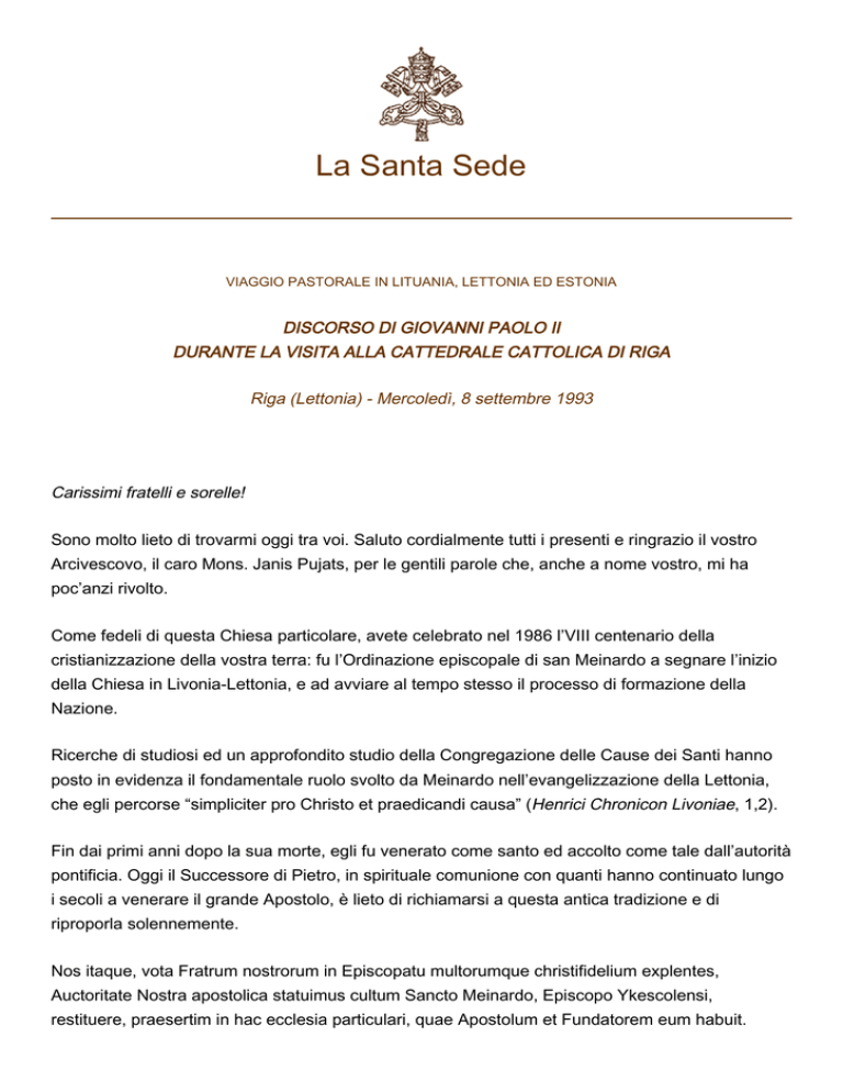 La Santa Sede VIAGGIO PASTORALE IN LITUANIA, LETTONIA ED ESTONIA DISCORSO DI GIOVANNI PAOLO II DURANTE LA VISITA ALLA CATTEDRALE CATTOLICA DI RIGA Riga (Lettonia) - Mercoledì, 8 settembre 1993 Carissimi fratelli e sorelle! Sono molto lieto di trovarmi oggi tra voi. Saluto cordialmente tutti i presenti e ringrazio il vostro Arcivescovo, il caro Mons. Janis Pujats, per le gentili parole che, anche a nome vostro, mi ha poc’anzi rivolto. Come fedeli di questa Chiesa particolare, avete celebrato nel 1986 l’VIII centenario della cristianizzazione della vostra terra: fu l’Ordinazione episcopale di san Meinardo a segnare l’inizio della Chiesa in Livonia-Lettonia, e ad avviare al tempo stesso il processo di formazione della Nazione. Ricerche di studiosi ed un approfondito studio della Congregazione delle Cause dei Santi hanno posto in evidenza il fondamentale ruolo svolto da Meinardo nell’evangelizzazione della Lettonia, che egli percorse “simpliciter pro Christo et praedicandi causa” (Henrici Chronicon Livoniae, 1,2). Fin dai primi anni dopo la sua morte, egli fu venerato come santo ed accolto come tale dall’autorità pontificia. Oggi il Successore di Pietro, in spirituale comunione con quanti hanno continuato lungo i secoli a venerare il grande Apostolo, è lieto di richiamarsi a questa antica tradizione e di riproporla solennemente. Nos itaque, vota Fratrum nostrorum in Episcopatu multorumque christifidelium explentes, Auctoritate Nostra apostolica statuimus cultum Sancto Meinardo, Episcopo Ykescolensi, restituere, praesertim in hac ecclesia particulari, quae Apostolum et Fundatorem eum habuit. 2 Insuper facultatem facimus ut eius festum die decimaquarta mensis augusti, in locis et modis iure statutis, quotannis celebrari possit. L’intercessione di San Meinardo, che fu saggio Pastore di questa Chiesa particolare in un tempo in cui i battezzati erano fra loro pienamente uniti, guidi e sostenga anche oggi il cammino ecumenico dei cristiani di Lettonia verso una rinnovata comunione e aiuti tutti ad affrontare insieme i difficili problemi del momento. A tutti la mia benedizione! Al termine della visita alla Cattedrale Cattolica di Riga, il Santo Padre pronuncia, in polacco, un breve discorso. Opatrzności Bożej składam najgłębsze dzięki za to, że doprowadziła mnie dzisiaj na Waszą ziemię, na Łotwę i do Waszej stolicy, Rygi, że dane mi jest dzisiaj być z Wami tu, w tej katedrze, że dane mi było w tej katedrze potwierdzić wielowiekowy kult św. Meinarda, Waszego apostoła, założyciela Kościoła w Rydze, na Łotwie, nad Bałtykiem. Witając Księdza Arcybiskupa, Waszego pasterza, i wszystkich biskupów łotewskich, a także wszystkich obecnych tu gości: Kardynała Prymasa Polski, biskupów z różnych krajów sąsiednich i dalszych, aż po Amerykę Północną, Stany Zjednoczone, witając również delegata Patriarchatu Prawosławnego z Moskwy, pragnę wyrazić moją radość, że znajdujemy się tutaj wspólnie. Trudno mi w tej chwili nie wspomnieć Arcybiskupa, kard. Julijansa Vaivodsa, którego miałem szczęście spotykać wielokrotnie w Rzymie, którego miałem szczęście wprowadzić do Kolegium Kardynalskiego. Niech Pan przyjmie jego duszę do wiecznej światłości. Witam wszystkich zgromadzonych, cała społeczność katolicką archidiecezji w Rydze, tu reprezentowana przez licznych braci i siostry. Witam bardzo licznie zgromadzonych kapłanów, nie tylko łotewskich, z archidiecezji w Rydze, ale także wielu tych biskupów i kapłanów, którzy przeszli przez Wasze seminarium w Rydze, przygotowali się do kapłaństwa i do posługi apostolskiej na szerokich obszarach dawnego Związku Radzieckiego. Dziękujmy Bogu wspólnie za wszystkie łaski, z pomoca których prowadził Was, drodzy bracia oraz drogie siostry, przedstawicielki róznych zgromadzeń zakonnych, do służby Ludu Bożego, do pracy w swojej ewangelicznej winnicy; dziękujmy z głębi serca za łaskę tej posługi, a równocześnie przygotowujmy się – jak głosi napis na tym transparencie – do ewangelizacji roku 2000. Łotwa jest krajem, w którym wezwanie ekumeniczne, modlitwa Chrystusa o jedność chrześcijan nabiera specjalnej aktualności. Pozdrawiam wszystkich braci chrześcijan, zwłaszcza wielka wspólnotę luteranską, także prawosławnych i innych mieszkających na Łotwie wyznawców Chrystusa. Stąd zresztą, po odwiedzinach u władz Łotwy i rozmowie z panem prezydentem, 3 udajemy się do katedry luterańskiej na modlitwę o jedność. Dzisiaj rano opuszczałem Vilnius, stolicę Litwy, i świeciło słońce; kiedy wylądowałem na ziemi łotewskiej w Rydze, też świeciło słońce, ale zaraz potem przyszedł bardzo rzęsisty deszcz. Ufamy, że to słońce, które dotarło na ziemię litewską, dotrze również na Waszą ziemię i będzie towarzyszyć naszym spotkaniom. Pragnę jeszcze podziękować Księdzu Arcybiskupowi za to, że nie tylko jest Metropolitą Ryskim, ale stał się także tłumaczem dla Papieża, wtedy gdy on przemawia po polsku. © Copyright - Libreria Editrice Vaticana