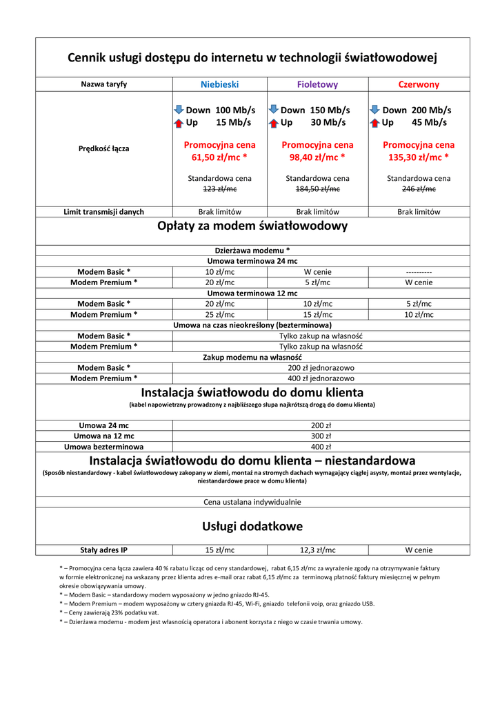 Cennik usługi dostępu do internetu w technologii światłowodowej Nazwa taryfy Prędkość łącza Limit transmisji danych Niebieski Fioletowy Czerwony Down 100 Mb/s Up 15 Mb/s Down 150 Mb/s Up 30 Mb/s Down 200 Mb/s Up 45 Mb/s Promocyjna cena 61,50 zł/mc * Promocyjna cena 98,40 zł/mc * Promocyjna cena 135,30 zł/mc * Standardowa cena 123 zł/mc Standardowa cena 184,50 zł/mc Standardowa cena 246 zł/mc Brak limitów Brak limitów Brak limitów Opłaty za modem światłowodowy Dzierżawa modemu * Umowa terminowa 24 mc 10 zł/mc W cenie 20 zł/mc 5 zł/mc Umowa terminowa 12 mc 20 zł/mc 10 zł/mc 25 zł/mc 15 zł/mc Umowa na czas nieokreślony (bezterminowa) Tylko zakup na własność Tylko zakup na własność Zakup modemu na własność 200 zł jednorazowo 400 zł jednorazowo Modem Basic * Modem Premium * Modem Basic * Modem Premium * Modem Basic * Modem Premium * Modem Basic * Modem Premium * ---------W cenie 5 zł/mc 10 zł/mc Instalacja światłowodu do domu klienta (kabel napowietrzny prowadzony z najbliższego słupa najkrótszą drogą do domu klienta) Umowa 24 mc Umowa na 12 mc Umowa bezterminowa 200 zł 300 zł 400 zł Instalacja światłowodu do domu klienta – niestandardowa (Sposób niestandardowy - kabel światłowodowy zakopany w ziemi, montaż na stromych dachach wymagający ciągłej asysty, montaż przez wentylacje, niestandardowe prace w domu klienta) Cena ustalana indywidualnie Usługi dodatkowe Stały adres IP 15 zł/mc 12,3 zł/mc W cenie * – Promocyjna cena łącza zawiera 40 % rabatu licząc od ceny standardowej, rabat 6,15 zł/mc za wyrażenie zgody na otrzymywanie faktury w formie elektronicznej na wskazany przez klienta adres e-mail oraz rabat 6,15 zł/mc za terminową płatność faktury miesięcznej w pełnym okresie obowiązywania umowy. * – Modem Basic – standardowy modem wyposażony w jedno gniazdo RJ-45. * – Modem Premium – modem wyposażony w cztery gniazda RJ-45, Wi-Fi, gniazdo telefonii voip, oraz gniazdo USB. * – Ceny zawierają 23% podatku vat. * – Dzierżawa modemu - modem jest własnością operatora i abonent korzysta z niego w czasie trwania umowy.