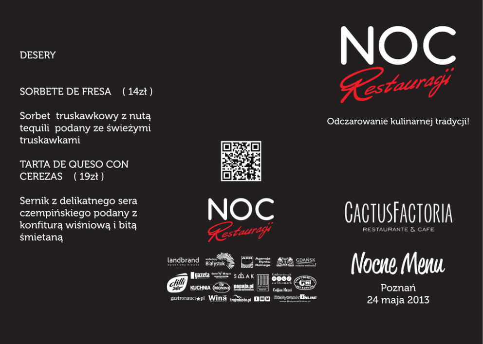 DESERY SORBETE DE FRESA ( 14z³ ) Sorbet truskawkowy z nut¹ tequili podany ze œwie¿ymi truskawkami Odczarowanie kulinarnej tradycji! TARTA DE QUESO CON CEREZAS ( 19z³ ) Sernik z delikatnego sera czempiñskiego podany z konfitur¹ wiœniow¹ i bit¹ œmietan¹ Nocne Menu O TAXI I M M Poznañ 24 maja 2013 PRZYSTAWKI ZUPY CAMARÓN CON CHILES Y AJO LA CREMA DE AJO ( 9z³ ) ( 29z³ ) Aromatyczny krem czosnkowy Krewetki z papryczk¹ chilli zdobiony klarowanym mas³em ,czosnkiem i pomidorami czempiñskim i grzankami aromatyzowane winem Rioja GASPACHO ( 9z³ ) ENSALADA CON FRESAS Y Hiszpañski ch³odnik z ESPÁRRAGOS ( 18z³ ) pomidorów pleszewskich z Duet wielkopolskich truskawek dodatkiem hiszpañskiej i szparag podany na rucoli z papryki oraz cebuli dodatkiem pestek dyni i aromatyzowany kolendr¹ vinegrette zdobiony ró¿¹ z szynki dojrzewaj¹cej DANIA G£ÓWNE POLLO CON ARÁNDANOS ( 29z³ ) Gotowany filet z kurczaka w sosie jagodowym z nut¹ ja³owca podany z warzywami gotowanymi i bia³ym ry¿em FAJITAS DE RES ( 37z³ ) Grillowana wo³owina podana na warzywach z dodatkiem tortilli , sosu salsa i kwaœnej œmietany koœciañskiej Organizatorem jest Najlepsze autorskie restauracje w Poznaniu, Bia³ymstoku i Gdañsku B¹dŸ z nami przez ca³y rok na www.KulinarnyPoznan.pl