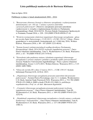 Lista publikacji naukowych dr Bartosza Klebana Stan na lipiec 2016 Publikacje wydane w latach akademickich 2004 – 2016: 1. "Rozszerzone zbiorowe licencje a zbiorowe zarządzanie z wykorzystaniem domniemania z art. 105 ust. 1 ustawy o prawie autorskim i prawach pokrewnych", Zbiorowe zarządzanie prawami autorskimi i pokrewnymi w związku z implementacją Dyrektywy Parlamentu Europejskiego i Rady 2014/26/UE, Wyższa Szkoła Umiejętności Społecznych w Poznaniu, Poznań 2016, s. 228 - 254 (ISBN 978-83-89430-27-4). 2. "Kryteria wyznaczania właściwej organizacji zbiorowego zarządzania - glosa do wyroku Sądu Najwyższego z 12.03.2015 r. (I CSK 159/14)", Glosa - Prawo gospodarcze w orzeczeniach i komentarzach, nr 1 (166) luty 2016, Wolters Kluwer, Warszawa 2016, s. 89 - 107 (ISSN 1233-4634). 3. "System licencji wieloterytorialnych według dyrektywy Parlamentu Europejskiego i Rady 2014/26/UE (wybrane zagadnienia prawne)", Zarys Prawa własności intelektualnej. Tom V, Wydawnictwo C.H. Beck, Warszawa 2015, s. 63 - 78 (ISBN 978-83-255-7570-0). 4. "Zezwolenie jako podstawa statusu i działania organizacji zbiorowego zarządzania w prawie unijnym i polskim a praktyka sądów powszechnych", Zeszyty Naukowe Uniwersytetu Jagiellońskiego - Prace z prawa własności intelektualnej, Zeszyt 1 (127) 2015, Wolters Kluwer, Warszawa 2015, s. 5-35 (ISSN 1689-7080). 5. "Glosa do wyroku SN z dnia 12 marca 2015 r., I CSK 159/14", System Informacji Prawnej LEX, LEX/el. 2015. 6. „Organizacje zbiorowego zarządzania prawami autorskimi lub prawami pokrewnymi”, System Prawa Prywatnego, tom 13, 3. wydanie, Wydawnictwo C.H. Beck, Instytut Nauk Prawnych PAN, Warszawa 2013, s. 721-782 (ISBN 978-83-255-5068-4; ISBN e-book 978-83-255-5069-1), publikacja współautorska z Prof. zw. dr hab. Marianem Kępińskim. 7. „Czynności zbiorowego zarządzania prawami pokrewnymi (wybrane zagadnienia prawne)”, Zarys Prawa własności intelektualnej. Tom III, Wydawnictwo C.H. Beck, Warszawa 2011, s. 169-192 (ISBN 978-83-2553252-9). 8. „Działalność organizacji zbiorowego zarządzania w świetle ustawy o ochronie konkurencji i konsumentów”, Zarys Prawa własności intelektualnej. Tom II, Wydawnictwo C.H. Beck, Warszawa 2011, s. 127-148 (ISBN 978-83-2551584-3). 1 Lista publikacji naukowych dr Bartosza Klebana 9. „Digital Rights Management Systems (Systemy elektronicznego zarządzania prawami do utworów utrwalonych techniką cyfrową)”, Zarys Prawa własności intelektualnej. Tom I: Granice prawa autorskiego, Wydawnictwo C.H. Beck, Warszawa 2010, s. 81-105 (ISBN 978-83-255-1101-2). 10. „Organizacje zbiorowego zarządzania jako przedsiębiorcy”, Prawo autorskie a prawo konkurencji, materiały z ogólnopolskiej konferencji naukowej, Wyższa Szkoła Umiejętności Społecznych w Poznaniu, Poznań 2009, s. 69-87 (ISBN 978-83-89430-15-1). 11. „Czynności zbiorowego zarządzania i ochrony praw autorskich dokonywane przez organizacje zbiorowego zarządzania prawami autorskimi”, Prawo wobec wyzwań współczesności. Tom V, Prace Wydziału Prawa i Administracji Uniwersytetu im. Adama Mickiewicza w Poznaniu, Poznań 2008, s. 239-250 (ISBN 978-83-61091-68-4). 12. „Digital Rights Management Systems”, publikacja on-line, Kancelaria Prawna dr Marek Jarzyński & Kornel Novak, Poznań 2007, s. 1-12, adres internetowy publikacji: http://jarzpartner.pl/pl/index.php?gid=54&pid=10 (stan na dzień 01.01.2010, Nr publikacji on-line A / 1 / 2007). 13. „Aktualne problemy w relacji: organizacje zbiorowego zarządzania prawami autorskimi – Prawo konkurencji (wybrane zagadnienia prawne)”, Prawo wobec wyzwań współczesności. Tom IV, Prace Wydziału Prawa i Administracji Uniwersytetu im. Adama Mickiewicza w Poznaniu, Poznań 2007, s. 357-369 (ISBN 83-924809-8-8). 14. „Organizacje zbiorowego zarządzania prawami autorskimi a prawo konkurencji – wybrane zagadnienia prawne”, Era Społeczeństwa Informacyjnego. Wyzwania, szanse, zagrożenia (materiały konferencyjne), Wydawnictwo Wyższej Szkoły Komunikacji i Zarządzania, Poznań 2006, s. 343-360 (ISBN 83-88018-36-1). 15. „Zbiorowy zarząd prawami autorskimi a Prawo konkurencji (wybrane zagadnienia prawne)”, Prawo i Administracja. Tom V, Piła 2006, s. 169-190 (ISBN 83-89873-17-6). 16. „Organizacje zbiorowego zarządzania prawami autorskimi a prawo konkurencji (wybrane zagadnienia prawne)”, Aktualne problemy polskiego i europejskiego prawa ochrony konkurencji, UOKiK, Warszawa 2006, s. 59-73 (ISBN 83-922705-2-5). 17. „Digital Rights Management Systems, czyli o udostępnianiu utworów w Internecie”, Prawo wobec wyzwań współczesności. Tom III, Prace Wydziału Prawa i Administracji Uniwersytetu im. Adama Mickiewicza w Poznaniu, Poznań 2006, s. 243-254 (ISBN 83-921889-5-0). 2 Lista publikacji naukowych dr Bartosza Klebana 18. „Cyfrowe systemy zarządzania prawami autorskimi na tle międzynarodowej i europejskiej regulacji prawnej”, Era Społeczeństwa Informacyjnego. Wyzwania, szanse, zagrożenia (materiały konferencyjne), Wydawnictwo Wyższej Szkoły Komunikacji i Zarządzania, Poznań 2005, s. 145-158 (ISBN 83-89873-95-8). 19. „Cyfrowe systemy zarządzania prawami autorskimi na tle międzynarodowej i europejskiej regulacji prawnej (wybrane zagadnienia prawne)”, Prawo i Administracja. Tom IV, Piła 2005, s. 265-281 (ISBN 83-98973-71-0). 20. „Prawna regulacja działalności organizacji zbiorowego zarządzania prawami autorskimi w zakresie ochrony twórcy (wybrane zagadnienia prawne)”, Prawo i Administracja. Tom III, Piła 2004, s. 141-160 (ISBN 83-89873-60-5). 3