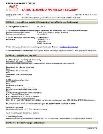 KARTA CHARAKTERYSTYKI ZATRUTE ZIARNO NA MYSZY I SZCZURY DATA SPORZĄDZENIA 14.11.2013 DATA AKTUALIZACJI 20.07.2015 Wersja PL: 2.0 Karta Charakterystyki jest zgodna z Rozporządzeniem komisji UE 2015/830 z 28.05.2015r. SEKCJA 1: Identyfikacja substancji/mieszaniny i identyfikacja przedsiębiorstwa 1.1 Identyfikator produktu: RATER P 1.2 Istotne zidentyfikowane zastosowania substancji lub mieszaniny oraz zastosowania odradzane: Zastosowanie zidentyfikowane: Środek gryzoniobójczy gotowy do użycia Zastosowanie odradzane: nie określono 1.3 Dane dotyczące dostawcy karty charakterystyki: Producent: Dercol Sp. z o. o. ul. Wyczółki 75, 02-820 Warszawa Osoba odpowiedzialna za kartę charakterystyki: Agnieszka Zmorka – [email protected] 1.4 Numer telefonu alarmowego: 112 (ogólny telefon alarmowy), 998 (straż pożarna), 999 (pogotowie medyczne); SEKCJA 2: Identyfikacja zagrożeń 2.1 Klasyfikacja substancji lub mieszaniny Klasyfikacja wg Rozp. 1272/2008 Mieszanina nie sklasyfikowana jako niebezpieczna zgodnie z obowiązującymi przepisami. Zagrożenie dla zdrowia człowieka Brak. Zagrożenie dla środowiska Brak. Zagrożenia fizyczne/chemiczne Brak. 2.2 Elementy oznakowania: Piktogramy: Brak. Hasło ostrzegawcze: Brak. Zwroty wskazujące rodzaj zagrożenia: Brak. Zwroty określające środki bezpieczeństwa: P102 – Chronić przed dziećmi. P103 – Przed użyciem przeczytać etykietę. P280 – Stosować rękawice ochronne. P301+P310 – W PRZYPADKU POŁKNIĘCIA: Natychmiast skontaktować się z OŚRODKIEM ZATRUĆ lub lekarzem. Nr pozwolenia na obrót produktem biobójczym: PL/2014/0145/MR z dnia 26.05.2014 Substancja aktywna: Bromadiolon [Nr CAS: 28772-56-7] w ilości 0, 05g/kg Karta charakterystyki dostępna na żądanie. 2.3 Inne zagrożenia: Brak informacji na temat spełnienia kryteriów PBT lub vPvB zgodnie z załącznikiem XIII rozporządzenia REACH. SEKCJA 3: Skład/informacja o składnikach Strona 1 z 9 KARTA CHARAKTERYSTYKI ZATRUTE ZIARNO NA MYSZY I SZCZURY DATA SPORZĄDZENIA 14.11.2013 DATA AKTUALIZACJI 20.07.2015 Wersja PL: 2.0 Karta Charakterystyki jest zgodna z Rozporządzeniem komisji UE 2015/830 z 28.05.2015r. 3.1 Substancje: Nie dotyczy. 3.2 Mieszaniny: Niebezpieczne składniki: Klasyfikacja CLP Identyfikator produktu 3-[3-(4’-bromo[1,1’-bifenyl]-4-ilo)- 3hydroksy-1-fenylopropylo]-4hydroksykumaryna Nr CAS: 28772-56-7 Nr WE: 249-205-9 Nr indeksowy: Nr REACH: substancja podlega przepisom okresu przejściowego Benzoesan denatonium CAS: 3734-33-6 WE: 223-095-2 Nr indeksowy: Nr REACH: substancja podlega przepisom okresu przejściowego Pełna treść zwrotów H w sekcji 16 Zawartość % Klasa zagrożenia i kody kategorii Kody zwrotów wskazujących rodzaj zagrożenia 0,005 Acute Tox. 2 Acute Tox. 1 Acute Tox. 2 STOT RE 1 Repr. 1A Aquatic Acute 1 Aquatic Chronic 1 H330 H310 H300 H372 H360D H400 H410 0,002 Eye Dam. 1 Skin Irrit. 2 Acute Tox. 4 Acute Tox. 4 Aquatic Chronic 3 H318 H315 H332 H302 H412 Pozostałe składniki: Substancja gorzka, Składniki dodatkowe, glikol propylenowy CAS: 57-55-6 w ilości 2%. SEKCJA 4: Środki pierwszej pomocy 4.1 Opis środków pierwszej pomocy W przypadku kontaktu ze skórą: Zdjąć zanieczyszczoną odzież, umyć zabrudzoną skórę letnią bieżącą wodą, w przypadku pojawienia się podrażnienia, skontaktować się z lekarzem. W przypadku kontaktu z oczami: Natychmiast płukać dużą ilością letniej wody, najlepiej bieżącej, przez co najmniej 15 min. Usunąć szkła kontaktowe. Unikać silnego strumienia wody ze względu na ryzyko mechanicznego uszkodzenia rogówki. Jeżeli podrażnienie nie ustępuje, należy skonsultować się z lekarzem-okulistą. Narażenie inhalacyjne: Nie dotyczy. W przypadku połknięcia: W przypadku połknięcia produktu osobie przytomnej podać do wypicia szklankę wody. Nie powodować wymiotów – ryzyko zachłyśnięcia. Osobie nieprzytomnej nie podawać żadnych środków doustnie. Zasięgnąć porady lekarza pokazać niniejszą kartę charakterystyki. 4.2 Najważniejsze ostre i opóźnione objawy oraz skutki narażenia: Przewód pokarmowy. Po spożyciu może wywołać objawy zatrucia pokarmowego, bóle brzucha, nudności, biegunkę i wymioty. Ostre zatrucie powoduje krwawienia z nosa, dziąseł, krwiomocz, pojawienie się krwiaków. Uwaga: objawy zatrucia mogą ujawnić się po upływie kilku dni od chwili narażenia. Kontakt z oczami. Może powodować delikatne podrażnienia w przypadku bezpośredniego narażenia. Kontakt ze skórą. Przy długotrwałym i częstym kontakcie może wywołać podrażnienia. 4.3 Wskazania dotyczące wszelkiej natychmiastowej pomocy lekarskiej i szczególnego postępowania z poszkodowanym: Decyzję o sposobie postępowania podejmuje lekarz po ocenie stanu poszkodowanego. Strona 2 z 9 KARTA CHARAKTERYSTYKI ZATRUTE ZIARNO NA MYSZY I SZCZURY DATA SPORZĄDZENIA 14.11.2013 DATA AKTUALIZACJI 20.07.2015 Wersja PL: 2.0 Karta Charakterystyki jest zgodna z Rozporządzeniem komisji UE 2015/830 z 28.05.2015r. Leczenie objawowe. ANTIDOTUM: Witamina K1, Phytomenadion. Ustalać czas protrombinowy co najmniej 18 godzin po spożyciu. Jeżeli krzepliwość jest poniżej normy, podawać witaminę K1, do czasu unormowania się czasu protrombinowego. Kontrolować krzepliwość krwi przez dwa tygodnie od czasu zatrucia. Objawy zatrucia mogą wystąpić po kilku dniach od momentu narażenia. SEKCJA 5: Postępowanie w przypadku pożaru 5.1 Środki gaśnicze: Odpowiednie środki gaśnicze: piana lub suche proszki gaśnicze, dwutlenek węgla, mgła wodna. Stosować metody gaśnicze odpowiednie do warunków otoczenia. Niewłaściwe środki gaśnicze: silny strumień wody 5.2 Szczególne zagrożenia związane z substancją lub mieszaniną: Podczas pożaru mogą tworzyć się niebezpieczne gazy: tlenki węgla. 5.3 Informacje dla straży pożarnej: Pojemniki znajdujące się w strefie pożaru chłodzić rozproszonym strumieniem wody, o ile jest to możliwe usunąć ze strefy zagrożenia. W przypadku 