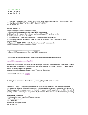 *** SERWIS INFORMACYJNY OLSZTYŃSKIEGO CENTRUM ORGANIZACJI POZARZĄDOWYCH*** *** I FUNDACJI INICJATYWA KOBIET AKTYWNYCH FIKA*** *** NR 29/2011*** Olsztyn, 15.12.2011 ================================= 1. Donosiciel Pozarządowy nr 41 grudzień 2011 do pobrania 2. Olsztyńska Kawiarenka Obywatelska - „Miasto, jako polis?" – zmiana terminu 3. Profesjonalne doradztwo dla NGO 4. Fundacja FIKA – „Mam prawo do prawa” - Porady prawne i obywatelskie 5. Centrum Wspierania Aktywności Lokalnej - zeszyty “Animacja Życia Publicznego. Analizy i rekomendacje” 6. Ogłoszenia OCOP - PTTK - Koło Rodzinne "Laurencja" - zaproszenia ================================= -----------------------------------------------------------------1. Donosiciel Pozarządowy nr 41 grudzień 2011 do pobrania -----------------------------------------------------------------Zapraszamy do pobrania wersji pdf nowego wydania Donosiciela Pozarządowego donosiciel_pozarzadowy_nr_41.pdf >> Donosiciel Pozarządowy jest biuletynem wydawanym obecnie w ramach projektu Olsztyńskie Centrum Organizacji Pozarządowych - dofinansowanego przez Gminę Olsztyn oraz projektu "COPy Warmii i Mazur" dofinansowanego przez EFS. Jego wydawcą jest Związek Stowarzyszeń "Razem w Olsztynie". Archiwum DP znajduje się tutaj >> --------------------------------------------------------------------2. Olsztyńska Kawiarenka Obywatelska - „Miasto, jako polis?" – zmiana terminu --------------------------------------------------------------------W związku z dużym zainteresowaniem dotyczącym spotkania w ramach Olsztyńskiej Kawiarenki Obywatelskiej „Miasto – jako polis” pragniemy poinformować o zmianie terminu na bardziej dogodny. Spotkanie początkowo zaplanowane na 16.12.2011 (piątek) zostało przeniesione na dzień 18.01.2012 (środa). Godzina rozpoczęcia i miejsce nie uległy zmianie. Przepraszamy za utrudnienia i zapraszamy! Dodatkowe informacje: Olsztyńskie Centrum Organizacji Pozarządowych ul. Tarasa Szewczenki 1 10-274 Olsztyn [email protected] tel. 503 680 500 Współorganizatorzy: Związek Stowarzyszeń "Razem w Olsztynie" prowadzący Olsztyńskie Centrum Organizacji Pozarządowych Forum Dialogu Publicznego Spotkanie jest współorganizowane w ramach projektu „COPy Warmii i Mazur. Sieć Centrów Organizacji Pozarządowych Województwa Warmińsko-Mazurskiego” przez Związek Stowarzyszeń „Razem w Olsztynie”. Zobacz więcej >> --------------------------------------------------------------------3. Profesjonalne doradztwo dla NGO --------------------------------------------------------------------Zapraszamy do korzystania z bezpłatnego profesjonalnego doradztwa dla organizacji pozarządowych: Kontakt: [email protected] Tel. 512558349 Osoby zajmujące się w organizacji sprawami księgowymi i finansowymi zapraszamy do skorzystania z bezpłatnego doradztwa w Olsztyńskim Centrum Organizacji Pozarządowych we wtorki g.17.00-19.00. Miejsce: Olsztyńskie Centrum Organizacji Pozarządowych, ul. Tarasa Szewczenki 1, 10-274 Olsztyn mapa >> Doradztwo jest organizowane w ramach projektu „Olsztyńskie Centrum Organizacji Pozarządowych" dofinansowanego przez Gminę Olsztyn. Partnerzy projektu: Związek Stowarzyszeń „Razem w Olsztynie” Fundacja "Inicjatywa Kobiet Aktywnych" FIKA --------------------------------------------------------------------4. Fundacja FIKA - "Mam prawo do prawa" - Porady prawne i obywatelskie --------------------------------------------------------------------W ramach projektu "Mam prawo do prawa" realizowanego przez Fundację FIKA prowadzone są bezpłatne porady prawne i obywatelskie, spotkania z doradcami i ekspertami. W trakcie porad istnieje możliwość uzyskania pomocy przy sporządzaniu min. pism, odwołań, wniosków, powództw, itp. Prowadzone jest również doradztwo prawne dla przedstawicieli NGO. Zapraszamy do Punktu Konsultacyjnego Projektu przy ul. Tarasa Szewczenki 1, 10-274 Olsztyn mapa >> Dyżury ekspertów i doradców - środy 11.00-14.00 - piątki 11.00-14.00 Pytania dotyczące aspektów prawnych powstawania i funkcjonowania organizacji pozarządowych prosimy przesyłać drogą elektroniczną: [email protected] Projekt „Mam prawo do prawa” jest współfinansowany przez Unię Europejską ze środków Europejskiego Funduszu Społecznego w ramach Programu Operacyjnego Kapitał Ludzki, Priorytet V, Działanie 5.4 Rozwój potencjału trzeciego sektora, Podziałanie 5.4.2 Rozwój dialogu obywatelskiego. --------------------------------------------------------------------5. Centrum Wspierania Aktywności Lokalnej - zeszyty “Animacja Życia Publicznego. Analizy i rekomendacje” --------------------------------------------------------------------Centrum Wspierania Aktywności Lokalnej CAL jest wydawcą zeszytów “Animacja Życia Publicznego. Analizy i rekomendacje". Tematem wiodącym piątego już numeru zeszytów są badania w działaniu. Nikt nie kwestionuje potrzeby badania społeczności lokalnych, ale jak to robić? Co właściwie badać? Czy można to zrobić nie będąc socjologiem, zawodowym badaczem? Zobacz więcej >> Źródło: www.cal.org.pl/nowy-numer-animacji-zycia-publicznego --------------------------------------------------------------------6. Ogłoszenia OCOP - PTTK - Koło Rodzinne "Laurencja" - zaproszenia --------------------------------------------------------------------Koło Rodzinne "Laurencja" zaprasza w dniu 16.12.2011 na wieczorny rajd z cyklu "Laurencja by night". Zobacz więcej >>, natomiast w dniu 18.12.2011 na Świąteczny Rajd Bożonarodzeniowy z cyklu "Zdobywamy siedmiomilowe buty". Zobacz więcej >> ==================================== Serwis Informacyjny OCOP i Fundacji Inicjatywa Kobiet Aktywnych FIKA Redaguje: Ewa Komaiszko-Goerick, [email protected] Jesteśmy otwarci na wszelkie sugestie i pomysły. Zapraszamy do współtworzenia biuletynu i udziału w naszych przedsięwzięciach. Serwis www: ocop.olsztyn.pl Tel: +48 503 68 05 00 Związek St