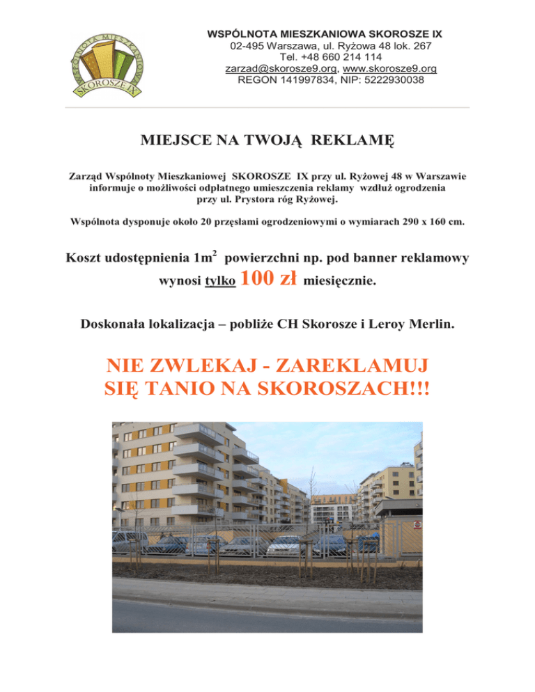 WSPÓLNOTA MIESZKANIOWA SKOROSZE IX 02-495 Warszawa, ul. RyŜowa 48 lok. 267 Tel. +48 660 214 114 [email protected], www.skorosze9.org REGON 141997834, NIP: 5222930038 ___________________________________________________________________________ MIEJSCE NA TWOJĄ REKLAMĘ Zarząd Wspólnoty Mieszkaniowej SKOROSZE IX przy ul. RyŜowej 48 w Warszawie informuje o moŜliwości odpłatnego umieszczenia reklamy wzdłuŜ ogrodzenia przy ul. Prystora róg RyŜowej. Wspólnota dysponuje około 20 przęsłami ogrodzeniowymi o wymiarach 290 x 160 cm. Koszt udostępnienia 1m2 powierzchni np. pod banner reklamowy wynosi tylko 100 zł miesięcznie. Doskonała lokalizacja – pobliŜe CH Skorosze i Leroy Merlin. NIE ZWLEKAJ - ZAREKLAMUJ SIĘ TANIO NA SKOROSZACH!!!