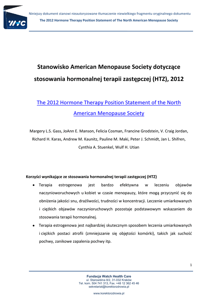 Niniejszy dokument stanowi nieautoryzowane tłumaczenie niewielkiego fragmentu oryginalnego dokumentu The 2012 Hormone Therapy Position Statement of The North American Menopause Society Stanowisko American Menopause Society dotyczące stosowania hormonalnej terapii zastępczej (HTZ), 2012 The 2012 Hormone Therapy Position Statement of the North American Menopause Society Margery L.S. Gass, JoAnn E. Manson, Felicia Cosman, Francine Grodstein, V. Craig Jordan, Richard H. Karas, Andrew M. Kaunitz, Pauline M. Maki, Peter J. Schmidt, Jan L. Shifren, Cynthia A. Stuenkel, Wulf H. Utian Korzyści wynikające ze stosowania hormonalnej terapii zastępczej (HTZ) Terapia estrogenowa jest bardzo efektywna w leczeniu objawów naczynioworuchowych u kobiet w czasie menopauzy, które mogą przyczynić się do obniżenia jakości snu, drażliwości, trudności w koncentracji. Leczenie umiarkowanych i ciężkich objawów naczynioruchowych pozostaje podstawowym wskazaniem do stosowania terapii hormonalnej. Terapia estrogenowa jest najbardziej skutecznym sposobem leczenia umiarkowanych i ciężkich postaci atrofii (zmniejszanie się objętości komórki), takich jak suchość pochwy, zanikowe zapalenia pochwy itp. 1 Fundacja Watch Health Care ul. Starowiślna 8/2, 31-032 Kraków Tel. kom. 504 741 313, Fax. +48 12 362 45 46 [email protected] www.korektorzdrowia.pl Niniejszy dokument stanowi nieautoryzowane tłumaczenie niewielkiego fragmentu oryginalnego dokumentu The 2012 Hormone Therapy Position Statement of The North American Menopause Society Terapia hormonalna wpływa na polepszenie funkcji seksualnych poprzez sprawniejszy przepływ krwi w komórkach pochwy, tym samym wpływając na dłuższe utrzymanie aktywności seksualnej. Terapia hormonalna może zmniejszyć ryzyko wystąpienia złamań związanych z osteoporozą (złamania biodra, kręgosłupa). Terapia hormonalna może przyczynić się do zmniejszenia ryzyka wystąpienia chorób sercowo-naczyniowych (choroba zakrzepowo-zatorowa, udary itp.) Terapia hormonalna zmniejsza ryzyko rozwoju cukrzycy typu 2. Stosowanie hormonalnej terapii zastępczej może przyczynić się do: zwiększenia ryzyka wystąpienia raka endometrium; do zwiększenia ryzyka rozwoju raka piersi; długoletnie stosowanie terapii hormonalnej zastępczej może przyczynić się do rozwoju raka jajnika. Kluczowe rekomendacje: Indywidualizacja ma kluczowe znaczenie dla decyzji o zastosowaniu terapii hormonalnej i powinna uwzględniać stan zdrowia kobiety, jakość życia, priorytety, jak również indywidualne czynniki ryzyka, takie jak ryzyko zakrzepicy żylnej, choroby wieńcowej, udaru mózgu i raka piersi. Zalecenia dotyczące czasu trwania leczenia różnią się w zależności od tego czy mamy do czynienia z estrogenowo-progestagenową terapią (EPT) czy z estrogenową terapią (ET). Czas leczenia jest także ograniczony ze względu na zwiększone ryzyko zachorowania na raka piersi. Terapia estrogenowa (ET) jest najbardziej skuteczną metodą leczenia objawów atrofii sromu i pochwy. 2 Fundacja Watch Health Care ul. Starowiślna 8/2, 31-032 Kraków Tel. kom. 504 741 313, Fax. +48 12 362 45 46 [email protected] www.korektorzdrowia.pl Niniejszy dokument stanowi nieautoryzowane tłumaczenie niewielkiego fragmentu oryginalnego dokumentu The 2012 Hormone Therapy Position Statement of The North American Menopause Society Kobiety z przedwczesną menopauzą mogą korzystać z terapii hormonalnej co najmniej do mediany wieku menopauzy naturalnej (wiek 51 lat). 3 Fundacja Watch Health Care ul. Starowiślna 8/2, 31-032 Kraków Tel. kom. 504 741 313, Fax. +48 12 362 45 46 [email protected] www.korektorzdrowia.pl