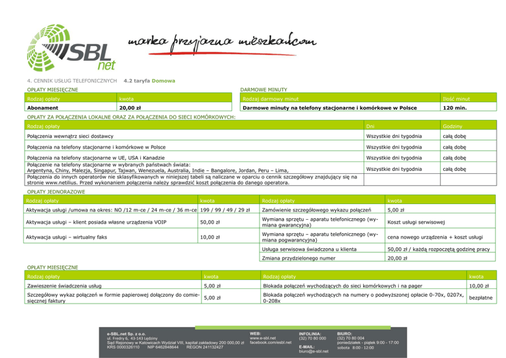 4. CENNIK USŁUG TELEFONICZNYCH 4.2 taryfa Domowa OPŁATY MIESIĘCZNE DARMOWE MINUTY Rodzaj opłaty kwota Rodzaj darmowy minut Ilość minut Abonament 20,00 zł Darmowe minuty na telefony stacjonarne i komórkowe w Polsce 120 min. OPŁATY ZA POŁĄCZENIA LOKALNE ORAZ ZA POŁĄCZENIA DO SIECI KOMÓRKOWYCH: Rodzaj opłaty Dni Godziny Połączenia wewnątrz sieci dostawcy Wszystkie dni tygodnia całą dobę Połączenia na telefony stacjonarne i komórkowe w Polsce Wszystkie dni tygodnia całą dobę Połączenia na telefony stacjonarne w UE, USA i Kanadzie Połączenie na telefony stacjonarne w wybranych państwach świata: Argentyna, Chiny, Malezja, Singapur, Tajwan, Wenezuela, Australia, Indie – Bangalore, Jordan, Peru – Lima, Połączenia do innych operatorów nie sklasyfikowanych w niniejszej tabeli są naliczane w oparciu o cennik szczegółowy znajdujący się na stronie www.netilius. Przed wykonaniem połączenia należy sprawdzić koszt połączenia do danego operatora. Wszystkie dni tygodnia całą dobę Wszystkie dni tygodnia całą dobę OPŁATY JEDNORAZOWE Rodzaj opłaty kwota Rodzaj opłaty kwota Aktywacja usługi /umowa na okres: NO /12 m-ce / 24 m-ce / 36 m-ce 199 / 99 / 49 / 29 zł Zamówienie szczegółowego wykazu połączeń 5,00 zł Aktywacja usługi – klient posiada własne urządzenia VOIP 50,00 zł Wymiana sprzętu – aparatu telefonicznego (wymiana gwarancyjna) Koszt usługi serwisowej Aktywacja usługi – wirtualny faks 10,00 zł Wymiana sprzętu – aparatu telefonicznego (wymiana pogwarancyjna) cena nowego urządzenia + koszt usługi Usługa serwisowa świadczona u klienta 50,00 zł / każdą rozpoczętą godzinę pracy Zmiana przydzielonego numer 20,00 zł OPŁATY MIESIĘCZNE Rodzaj opłaty kwota Rodzaj opłaty kwota Zawieszenie świadczenia usług 5,00 zł Blokada połączeń wychodzących do sieci komórkowych i na pager 10,00 zł Blokada połączeń wychodzących na numery o podwyższonej opłacie 0-70x, 0207x, 0-208x bezpłatne Szczegółowy wykaz połączeń w formie papierowej dołączony do comie5,00 zł sięcznej faktury