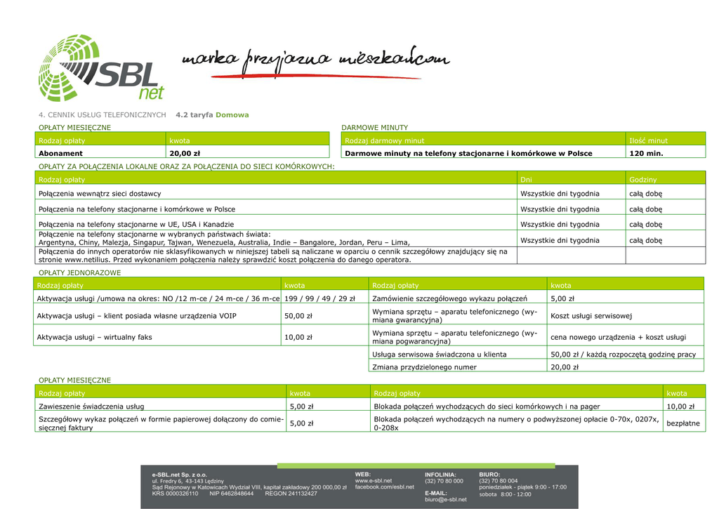 4. CENNIK USŁUG TELEFONICZNYCH 4.2 taryfa Domowa OPŁATY