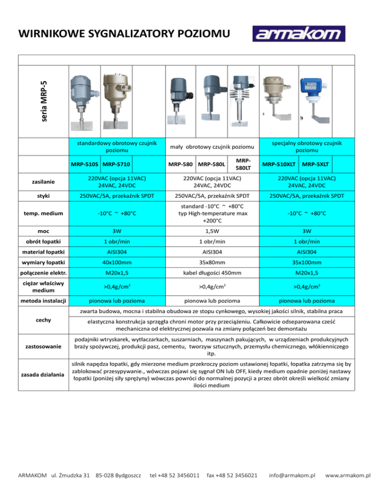 seria MRP-5 WIRNIKOWE SYGNALIZATORY POZIOMU standardowy obrotowy czujnik poziomu MRP-510S MRP-5710 mały obrotowy czujnik poziomu MRP-580 MRP-580L MRP580LT specjalny obrotowy czujnik poziomu MRP-510XLT MRP-5XLT zasilanie 220VAC (opcja 11VAC) 24VAC, 24VDC 220VAC (opcja 11VAC) 24VAC, 24VDC 220VAC (opcja 11VAC) 24VAC, 24VDC styki 250VAC/5A, przekaźnik SPDT 250VAC/5A, przekaźnik SPDT 250VAC/5A, przekaźnik SPDT temp. medium -10°C ~ +80°C standard -10°C ~ +80°C typ High-temperature max +200°C -10°C ~ +80°C moc 3W 1,5W 3W obrót łopatki 1 obr/min 1 obr/min 1 obr/min materiał łopatki AISI304 AISI304 AISI304 wymiary łopatki 40x100mm 35x80mm 35x100mm połączenie elektr. M20x1,5 kabel długości 450mm M20x1,5 ciężar właściwy medium >0,4g/cm3 >0,4g/cm3 >0,4g/cm3 metoda instalacji pionowa lub pozioma pionowa lub pozioma pionowa lub pozioma zwarta budowa, mocna i stabilna obudowa ze stopu cynkowego, wysokiej jakości silnik, stabilna praca cechy elastyczna konstrukcja sprzęgła chroni motor przy przeciążeniu. Całkowicie odseparowana cześć mechaniczna od elektrycznej pozwala na zmiany połączeń bez demontażu zastosowanie podajniki wtryskarek, wytłaczarkach, suszarniach, maszynach pakujących, w urządzeniach produkcyjnych braży spożywczej, produkcji pasz, cementu, tworzyw sztucznych, przemysłu chemicznego, włókienniczego itp. zasada działania silnik napędza łopatki, gdy mierzone medium przekroczy poziom ustawionej łopatki, łopatka zatrzyma się by zablokować przesypywanie., wówczas pojawi się sygnał ON lub OFF, kiedy medium opadnie poniżej nastawy łopatki (poniżej siły sprężyny) wówczas powróci do normalnej pozycji a przez obrót określi wielkość zmiany ilości medium ARMAKOM ul. Żmudzka 31 85-028 Bydgoszcz tel +48 52 3456011 fax +48 52 3456021 [email protected] www.armakom.pl