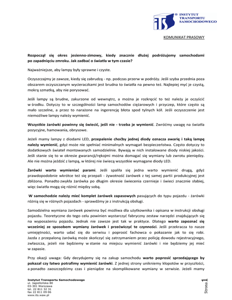 KOMUNIKAT PRASOWY Rozpoczął się okres jesienno-zimowy, kiedy znacznie dłużej podróżujemy samochodami po zapadnięciu zmroku. Jak zadbać o światła w tym czasie? Najważniejsze, aby lampy były sprawne i czyste. Oczyszczajmy je zawsze, kiedy się zabrudzą - np. podczas przerw w podróży. Jeśli szyba przednia poza obszarem oczyszczanym wycieraczkami jest brudna to światła na pewno też. Najlepiej myć je czystą, mokrą szmatką, aby nie porysować. Jeśli lampy są brudne, zakurzone od wewnątrz, a można je rozkręcić to też należy je oczyścić w środku. Dotyczy to w szczególności lamp samochodów ciężarowych i przyczep, które często są mało szczelne, a przez to narażone na ingerencję błota spod tylnych kół. Jeśli oczyszczenie jest niemożliwe lampy należy wymienić. Wszystkie żarówki powinny się świecić, jeśli nie - trzeba je wymienić. Zwróćmy uwagę na światła pozycyjne, hamowania, obrysowe. Jeżeli mamy lampy z diodami LED, przepalenie choćby jednej diody oznacza awarię i taką lampę należy wymienić, gdyż może nie spełniać minimalnych wymagań bezpieczeństwa. Często dotyczy to dodatkowych świateł montowanych samodzielnie. Bywają w nich instalowane diody niskiej jakości. Jeśli stanie się to w okresie gwarancji/rękojmi można domagać się wymiany lub zwrotu pieniędzy. Ale nie można jeździć z lampą, w której nie świecą wszystkie wymagane diody LED. Żarówki warto wymieniać parami. Jeśli spaliła się jedna warto wymienić drugą, gdyż prawdopodobnie wkrótce też się przepali - żywotność żarówek z tej samej partii produkcyjnej jest zbliżona. Ponadto zwykła żarówka po długim okresie świecenia czernieje i świeci znacznie słabiej, więc światła mogą się różnić między sobą. W samochodzie należy mieć komplet żarówek zapasowych pasujących do typu pojazdu - żarówki różnią się w różnych pojazdach - sprawdźmy je z instrukcją obsługi. Samodzielna wymiana żarówek powinna być możliwa dla użytkownika i opisana w instrukcji obsługi pojazdu. Teoretyczne do tego celu powinien wystarczyć fabryczny zestaw narzędzi znajdujących się na wyposażeniu pojazdu. Jednak nie zawsze jest tak w praktyce. Dlatego warto zapoznać się wcześniej ze sposobem wymiany żarówek i przećwiczyć te czynności. Jeśli przekracza to nasze umiejętności, warto udać się do serwisu i poprosić fachowca o pokazanie jak to się robi. Jazda z przepaloną żarówką może skończyć się zatrzymaniem przez policję dowodu rejestracyjnego, zwłaszcza, jeżeli nie będziemy w stanie na miejscu wymienić żarówki i nie będziemy jej mieć w zapasie. Strona Instytut Transportu Samochodowego ul. Jagiellońska 80 03-301 Warszawa tel. 22 811 32 31 fax 22 811 09 06 www.its.waw.pl 1 Przy okazji uwaga: Gdy decydujemy się na zakup samochodu warto poprosić sprzedającego by pokazał czy łatwo potrafimy wymienić żarówki. Z jednej strony unikniemy kłopotów w przyszłości, a ponadto zaoszczędzimy czas i pieniądze na skomplikowane wymiany w serwisie. Jeżeli mamy poważne zastrzeżenia co do możliwości samodzielnej wymiany żarówek w pojeździe przysługuje nam prawo skargi na to czy pojazd spełnia wymagania regulaminu homologacyjnego w tej sprawie. Można taką skargę zgłosić polskiej władzy homologacyjnej (Ministerstwo Infrastruktury). Aby takie zgłoszenie zostało uwzględnione, wymaga się podania szczegółowych informacji, jakie przepisy nie są spełnione i dlaczego. Skutecznie może zrobić to osoba posiadająca wiedzę fachową np. rzeczoznawca motoryzacyjny. Niektóre żarówki dostępne na rynku są niskiej jakości. Sprawdzenie żarówek we własnym zakresie jest praktycznie niemożliwe. Żarówki są standaryzowane, dopasowane do każdego rodzaju lampy i muszą spełniać ściśle określone wymagania techniczne. Nie ma możliwości ich spektakularnego „ulepszenia” jeśli chodzi o właściwości świetlne, ale mogą być bardziej lub mniej dokładnie wykonane. Żarówka powinna mieć wyraźne oznakowanie homologacyjne, a typ (kategoria) i parametry powinny być zgodne z instrukcją obsługi pojazdu. Pomocna może być informacja o wiarygodności producenta żarówki (nie dostawcy). Najwięcej problemów bywa z bardzo tanimi żarówkami i różnymi „wynalazkami” z egzotycznymi opisami na opakowaniu i mnóstwem zachęcających epitetów. Ważne! Niektórzy kierowcy zakładają nielegalne zamienniki żarówek np. ksenonowe, sądząc, że poprawią widoczność na drodze. W rzeczywistości, jeżeli światła po takiej operacji zachowają granicę światła i cienia, i będą ustawione zgodnie z wymaganiami producenta nie zwiększą zasięgu widoczności, bo wynika on z położenia granicy na drodze, a nie od ilości światła wysyłanego na drogę. Jedyny efekt to znacznie intensywniejsze światło blisko pojazdu, które daje tylko złudne poczucie kierowcy, że ma lepsze światła. Poza tym znacznie silniej, nieraz ponad dziesięciokrotnie, takie „zamienniki” oślepiają innych kierowców. Montowanie ich w reflektorach to skrajny brak wyobraźni i wiedzy oraz poważne zagrożenie bezpieczeństwa. Podobnie niewłaściwe jest stosowanie LED-owych „zamienników” żarówek. Natomiast homologowane lampy wyposażone fabrycznie w diody LED mogą być bezpiecznie użytkowane. Bardzo ważna sprawa - ustawienie świateł. Należy je wykonać po każdej wymianie żarówki lub reflektora, po każdej naprawie mechanicznej mogącej mieć wpływ na ustawienie (zawieszenie, naprawy blacharskie po kolizjach) oraz sprawdzać raz w roku. Zdarza się, że świateł nie można prawidłowo ustawić, bo uszkodzone są pokrętła reflektora przeznaczone do regulacji. Wówczas należy je naprawić lub wymienić. Strona Instytut Transportu Samochodowego ul. Jagiellońska 80 03-301 Warszawa tel. 22 811 32 31 fax 22 811 09 06 www.its.waw.pl 2 Oprócz ustawienia początkowego (ustawianego przez diagnost