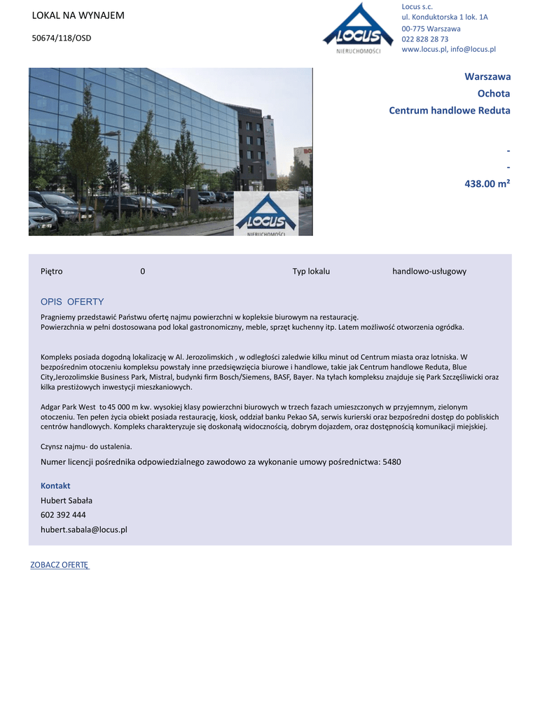 Locus s.c. ul. Konduktorska 1 lok. 1A 00-775 Warszawa 022 828 28 73 www.locus.pl, [email protected] LOKAL NA WYNAJEM 50674/118/OSD Warszawa Ochota Centrum handlowe Reduta 438.00 m² WŝħƚƌŽ 0 Typ lokalu ŚĂŶĚůŽǁŽͲƵƐųƵŐŽǁLJ OPIS OFERTY WƌĂŐŶŝĞŵLJƉƌnjĞĚƐƚĂǁŝđWĂŷƐƚǁƵŽĨĞƌƚħŶĂũŵƵƉŽǁŝĞƌnjĐŚŶŝǁŬŽƉůĞŬƐŝĞďŝƵƌŽǁLJŵŶĂƌĞƐƚĂƵƌĂĐũħ͘ WŽǁŝĞƌnjĐŚŶŝĂǁƉĞųŶŝĚŽƐƚŽƐŽǁĂŶĂƉŽĚůŽŬĂůŐĂƐƚƌŽŶŽŵŝĐnjŶLJ͕ŵĞďůĞ͕ƐƉƌnjħƚŬƵĐŚĞŶŶLJŝƚƉ͘>ĂƚĞŵŵŽǏůŝǁŽƑđŽƚǁŽƌnjĞŶŝĂŽŐƌſĚŬĂ͘ <ŽŵƉůĞŬƐƉŽƐŝĂĚĂĚŽŐŽĚŶČůŽŬĂůŝnjĂĐũħǁů͘:ĞƌŽnjŽůŝŵƐŬŝĐŚ͕ǁŽĚůĞŐųŽƑĐŝnjĂůĞĚǁŝĞŬŝůŬƵŵŝŶƵƚŽĚĞŶƚƌƵŵŵŝĂƐƚĂŽƌĂnjůŽƚŶŝƐŬĂ͘t ďĞnjƉŽƑƌĞĚŶŝŵŽƚŽĐnjĞŶŝƵŬŽŵƉůĞŬƐƵƉŽǁƐƚĂųLJŝŶŶĞƉƌnjĞĚƐŝħǁnjŝħĐŝĂďŝƵƌŽǁĞŝŚĂŶĚůŽǁĞ͕ƚĂŬŝĞũĂŬĞŶƚƌƵŵŚĂŶĚůŽǁĞZĞĚƵƚĂ͕ůƵĞ ŝƚLJ͕:ĞƌŽnjŽůŝŵƐŬŝĞƵƐŝŶĞƐƐWĂƌŬ͕DŝƐƚƌĂů͕ďƵĚLJŶŬŝĨŝƌŵŽƐĐŚͬ^ŝĞŵĞŶƐ͕^&͕ĂLJĞƌ͘EĂƚLJųĂĐŚŬŽŵƉůĞŬƐƵnjŶĂũĚƵũĞƐŝħWĂƌŬ^njĐnjħƑůŝǁŝĐŬŝŽƌĂnj ŬŝůŬĂƉƌĞƐƚŝǏŽǁLJĐŚŝŶǁĞƐƚLJĐũŝŵŝĞƐnjŬĂŶŝŽǁLJĐŚ͘ Adgar Park West to 45 000 m kw. wysokiej klasy powierzchni biurowych w trzech fazach umieszczonych w przyjemnym, zielonym ŽƚŽĐnjĞŶŝƵ͘dĞŶƉĞųĞŶǏLJĐŝĂŽďŝĞŬƚƉŽƐŝĂĚĂƌĞƐƚĂƵƌĂĐũħ͕ŬŝŽƐŬ͕ŽĚĚnjŝĂųďĂŶŬƵWĞŬĂŽ^͕ƐĞƌǁŝƐŬƵƌŝĞƌƐŬŝŽƌĂnjďĞnjƉŽƑƌĞĚŶŝĚŽƐƚħƉĚŽƉŽďůŝƐŬŝĐŚ ĐĞŶƚƌſǁŚĂŶĚůŽǁLJĐŚ͘<ŽŵƉůĞŬƐĐŚĂƌĂŬƚĞƌLJnjƵũĞƐŝħĚŽƐŬŽŶĂųČǁŝĚŽĐnjŶŽƑĐŝČ͕ĚŽďƌLJŵĚŽũĂnjĚĞŵ͕ŽƌĂnjĚŽƐƚħƉŶŽƑĐŝČŬŽŵƵŶŝŬĂĐũŝŵŝĞũƐŬŝĞũ͘ Czynsz najmu- do ustalenia. EƵŵĞƌůŝĐĞŶĐũŝƉŽƑƌĞĚŶŝŬĂŽĚƉŽǁŝĞĚnjŝĂůŶĞŐŽnjĂǁŽĚŽǁŽnjĂǁLJŬŽŶĂŶŝĞƵŵŽǁLJƉŽƑƌĞĚŶŝĐƚǁĂ͗ϱϰϴϬ Kontakt ,ƵďĞƌƚ^ĂďĂųĂ 602 392 444 [email protected] KK&Zd%
